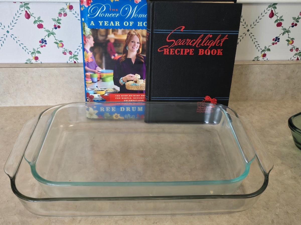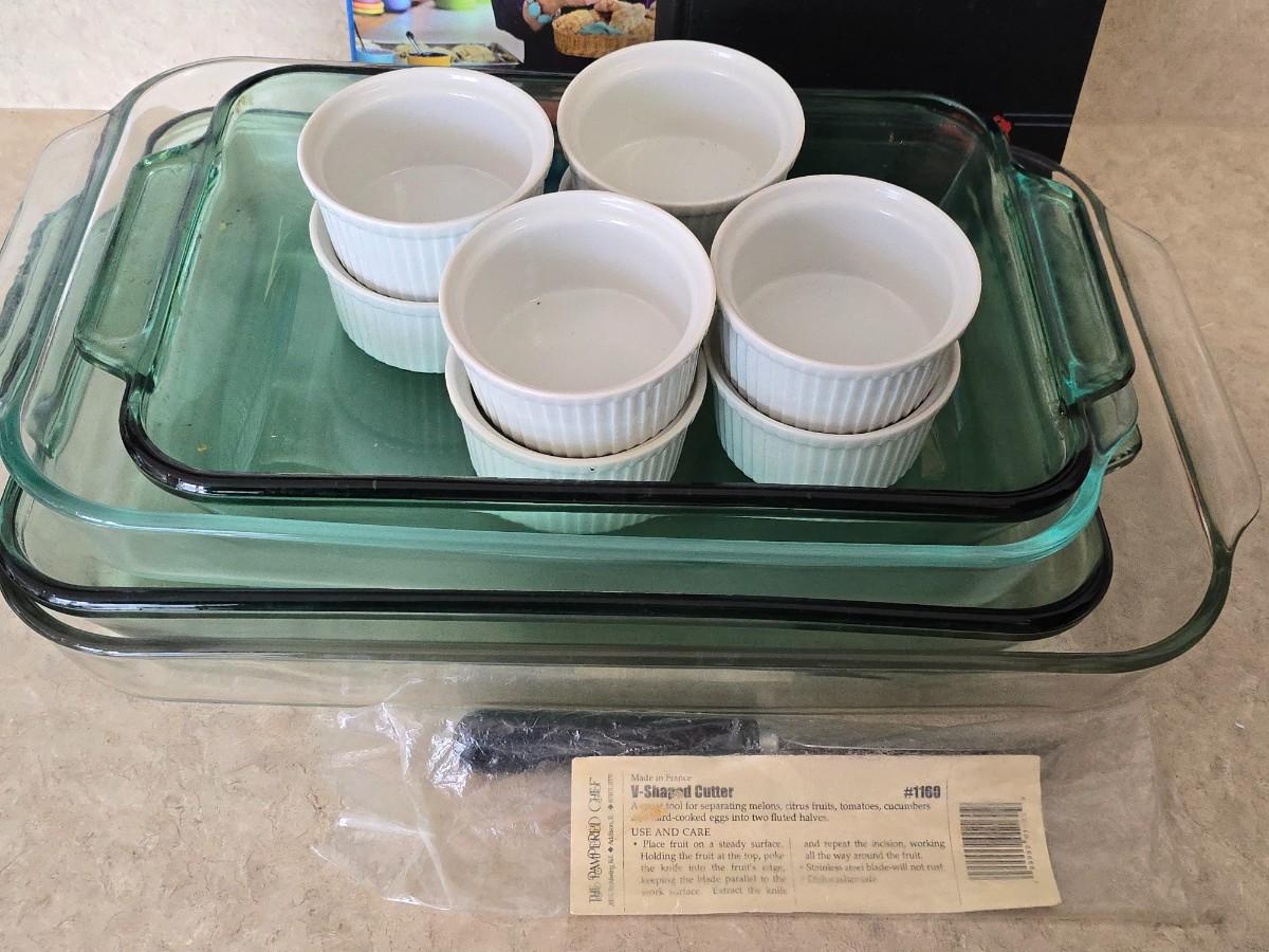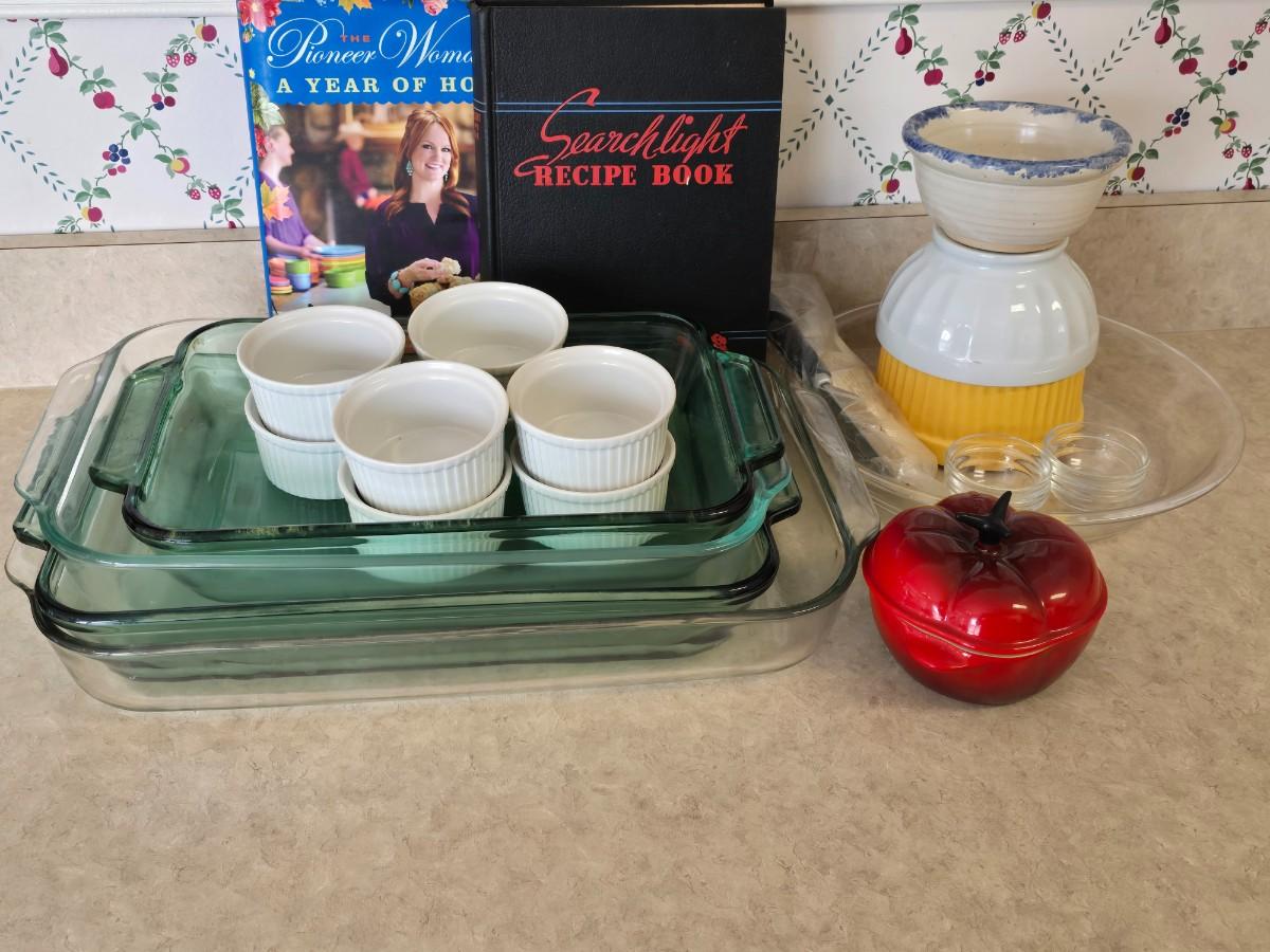 LOT 37: Collection of Home Cooking Items; LeCreuset Tomato Casserole Dish, Pyrex & Anchor Hocking Baking Dishes, Pampered Chef Apple Corer and more