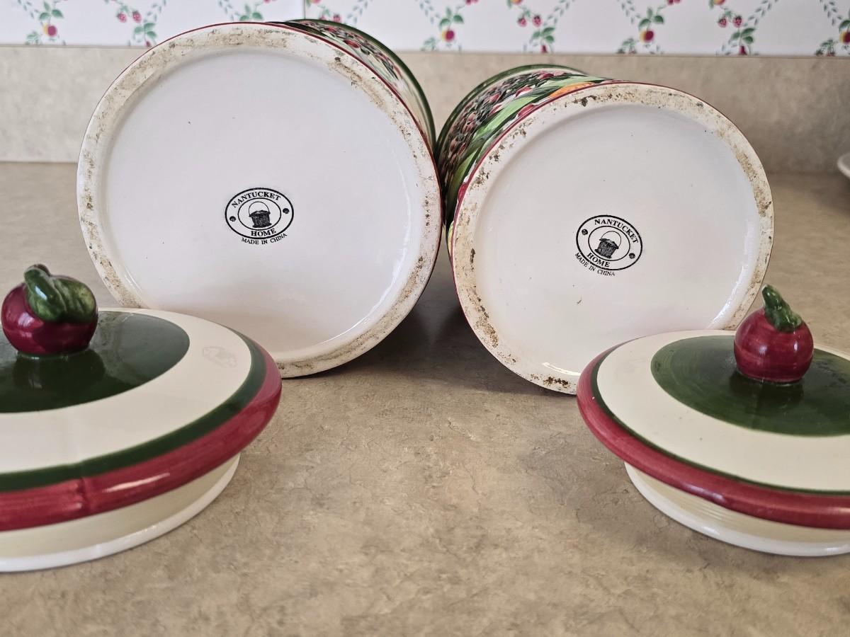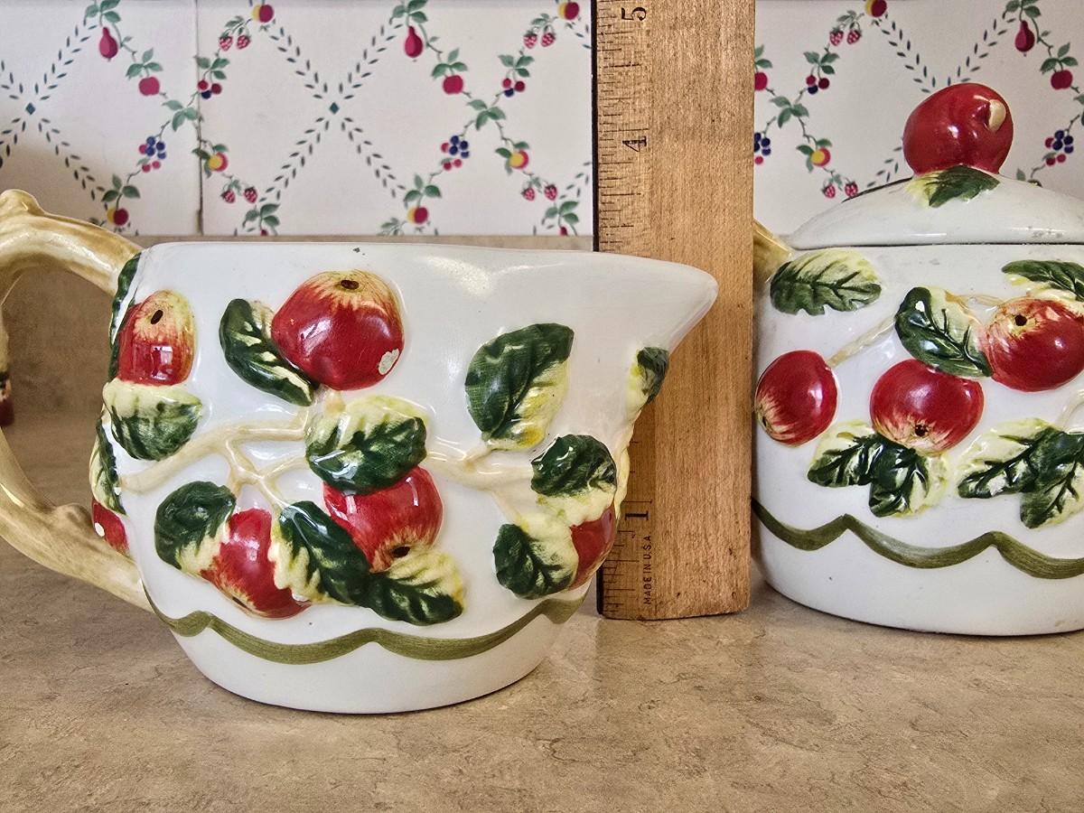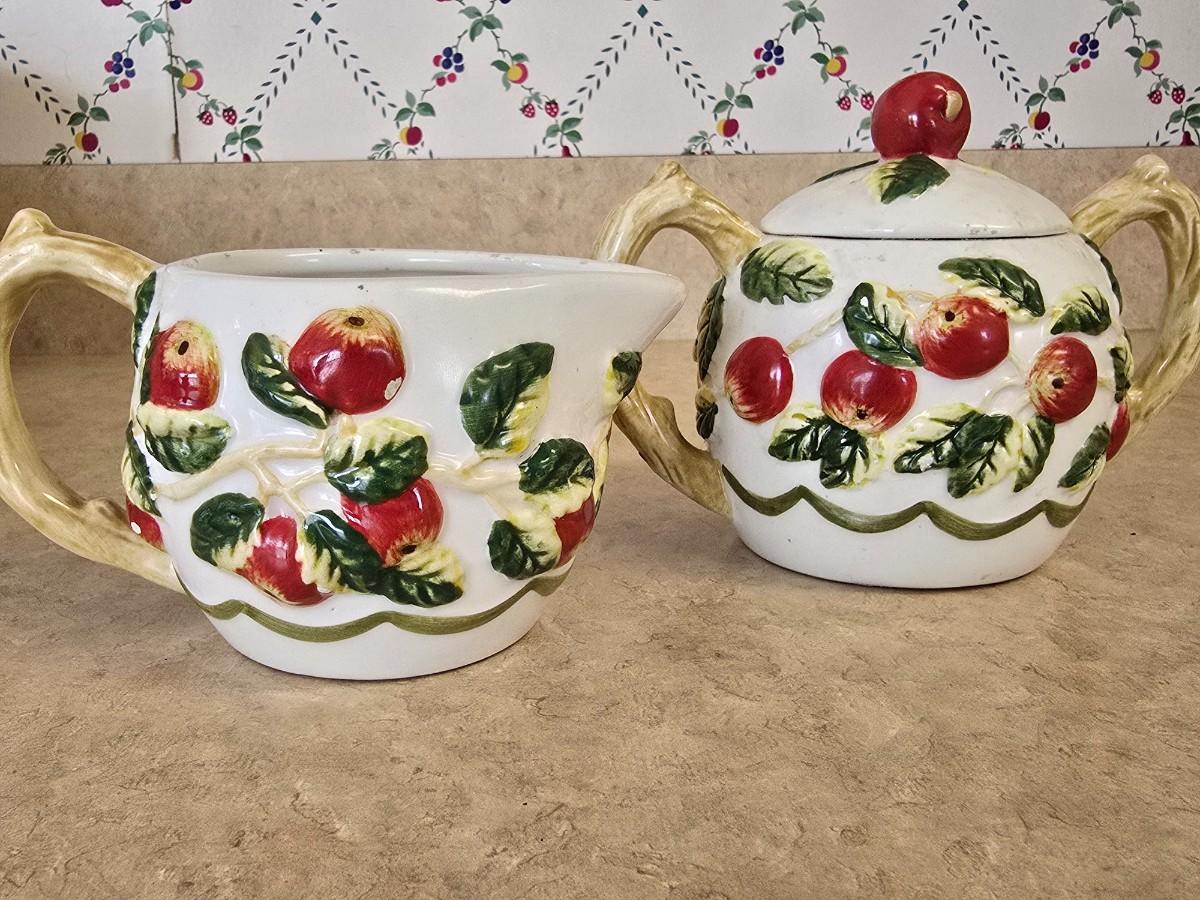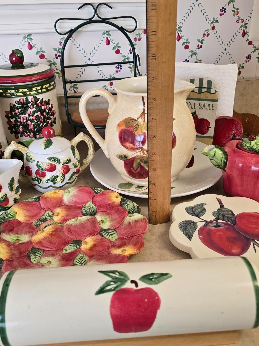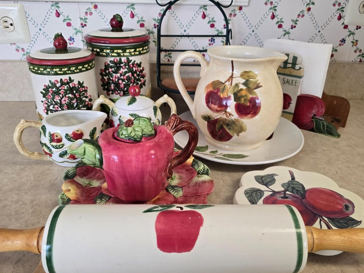 LOT 38: Collection of Apple Patterned Kitchenware; Ceramic Storage Canisters, Creamer & Lidded Sugar Bowl, Apple Teapot & more