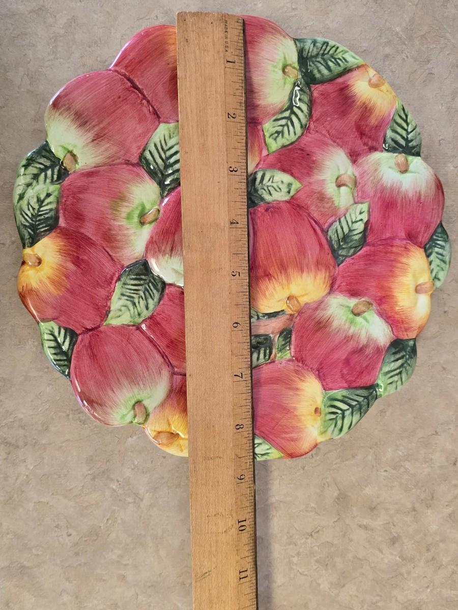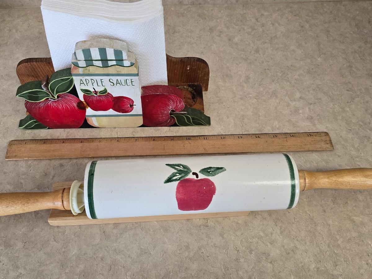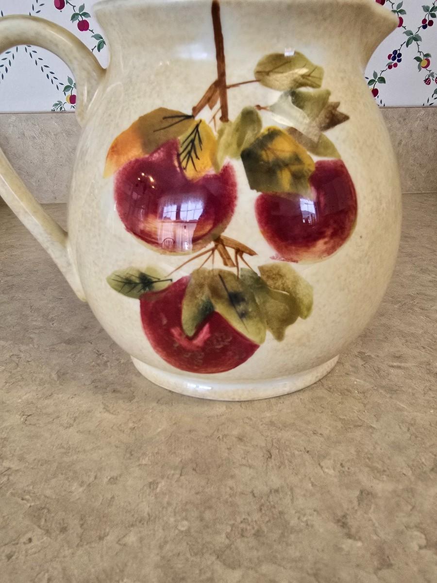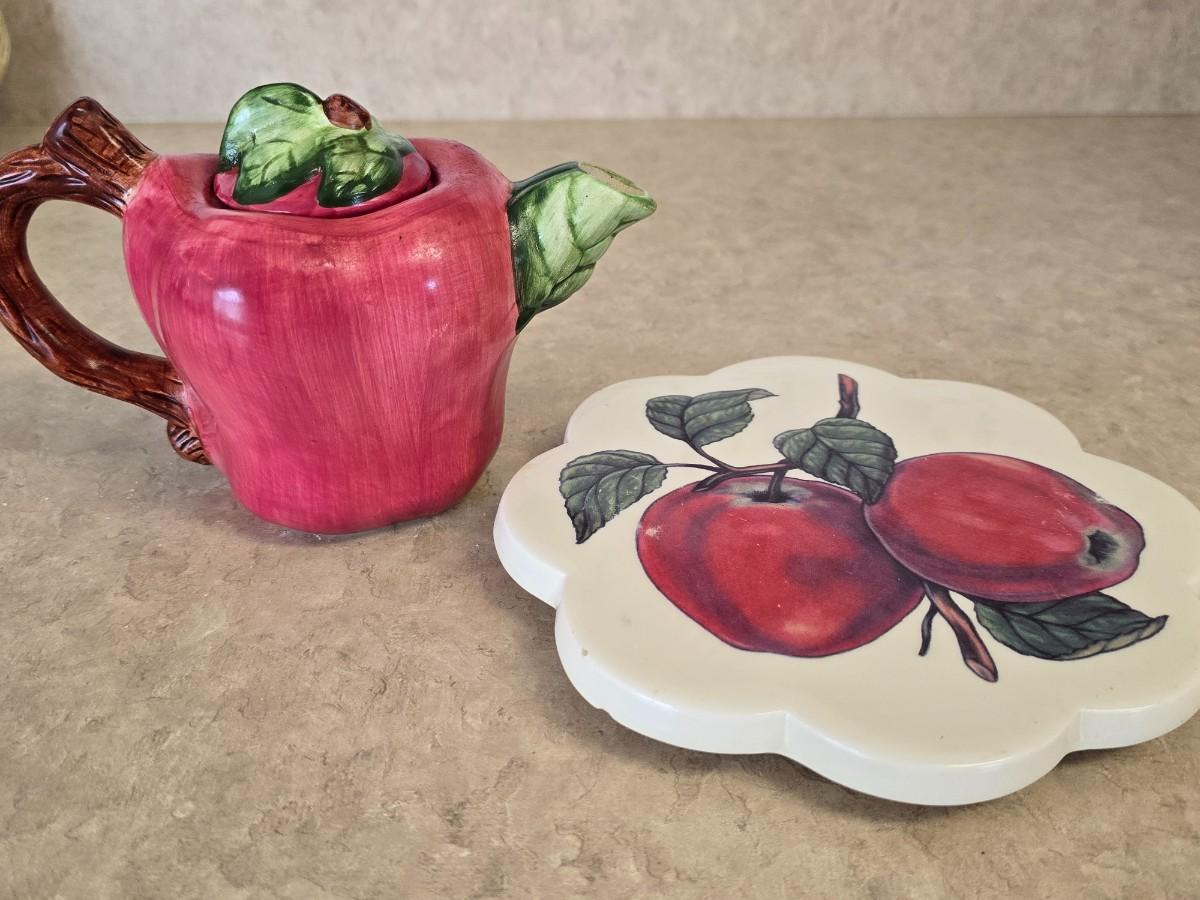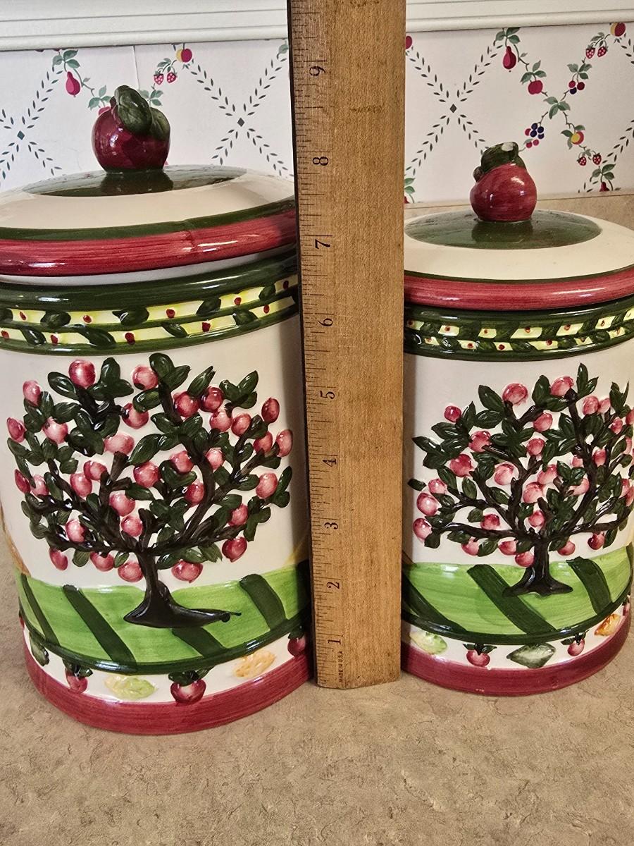 LOT 38: Collection of Apple Patterned Kitchenware; Ceramic Storage Canisters, Creamer & Lidded Sugar Bowl, Apple Teapot & more