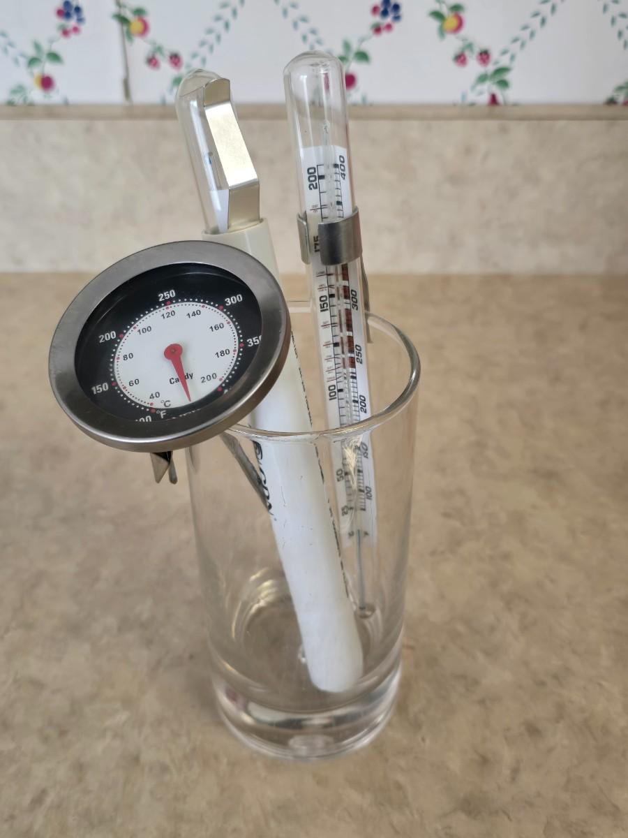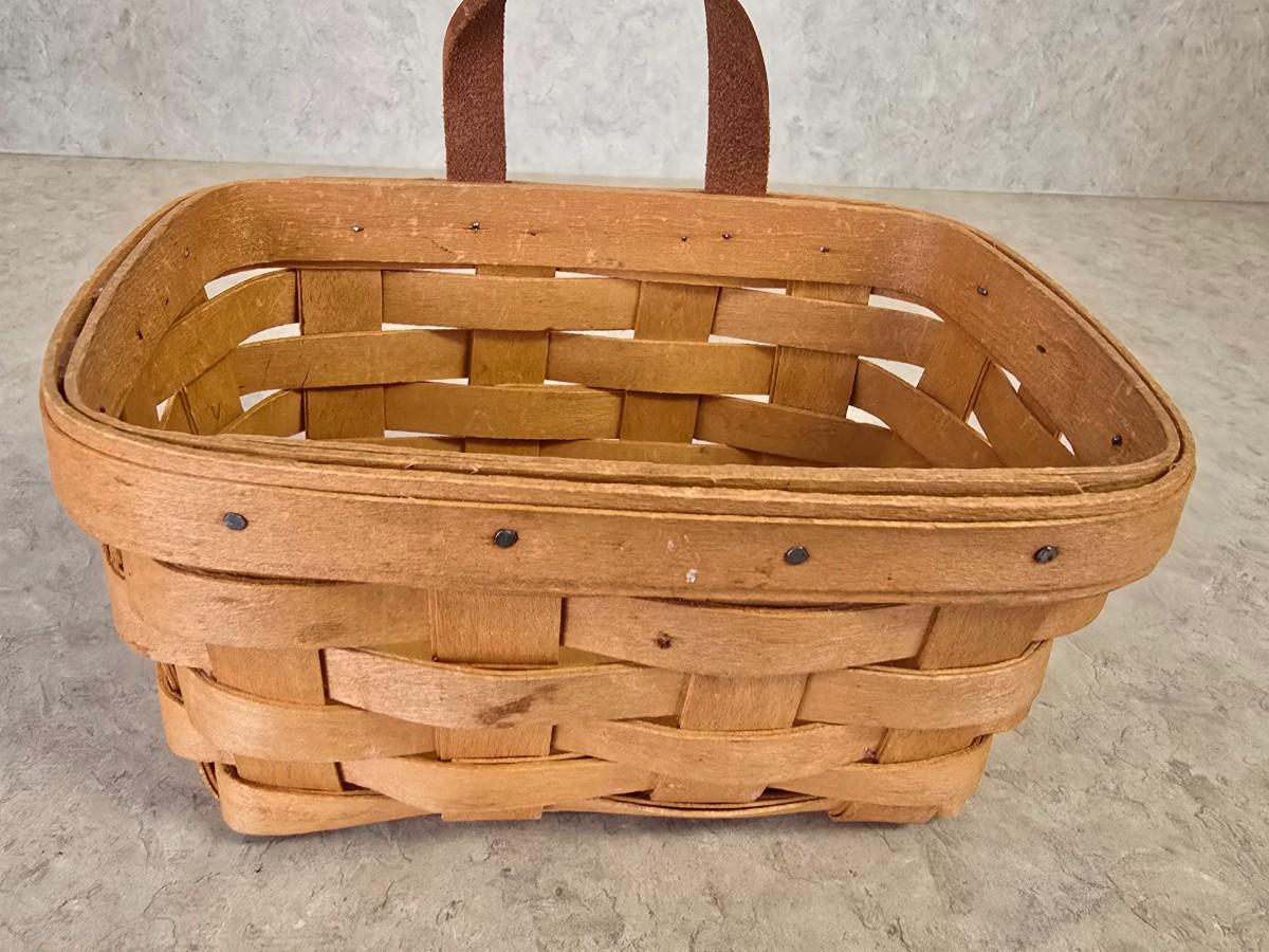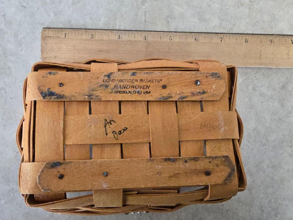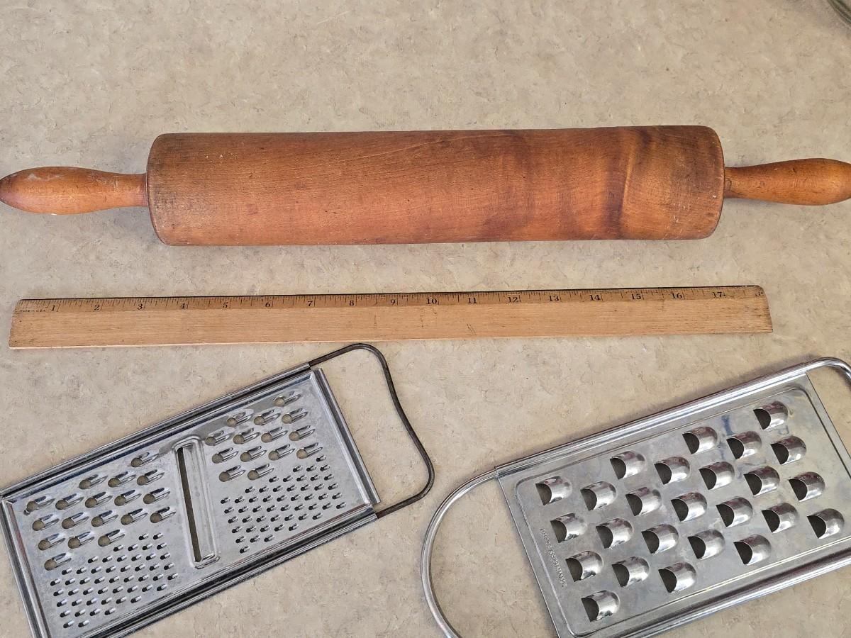 LOT 39: Vintage Kitchen Items; Longaberger Basket, Larkin Scissors, Candy Thermometers, Vintage Fruit Slicer, Glass Storage & more