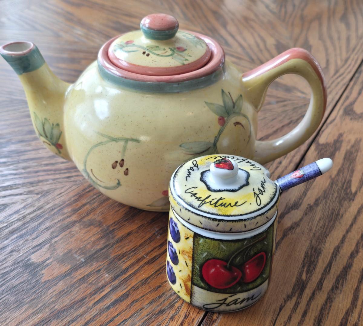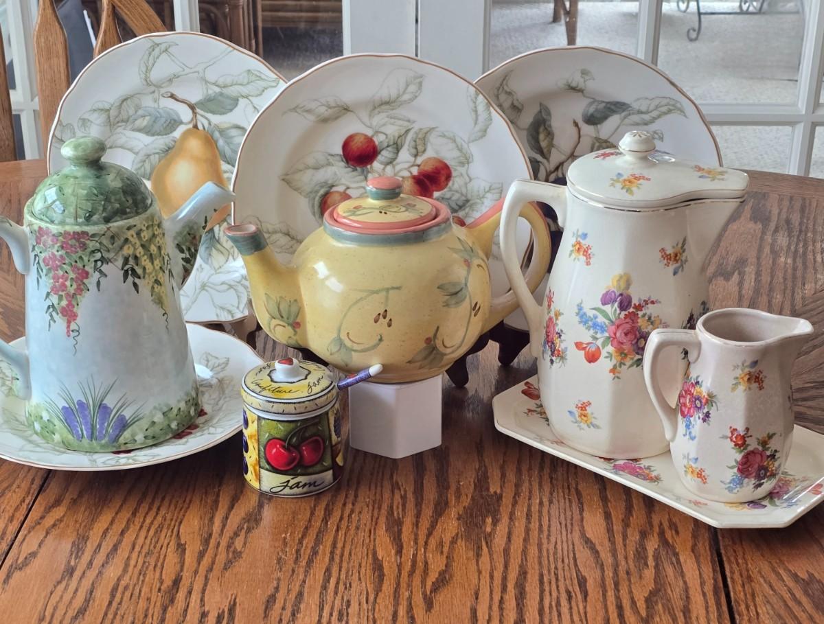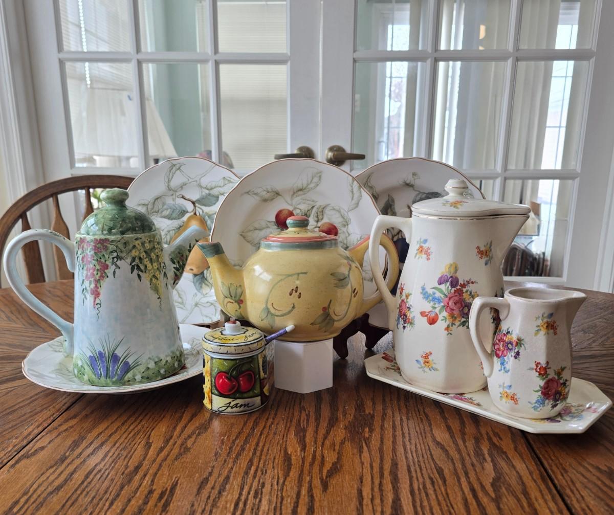 LOT 41: Collection of Ceramic Tea Pots; Charter Club Salad Plates Fruit Motiff & MSC China Joie de Vivre Jam Jar with Lid & Spoon