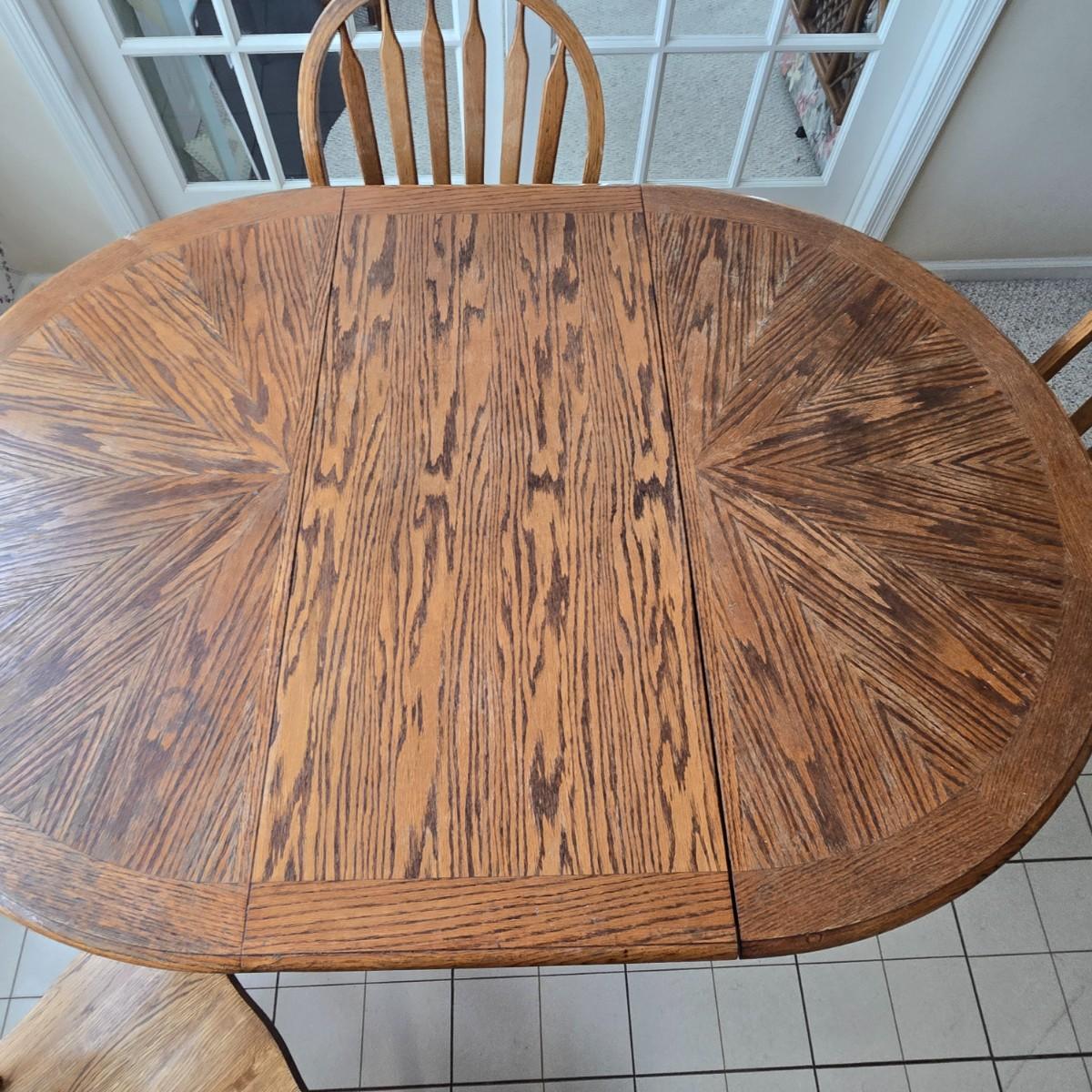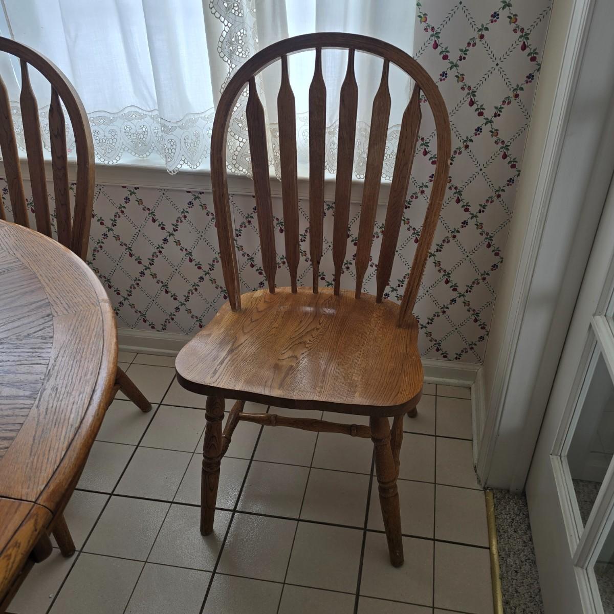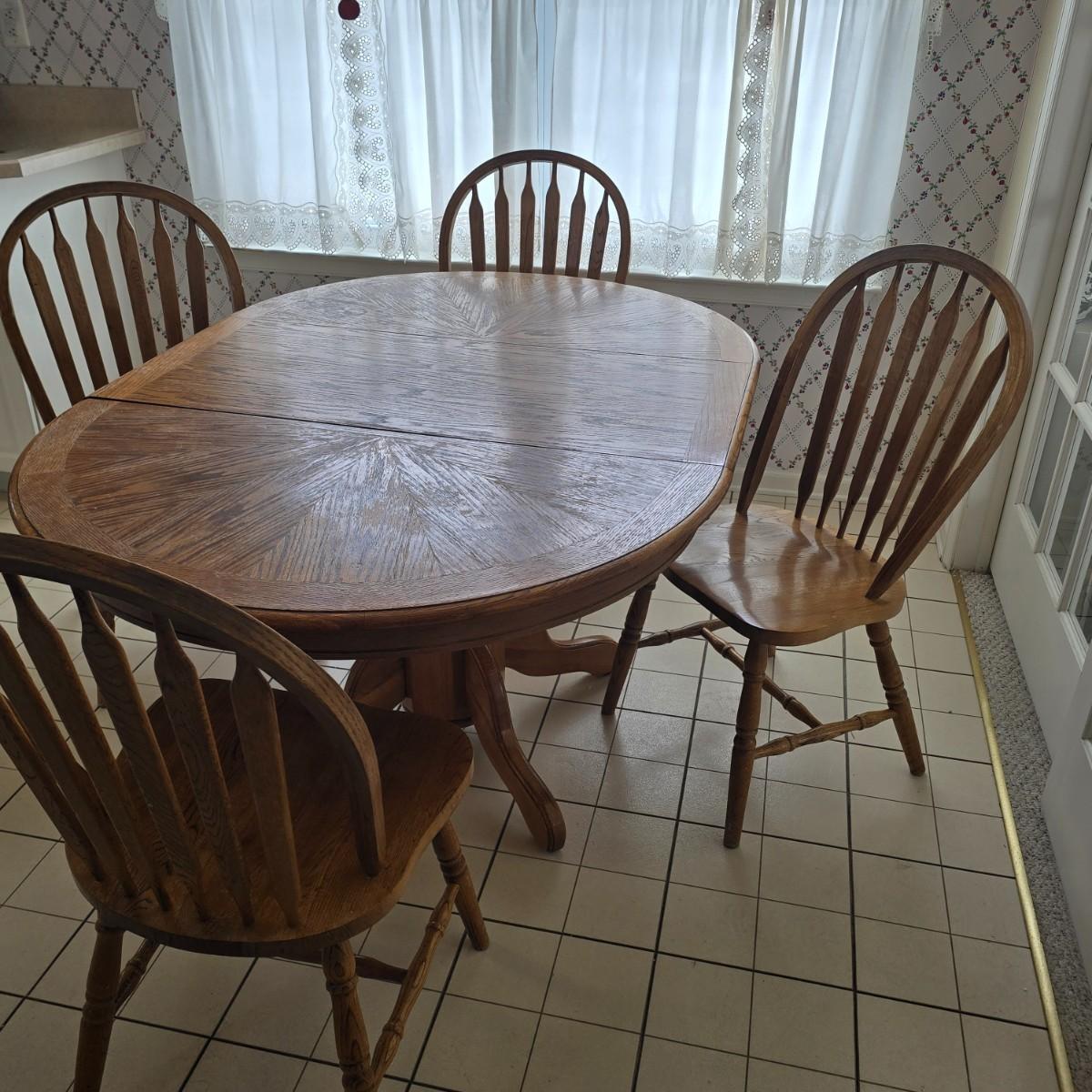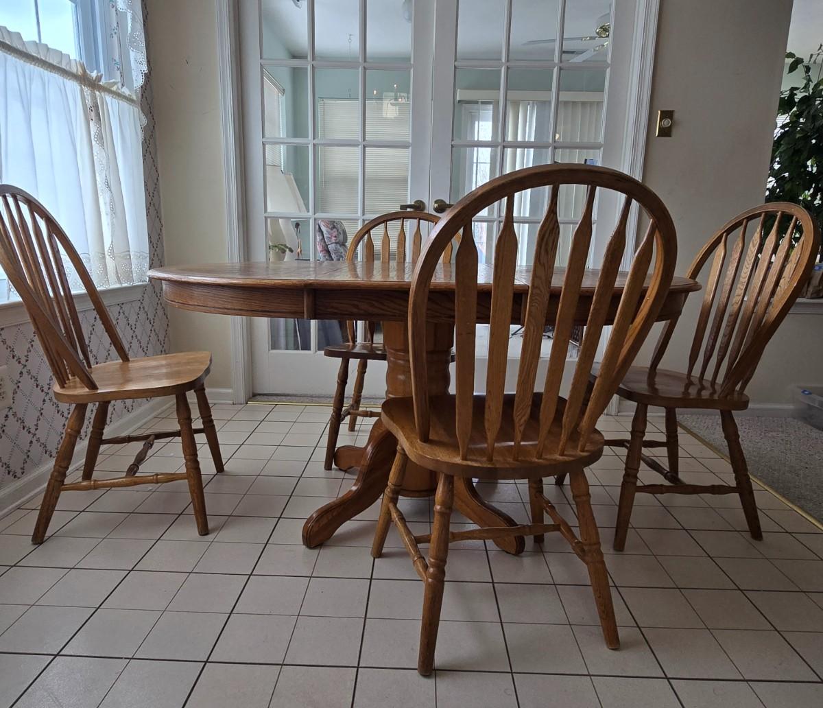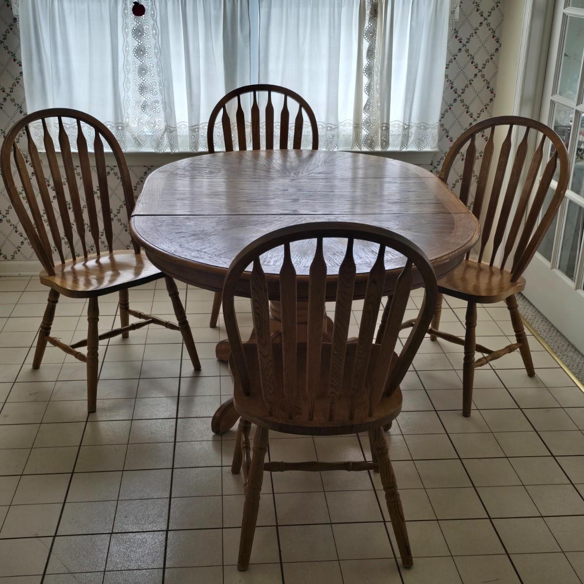 LOT 42: Farmhouse Dining Set Featuring a Pedestal Table w/Extension and 4 Arrow-Back Chairs
