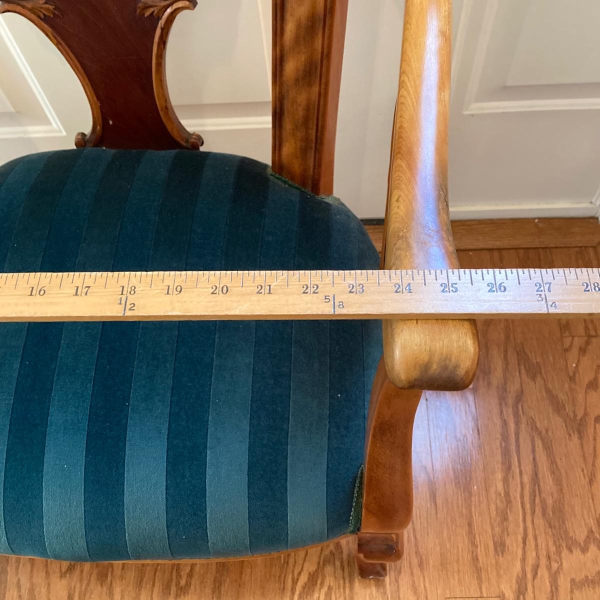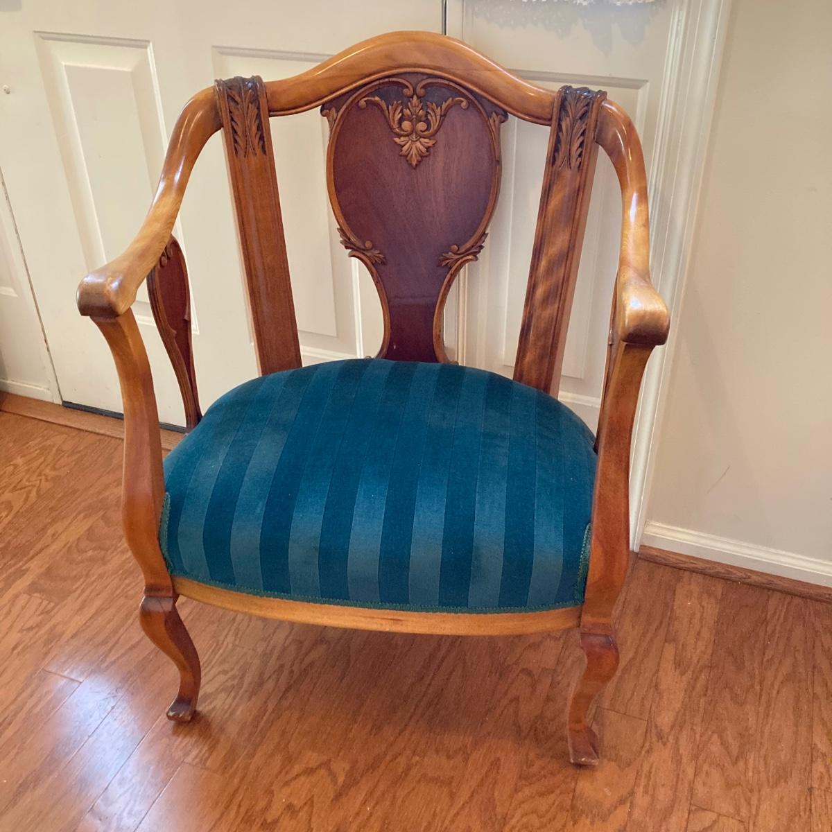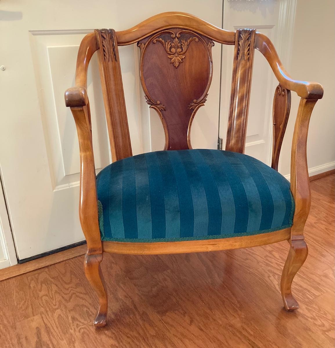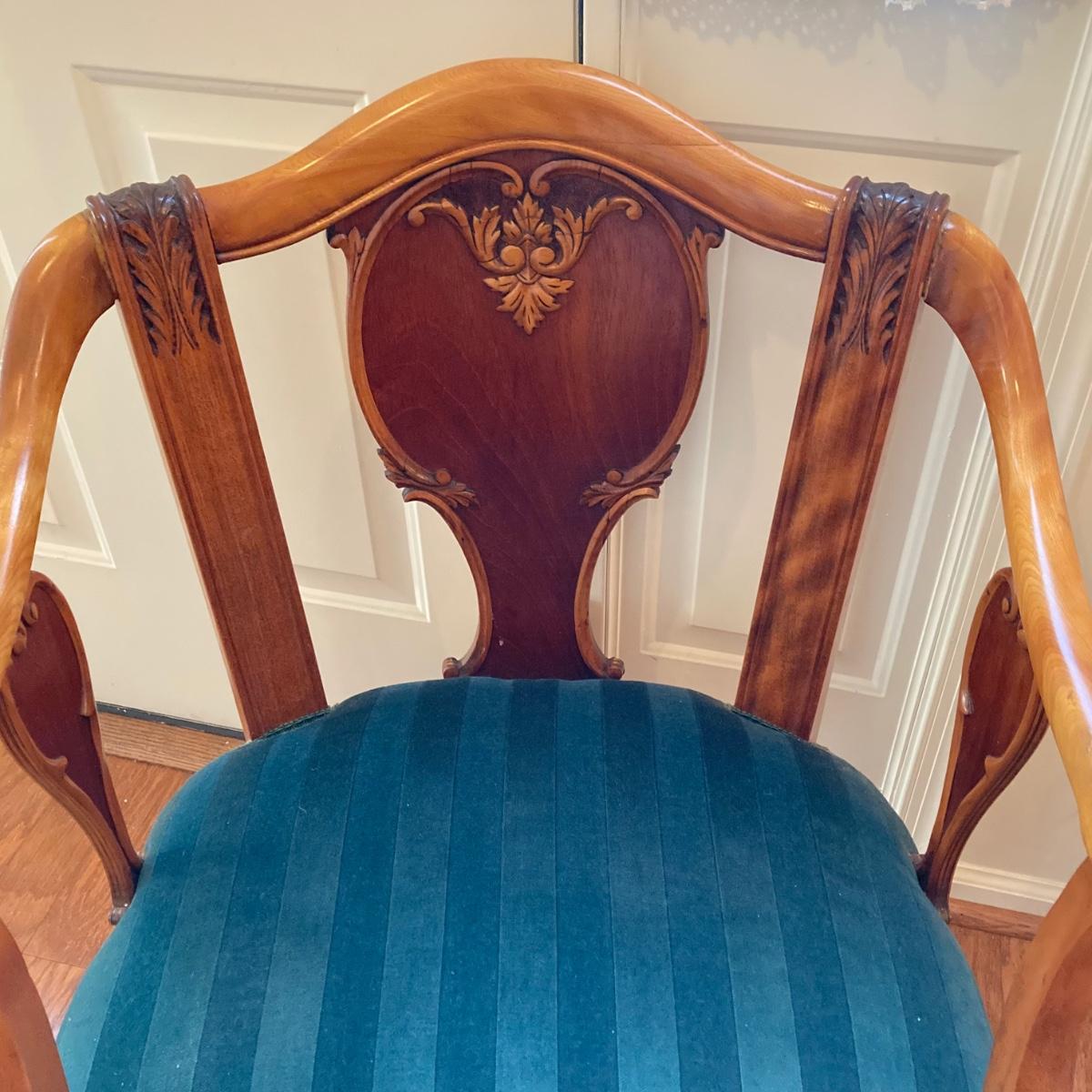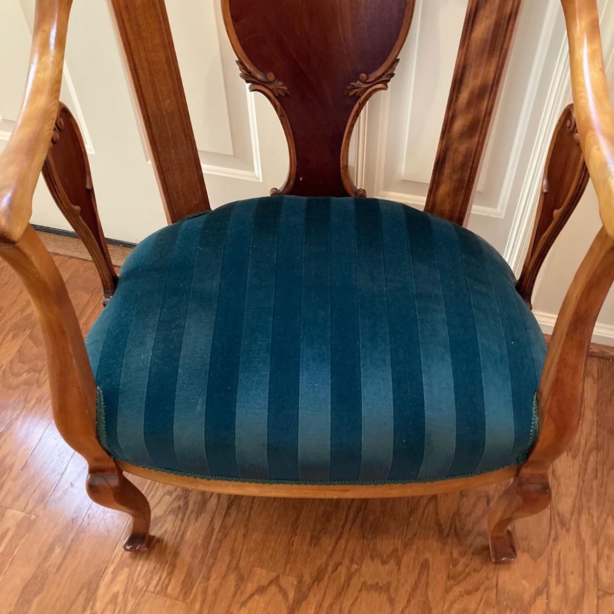 LOT 73: Carved Wood Queen Anne Armchair with Velvet Seating