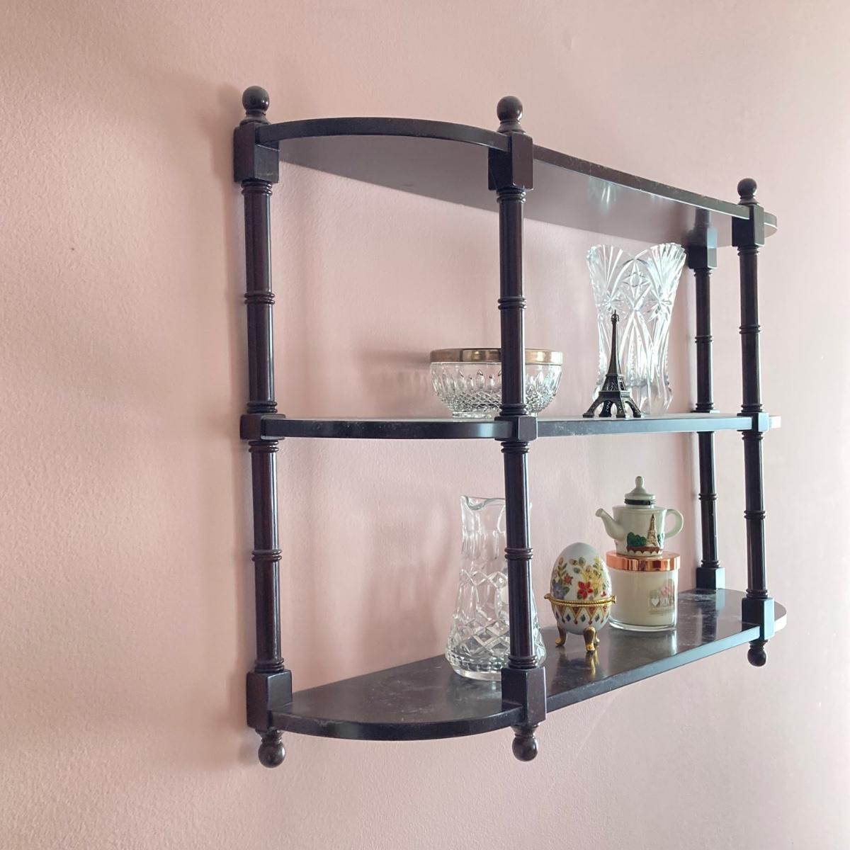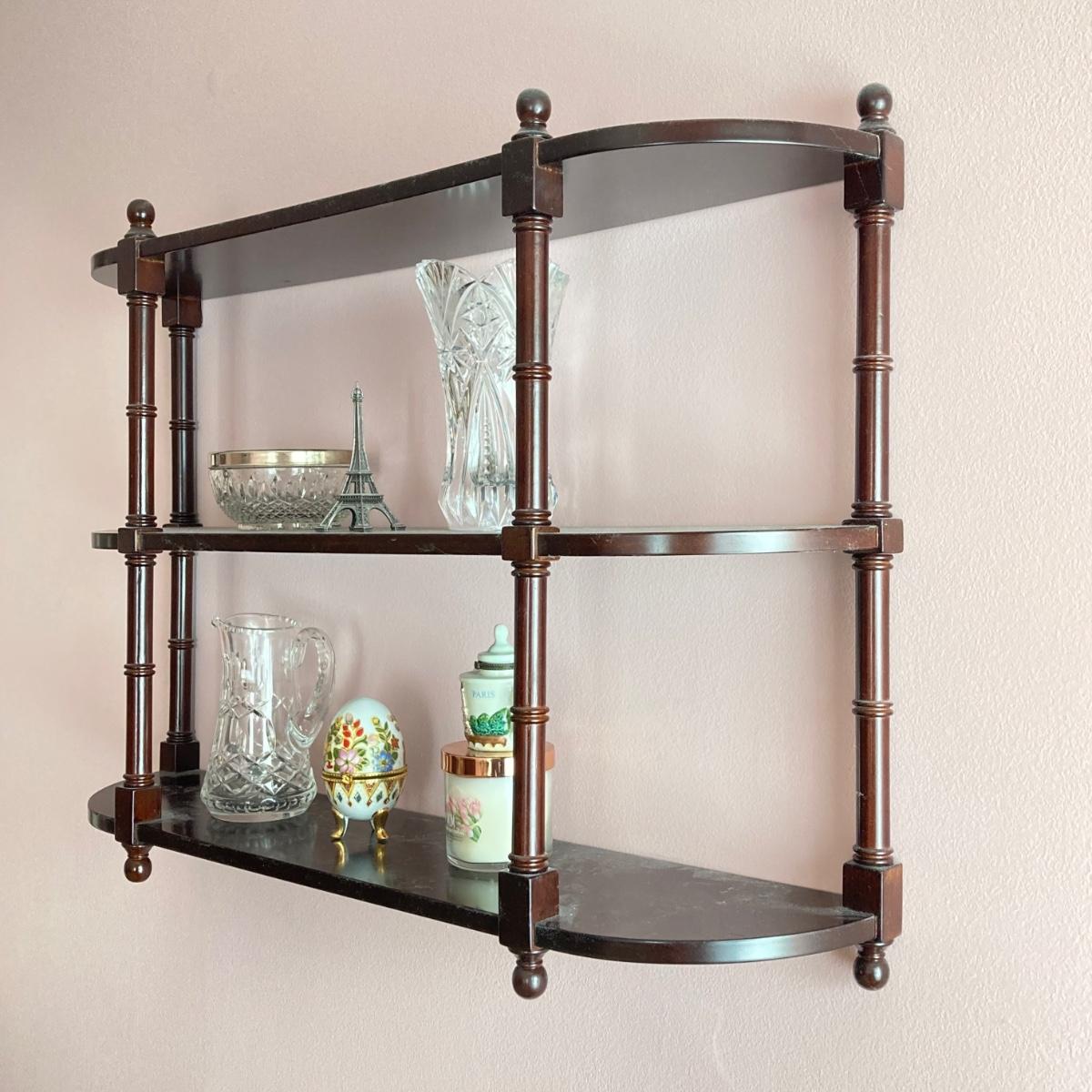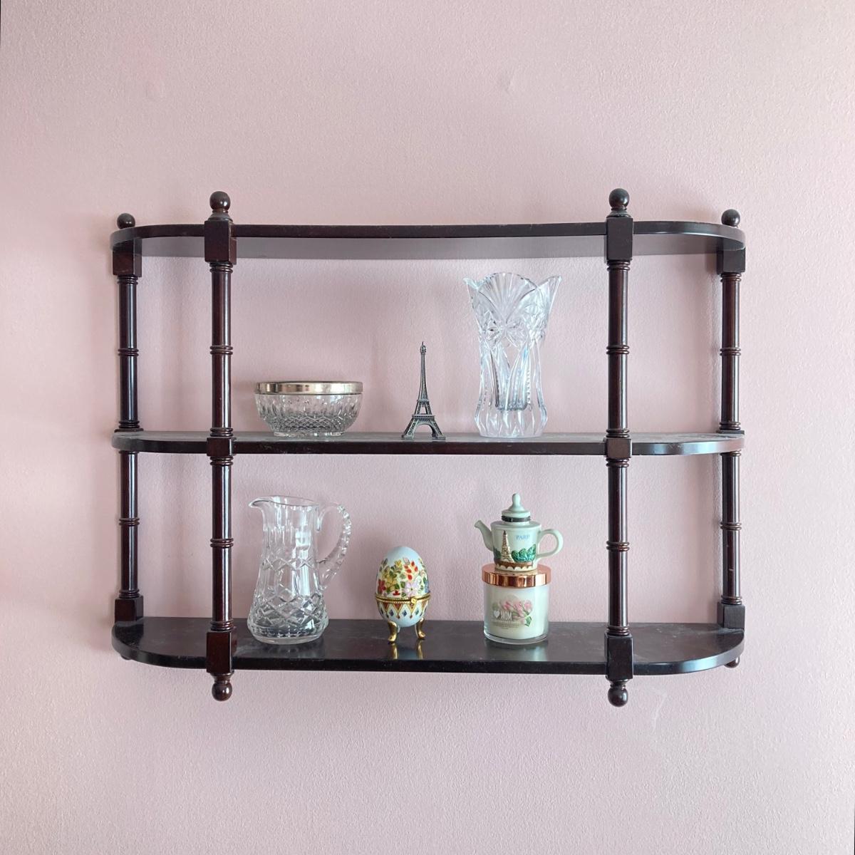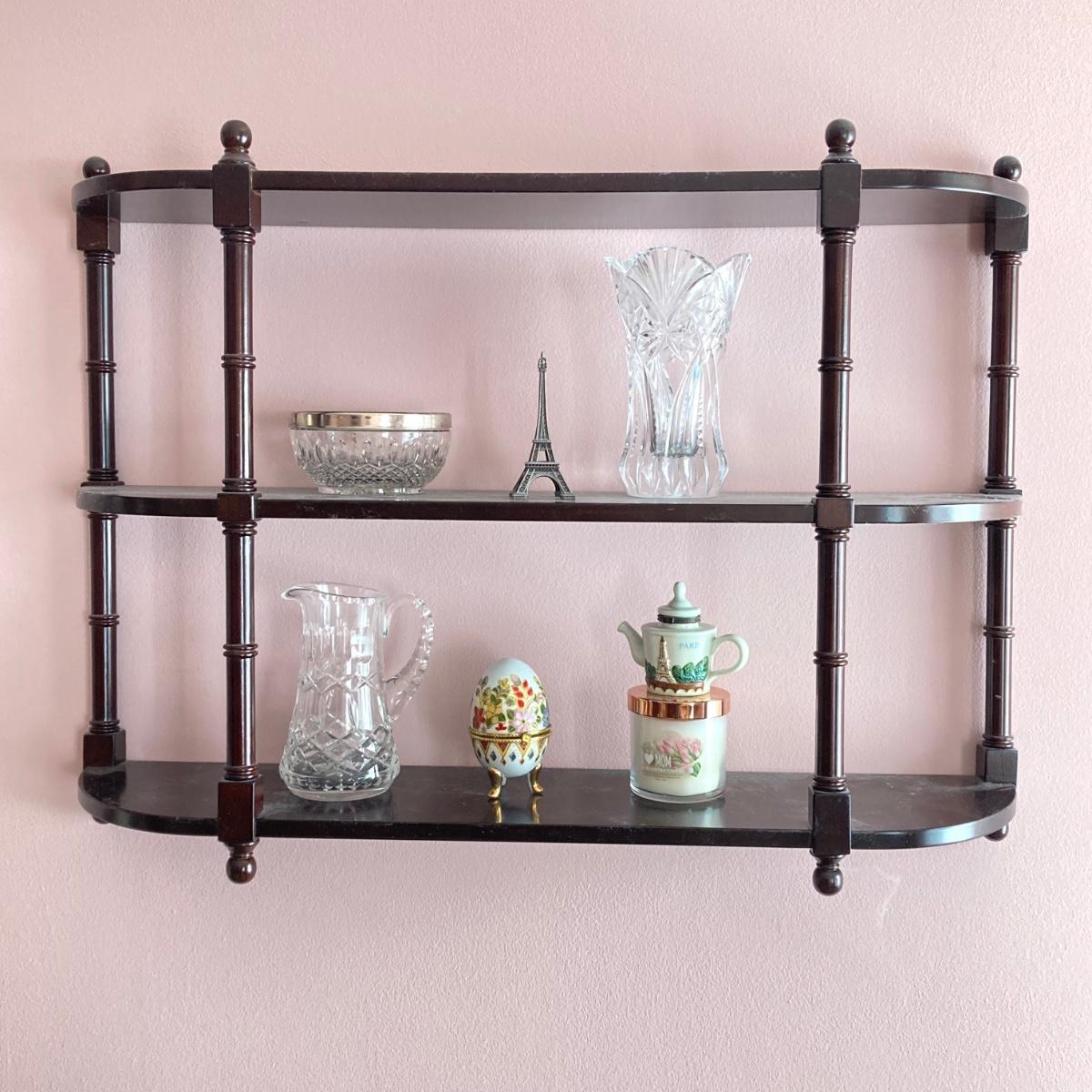 LOT 74: Hanging Wall Shelf with Decorative Trinket Boxes, Crystal and More