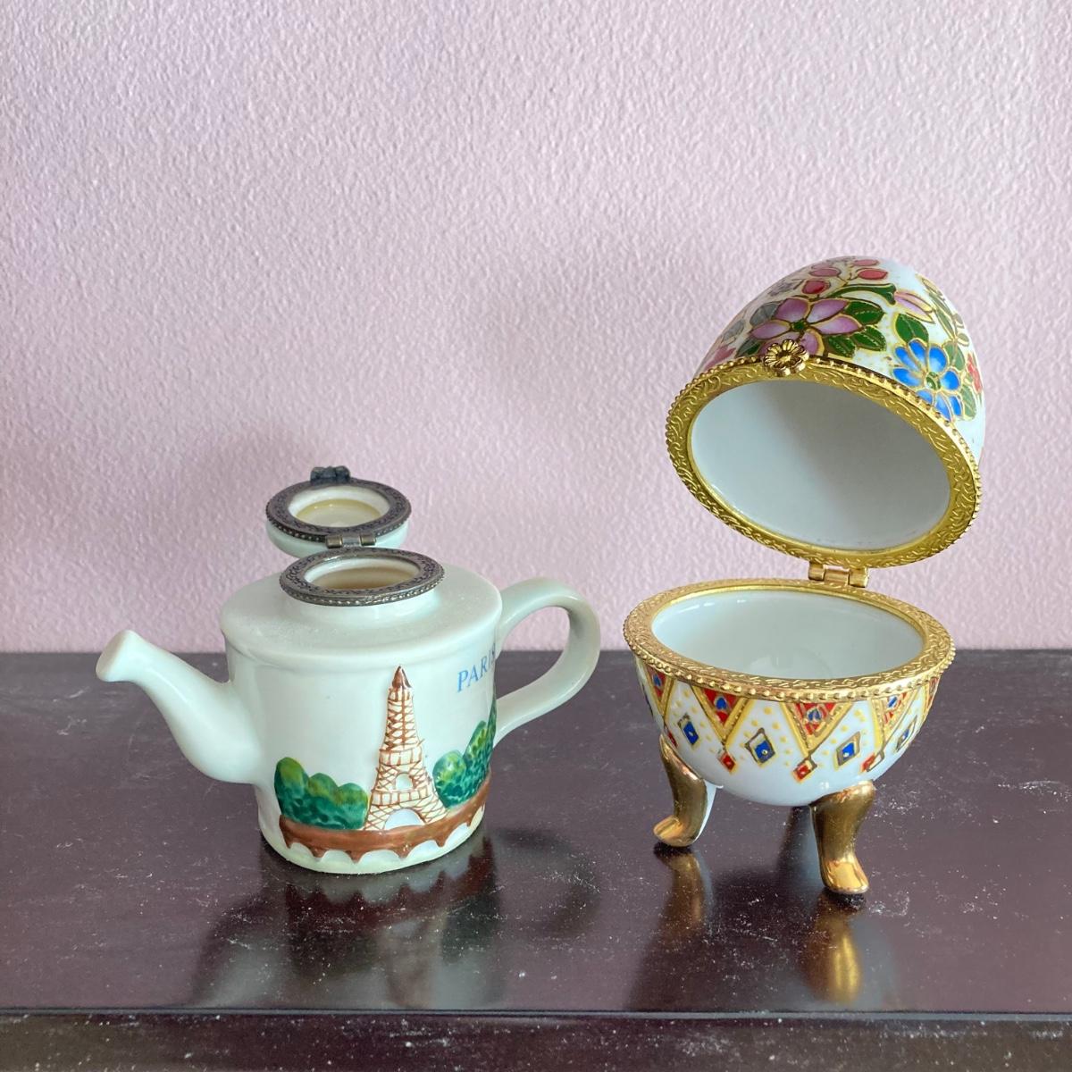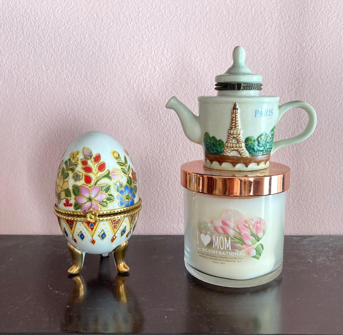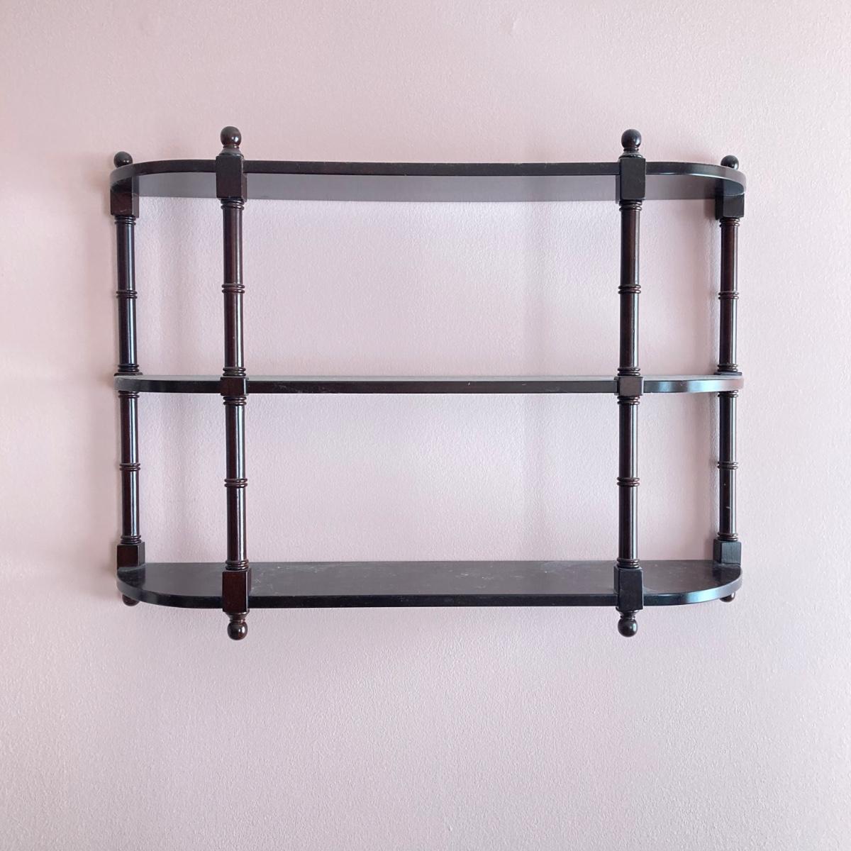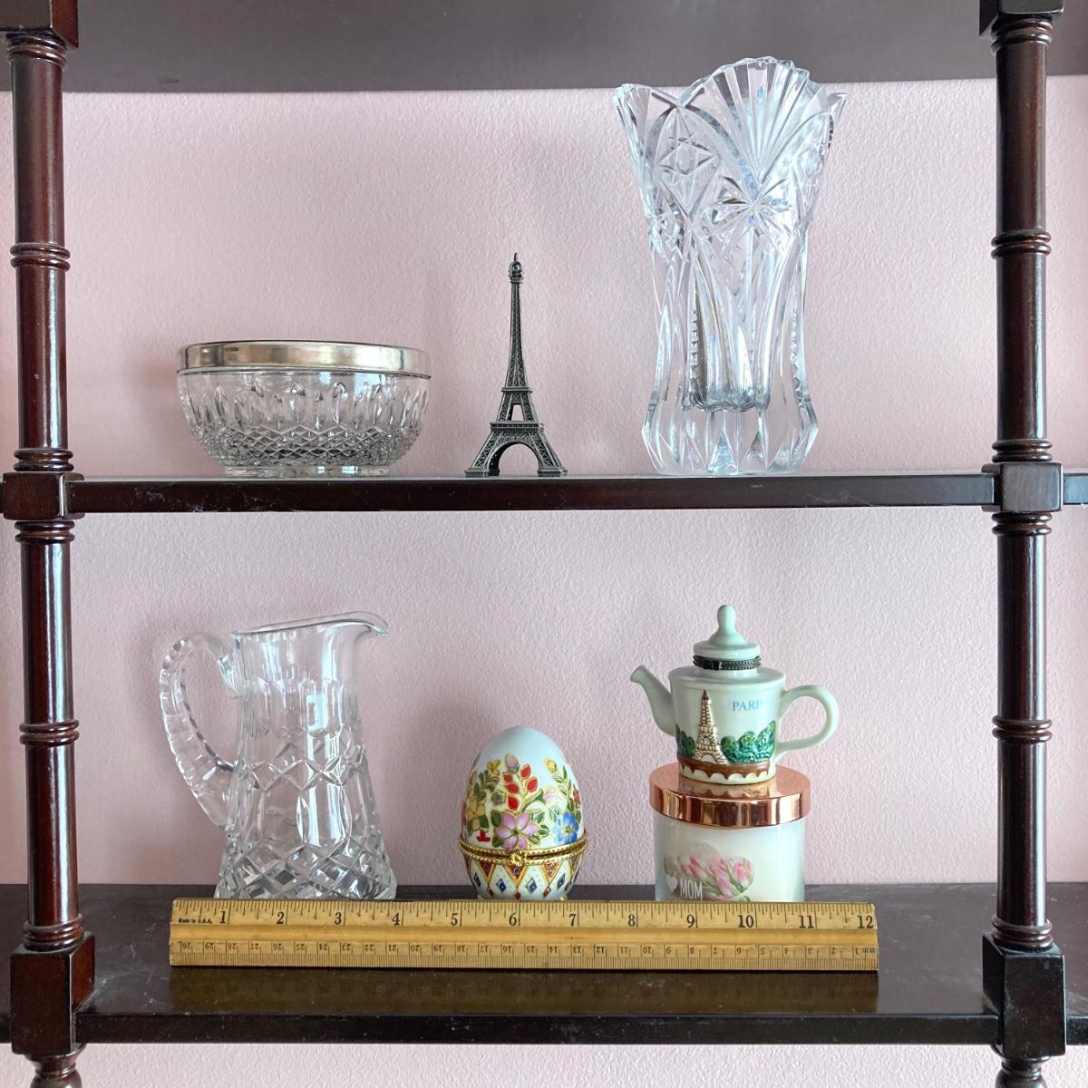LOT 74: Hanging Wall Shelf with Decorative Trinket Boxes, Crystal and More
