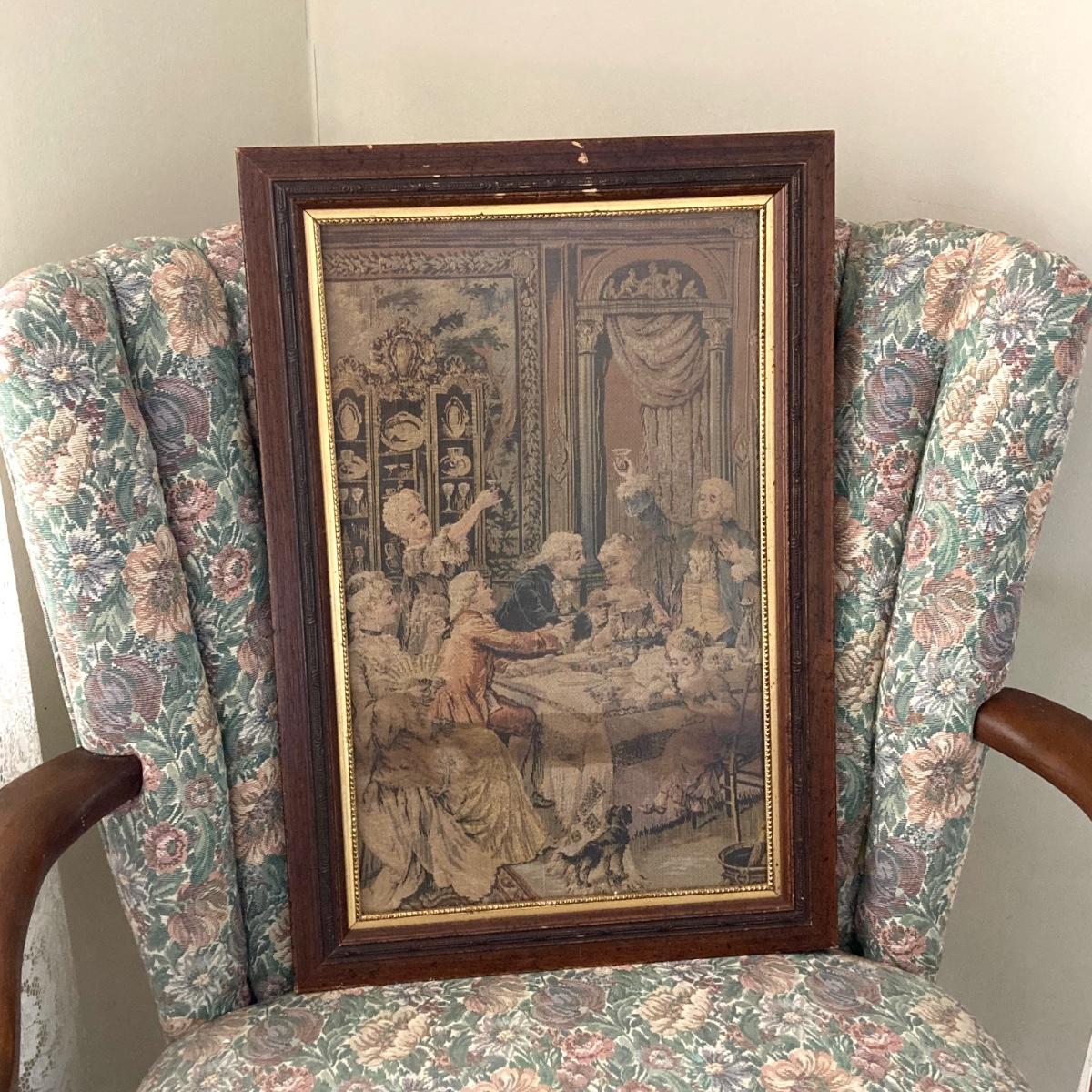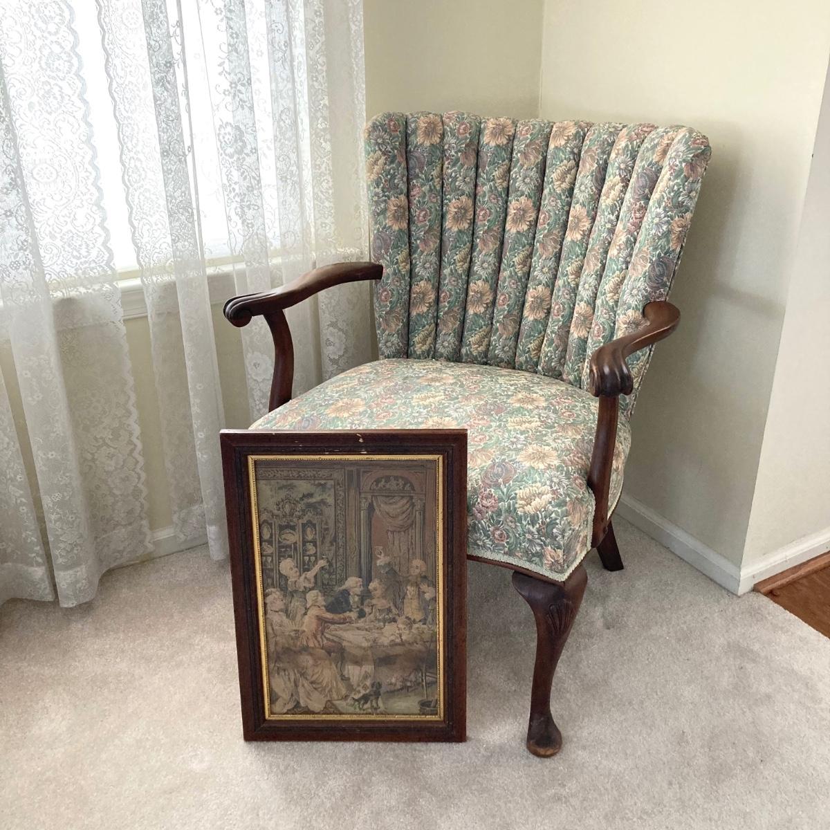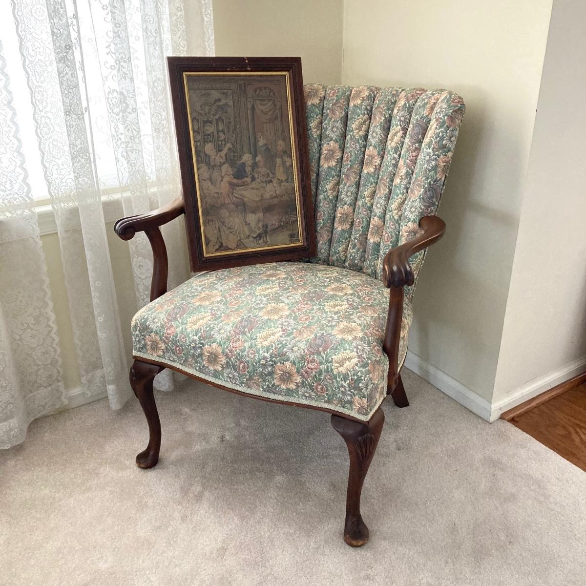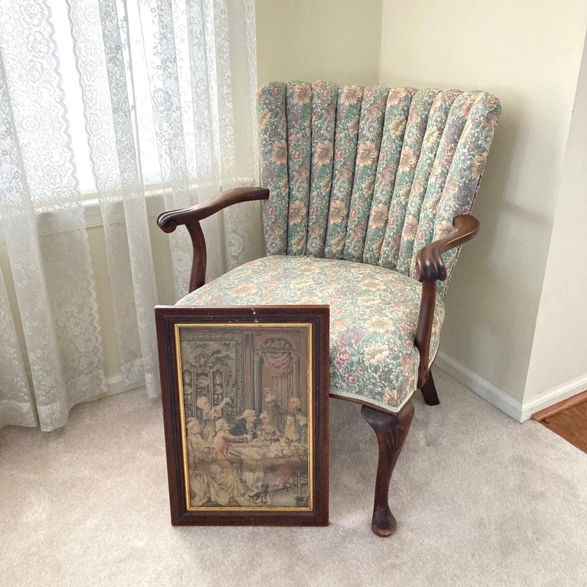 LOT 76: Floral Upholstery Armchair with Framed Tapestry Style Framed Wall Hanging