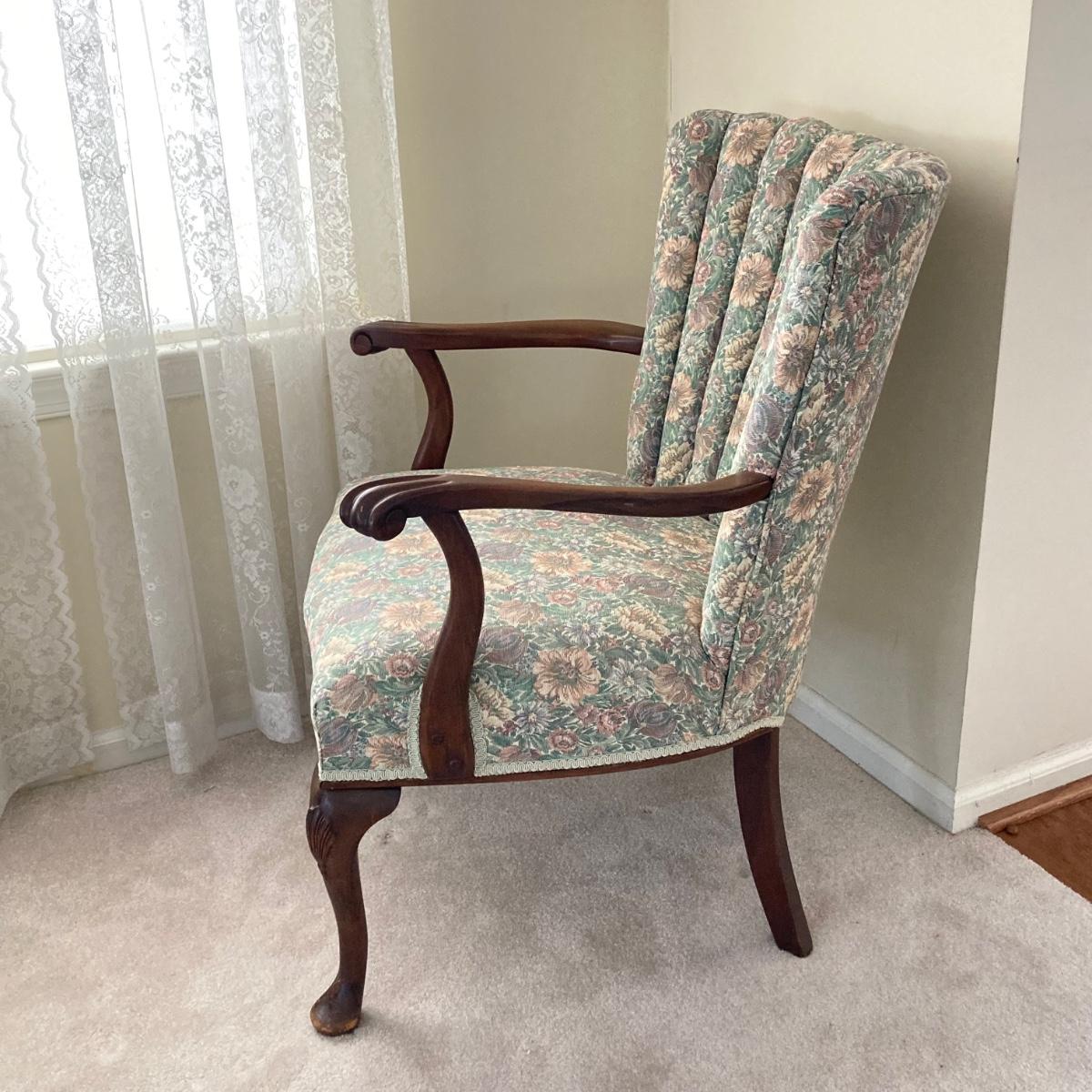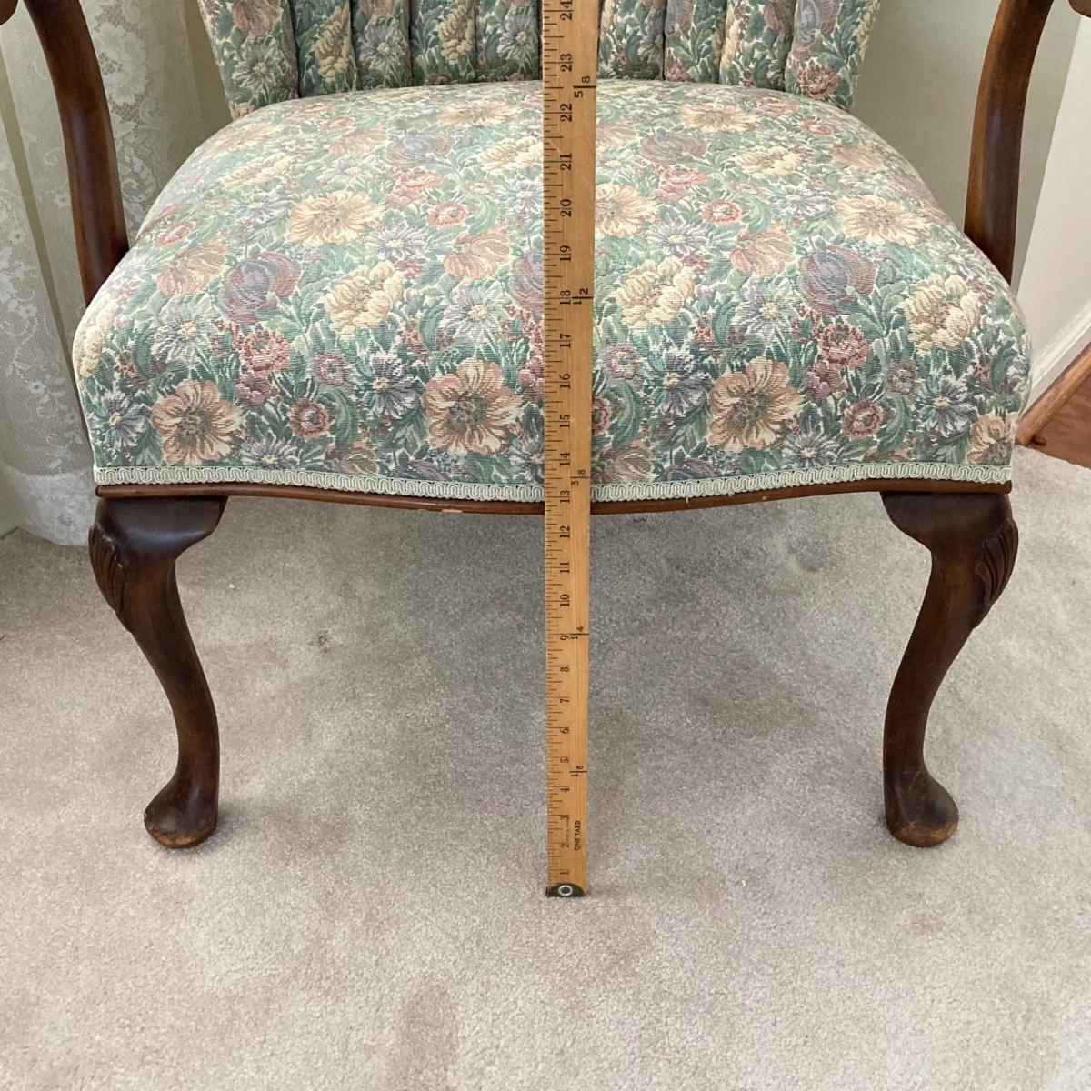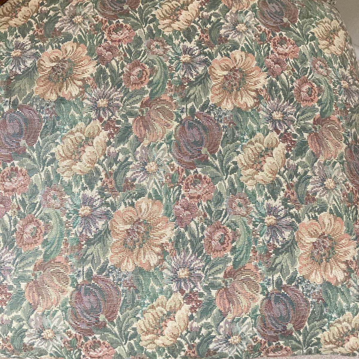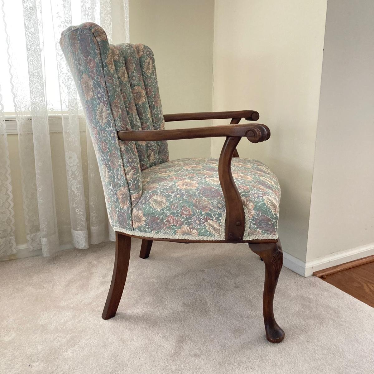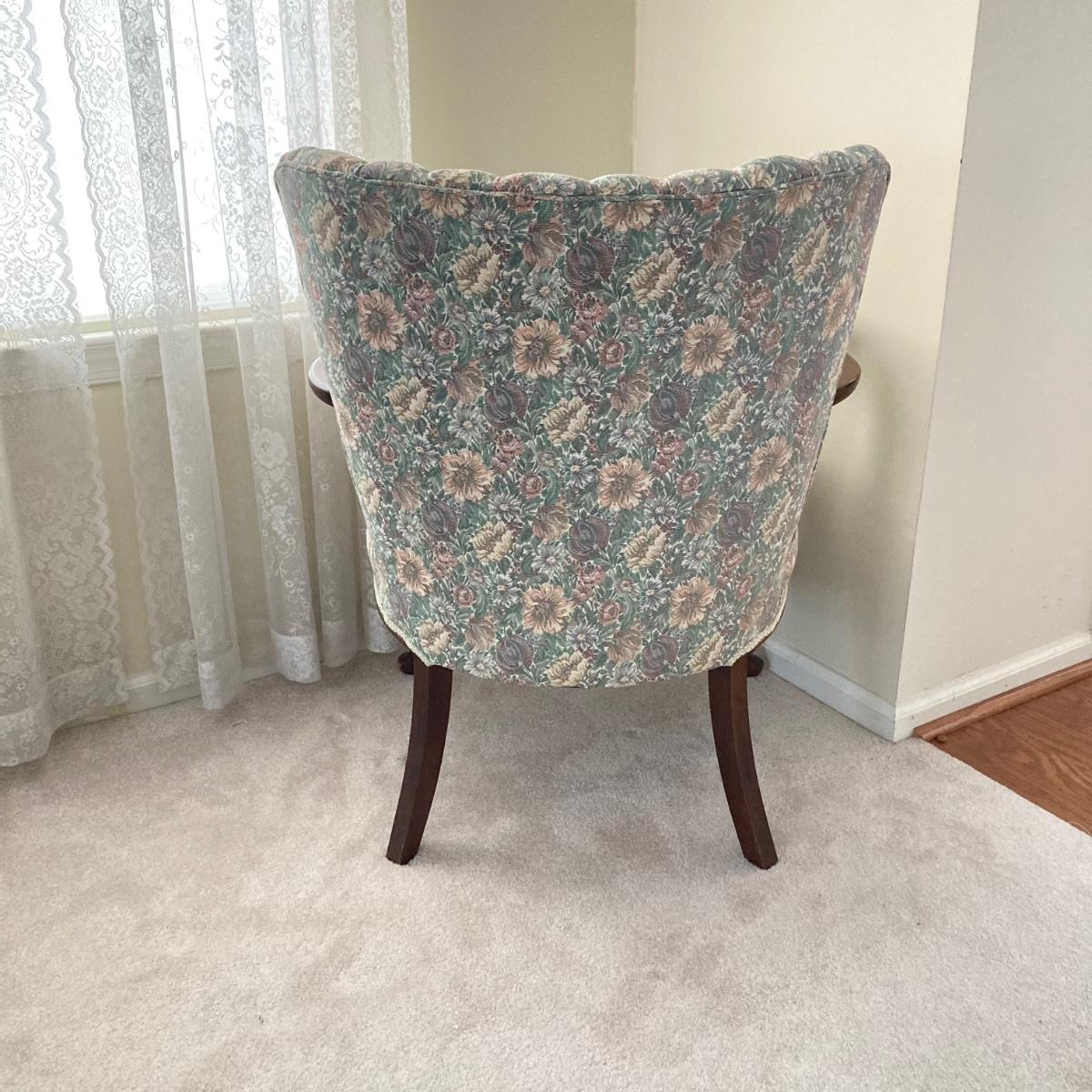 LOT 76: Floral Upholstery Armchair with Framed Tapestry Style Framed Wall Hanging