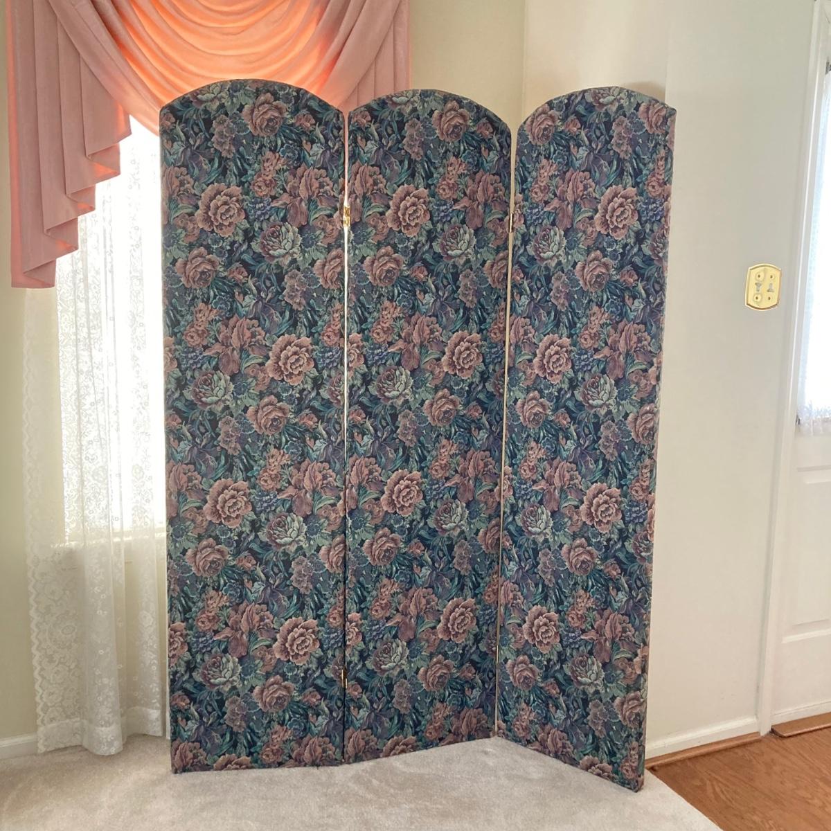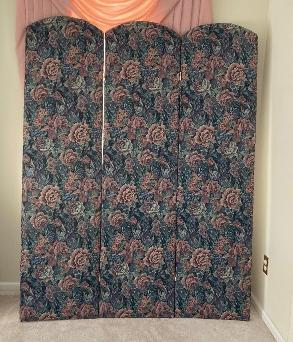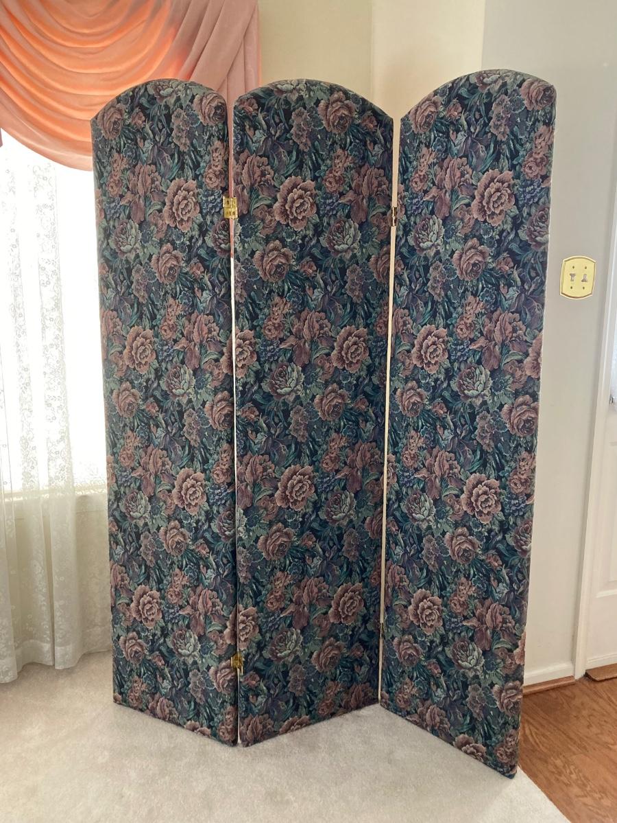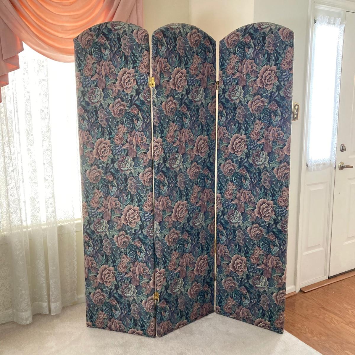 LOT 77: Three Panel Floral Print Upholstered Folding Room Divider