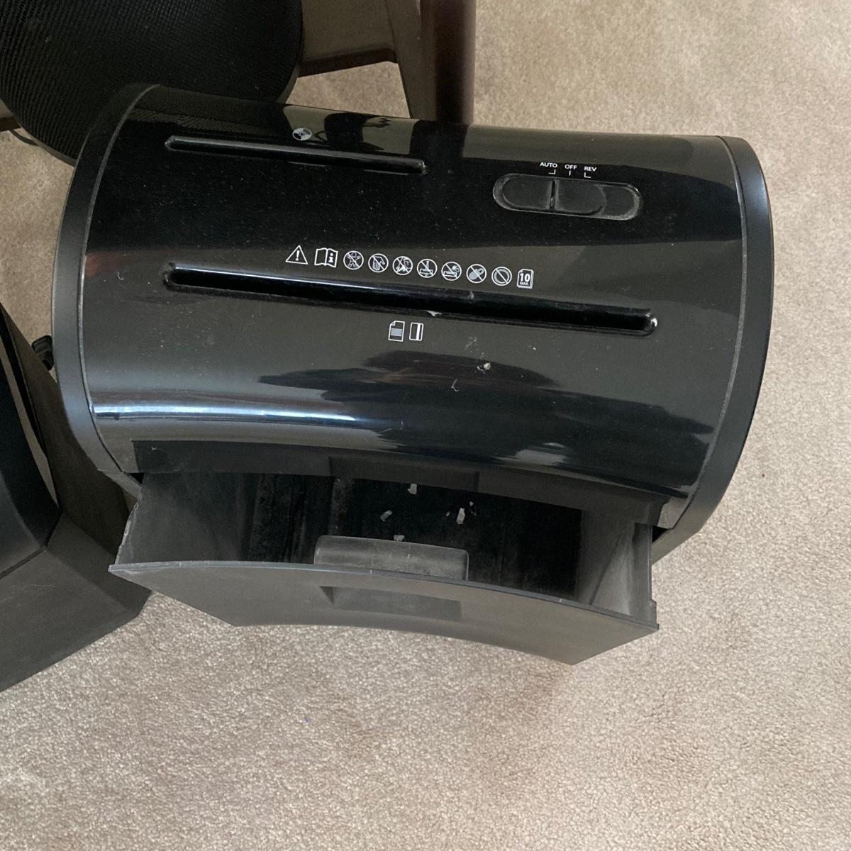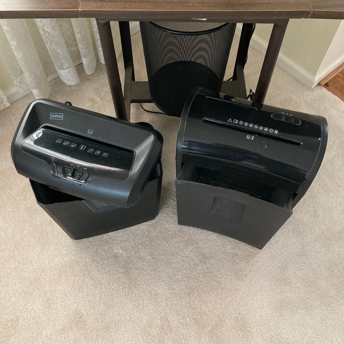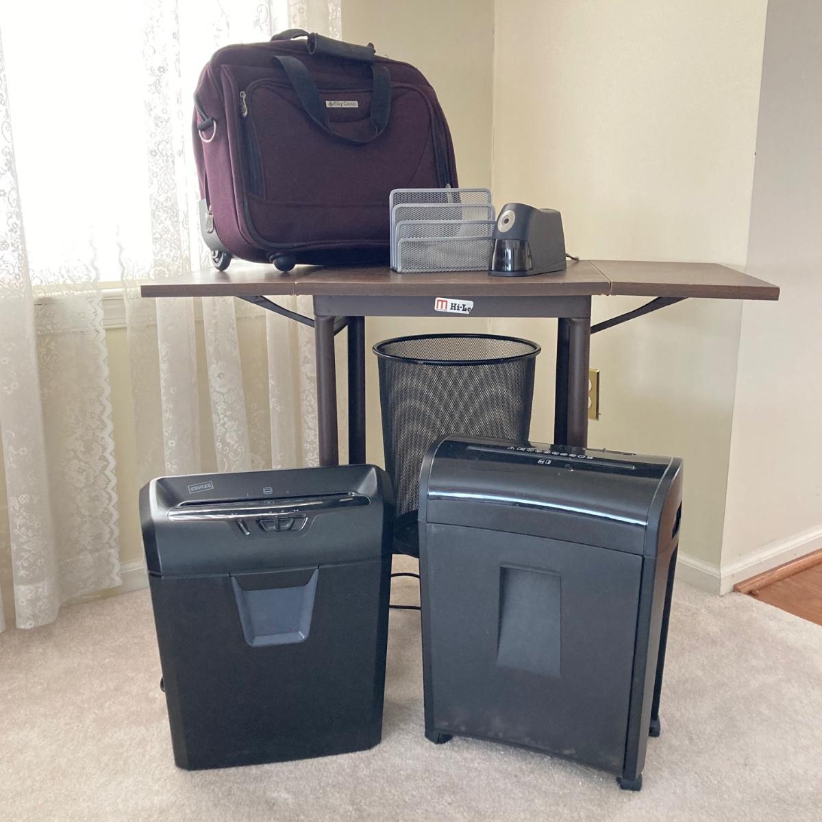 LOT 78: Vintage Metalstand Hi-Lo Typewriter Desk with Oleg Cassini Rolling Work Bag, Stanley Bostitch Electric Pencil Sharpener, Pair of Paper Shredders and More
