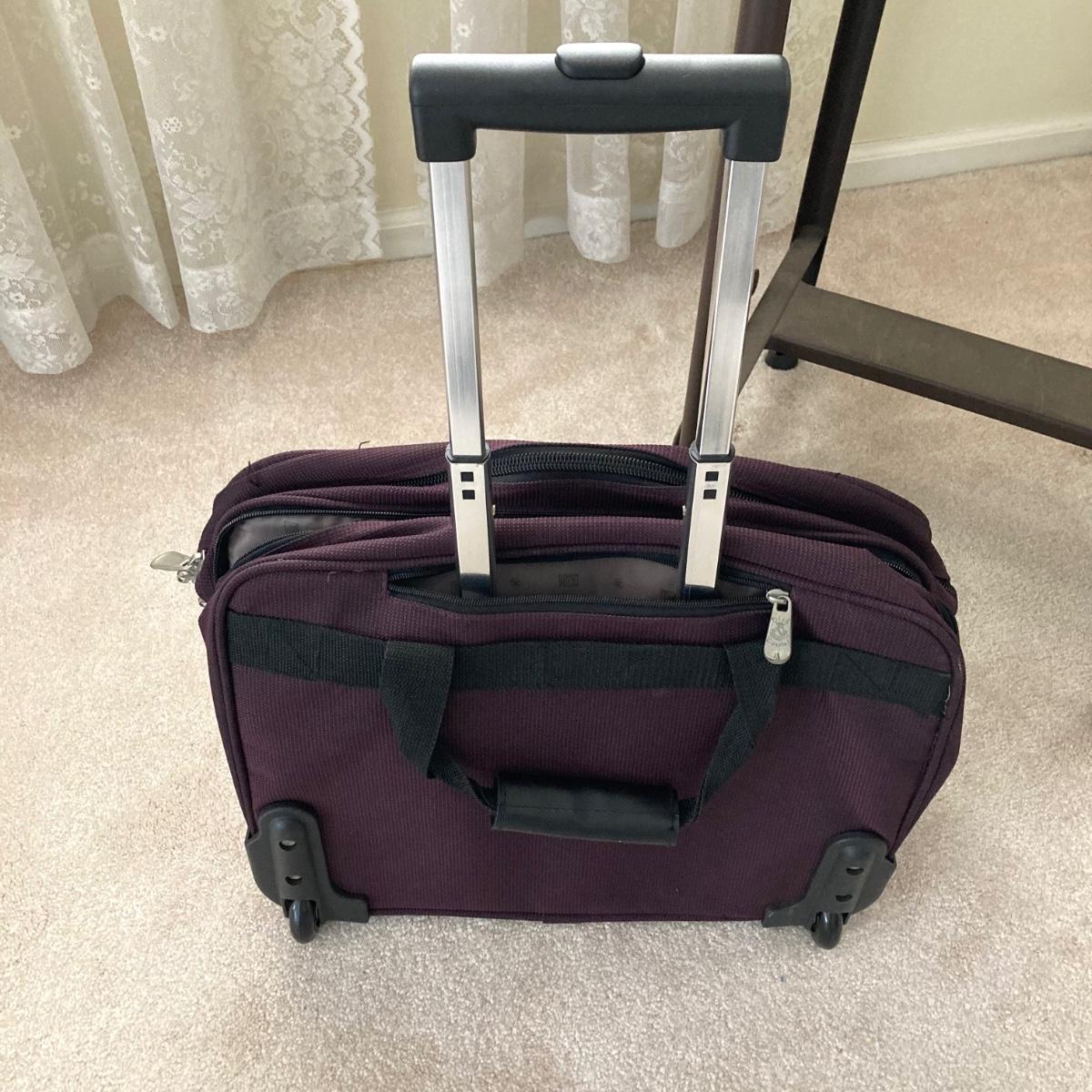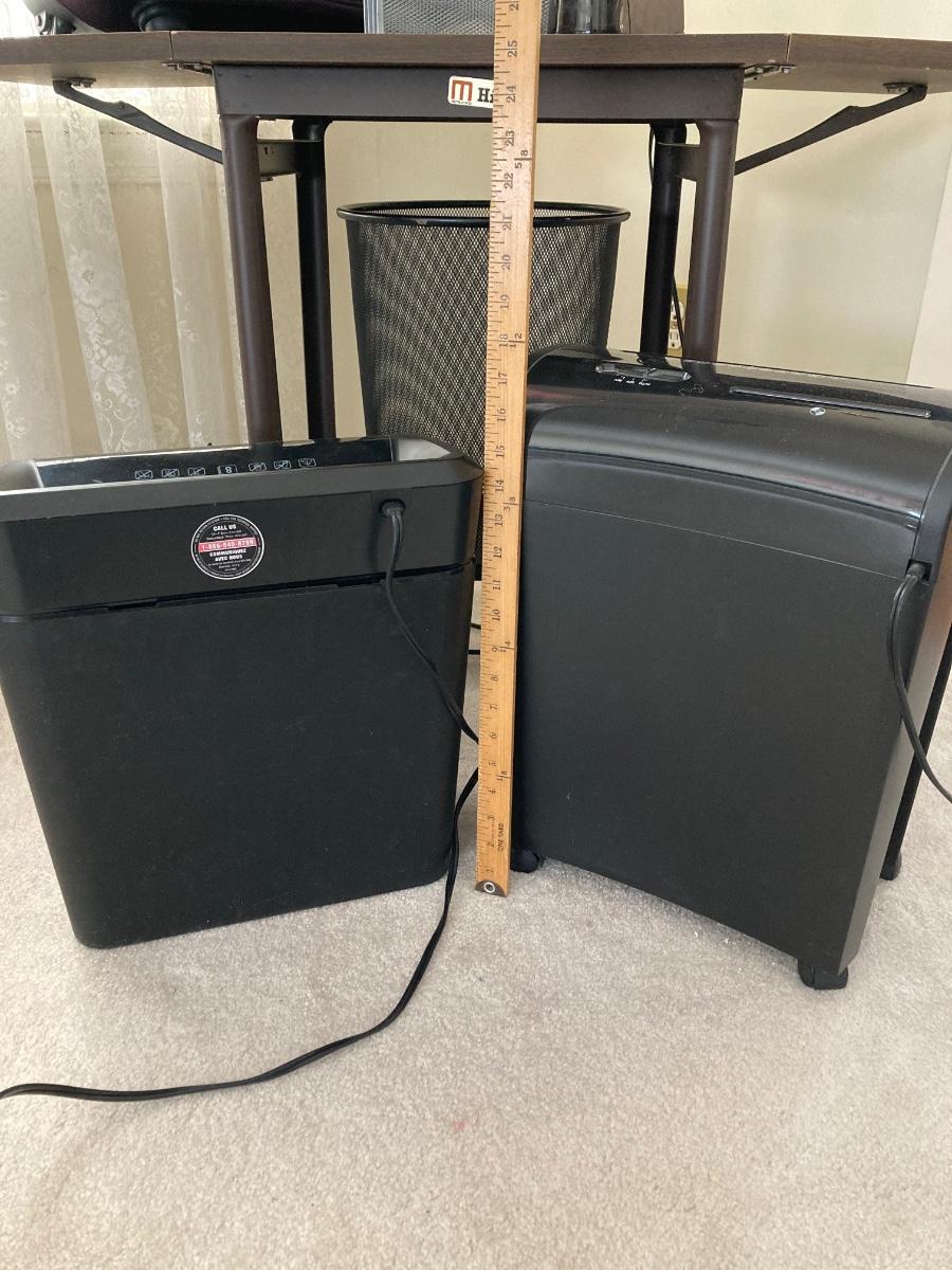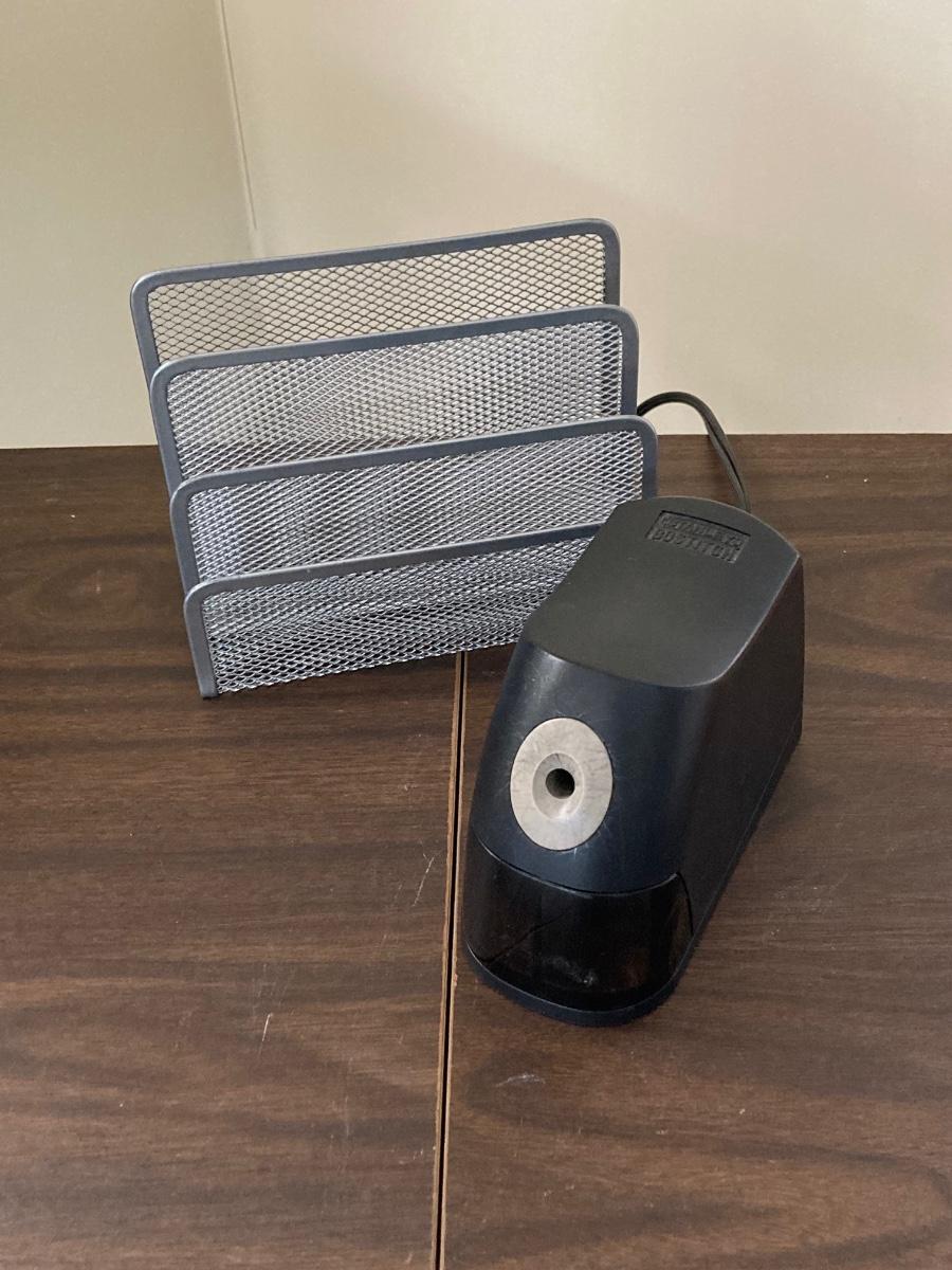 LOT 78: Vintage Metalstand Hi-Lo Typewriter Desk with Oleg Cassini Rolling Work Bag, Stanley Bostitch Electric Pencil Sharpener, Pair of Paper Shredders and More