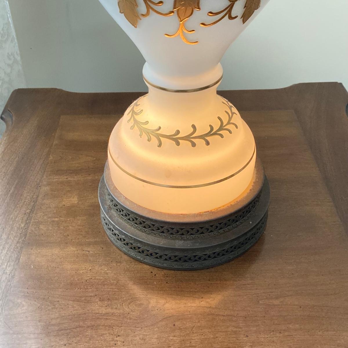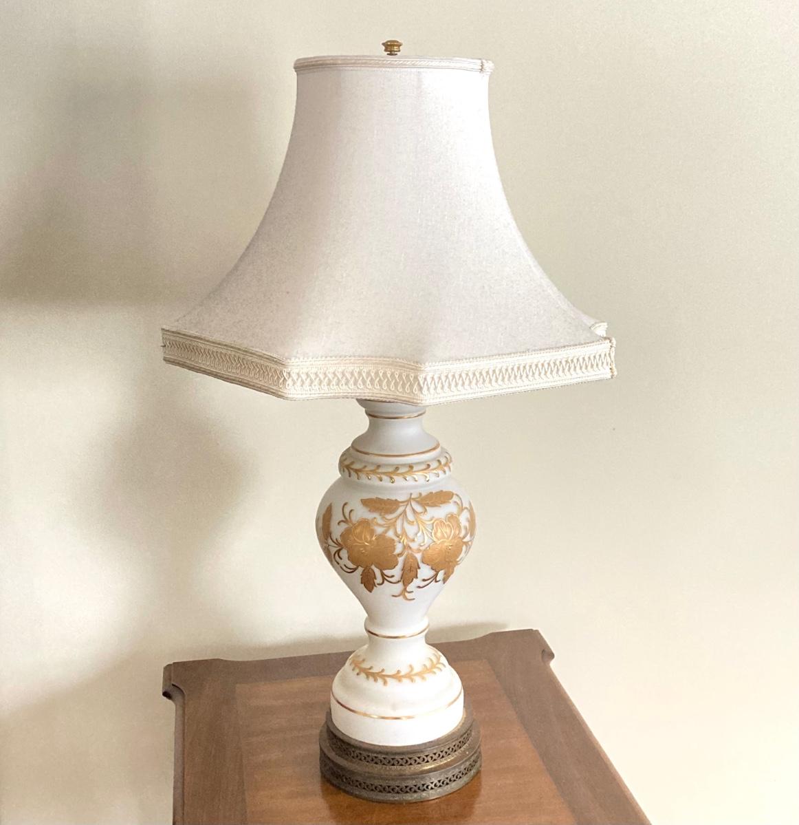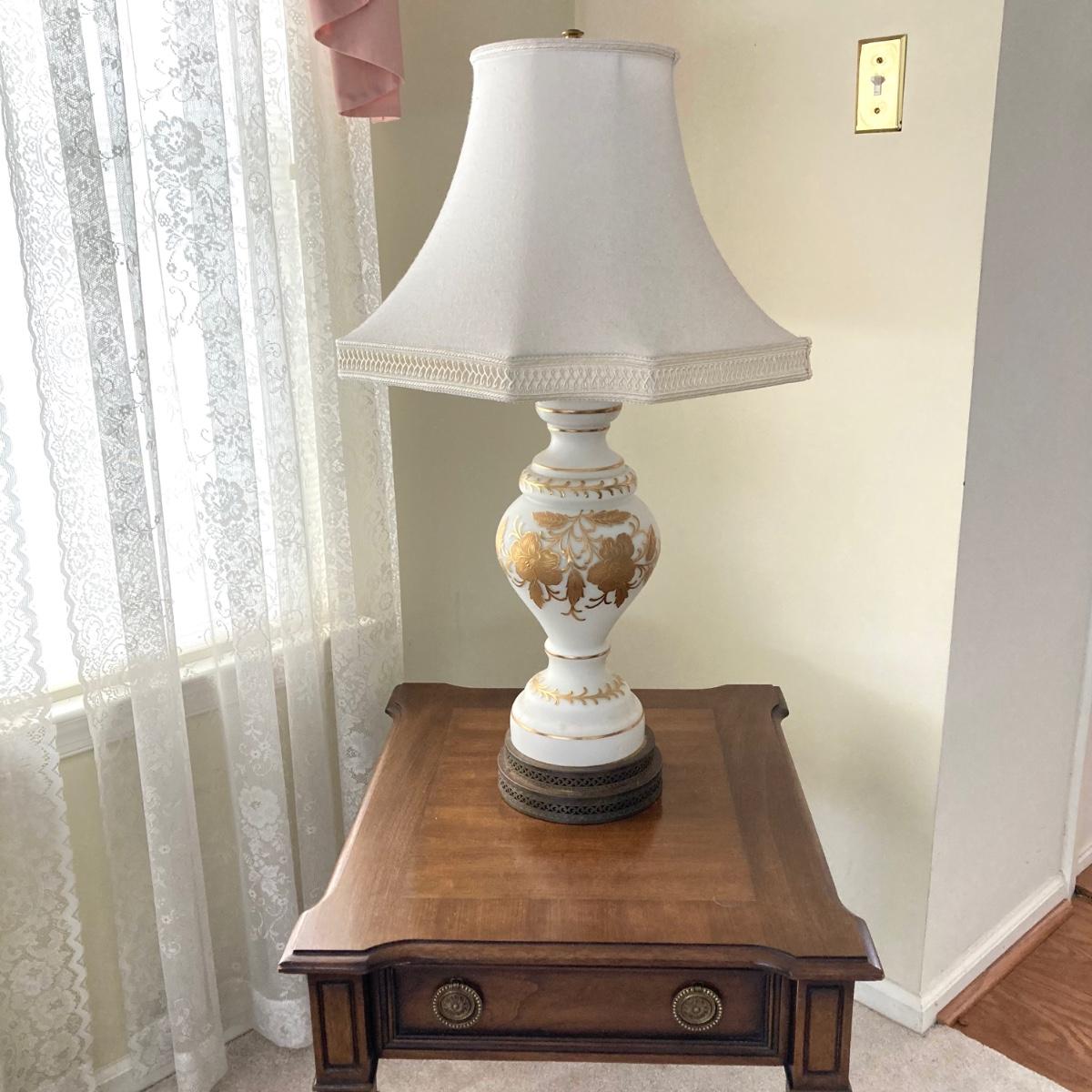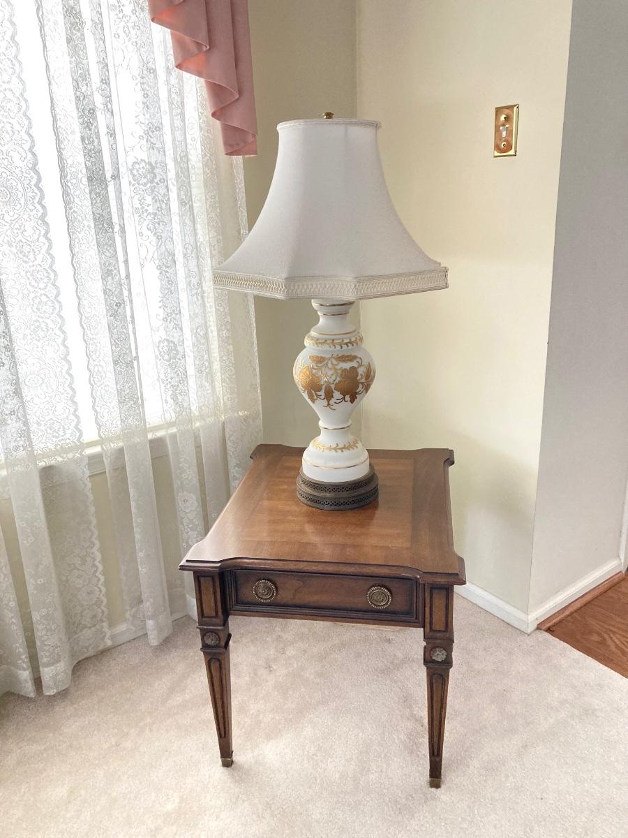 LOT 79: Century Furniture Side Table with Beautiful Vintage Frosted White and Gold Accent Brass Base Table Lamp