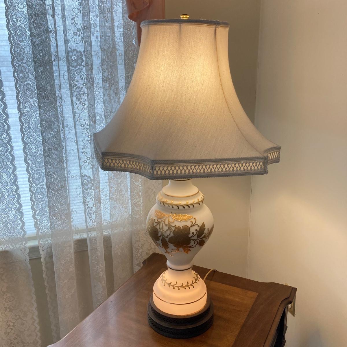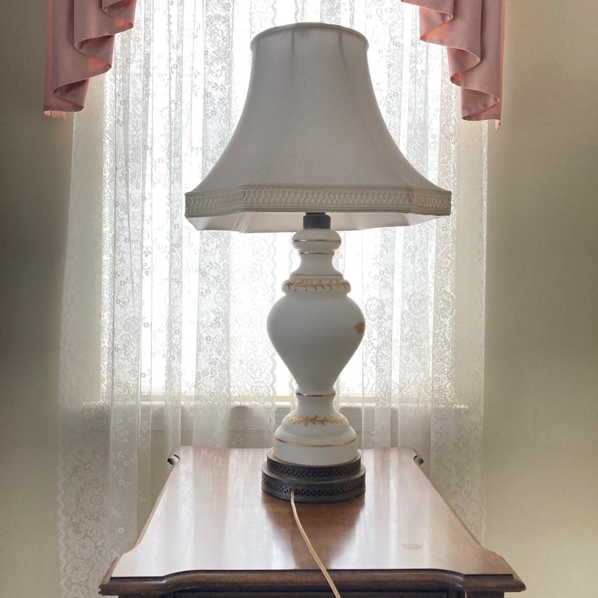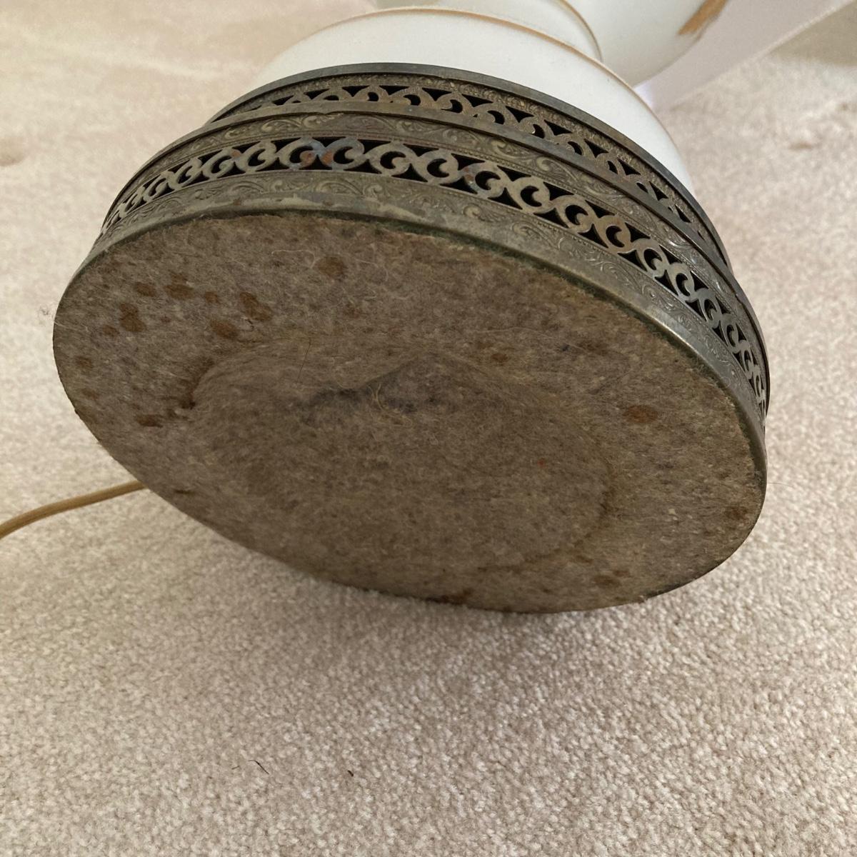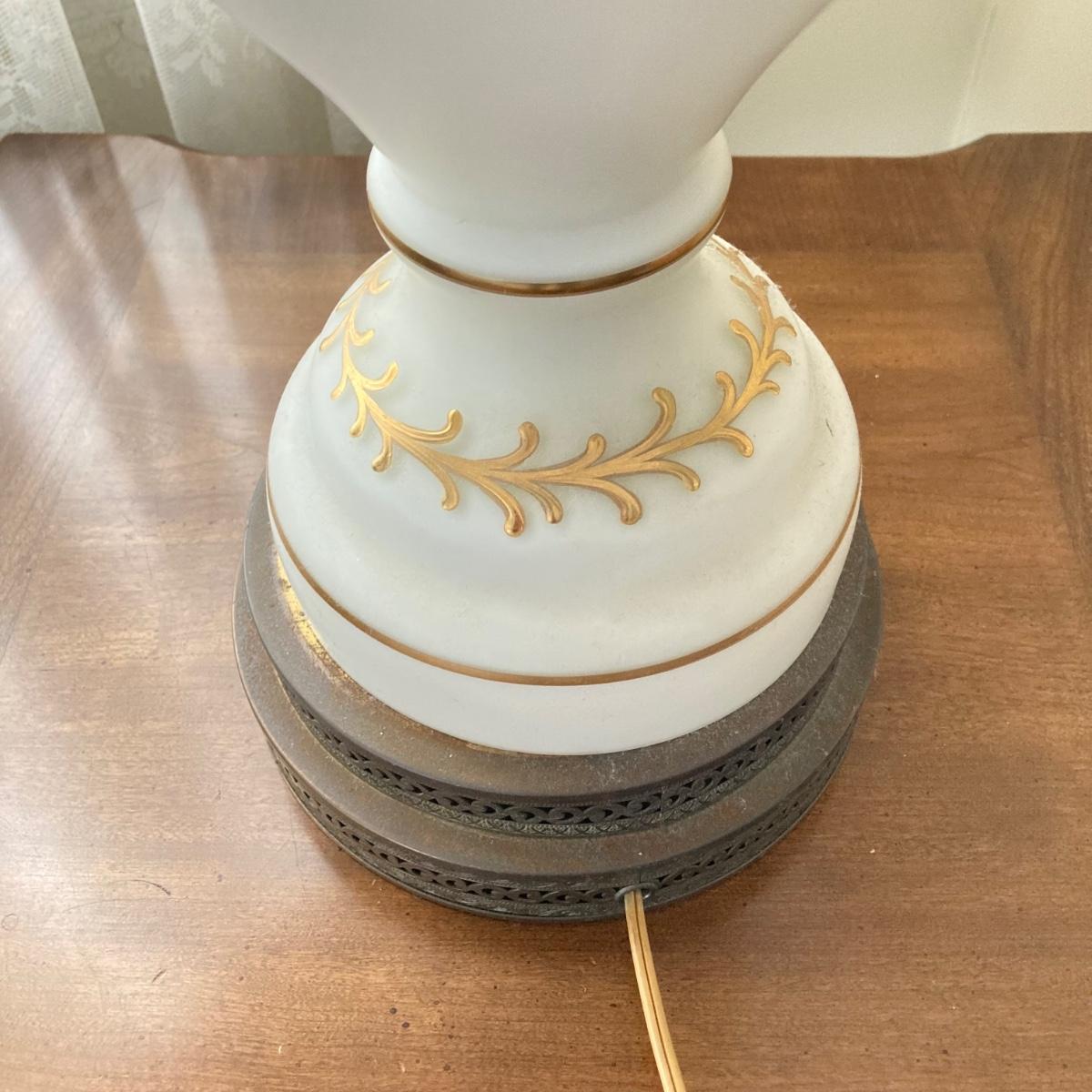 LOT 79: Century Furniture Side Table with Beautiful Vintage Frosted White and Gold Accent Brass Base Table Lamp