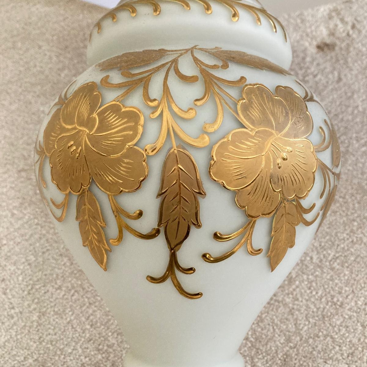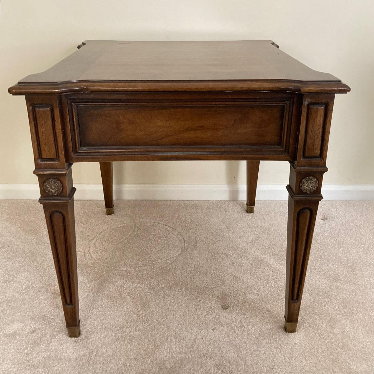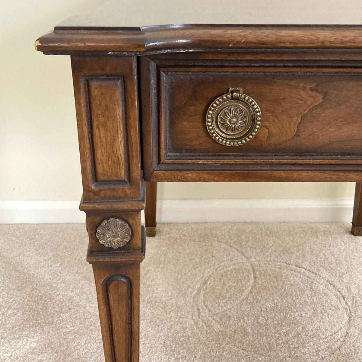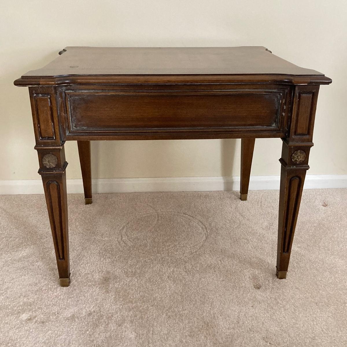 LOT 79: Century Furniture Side Table with Beautiful Vintage Frosted White and Gold Accent Brass Base Table Lamp