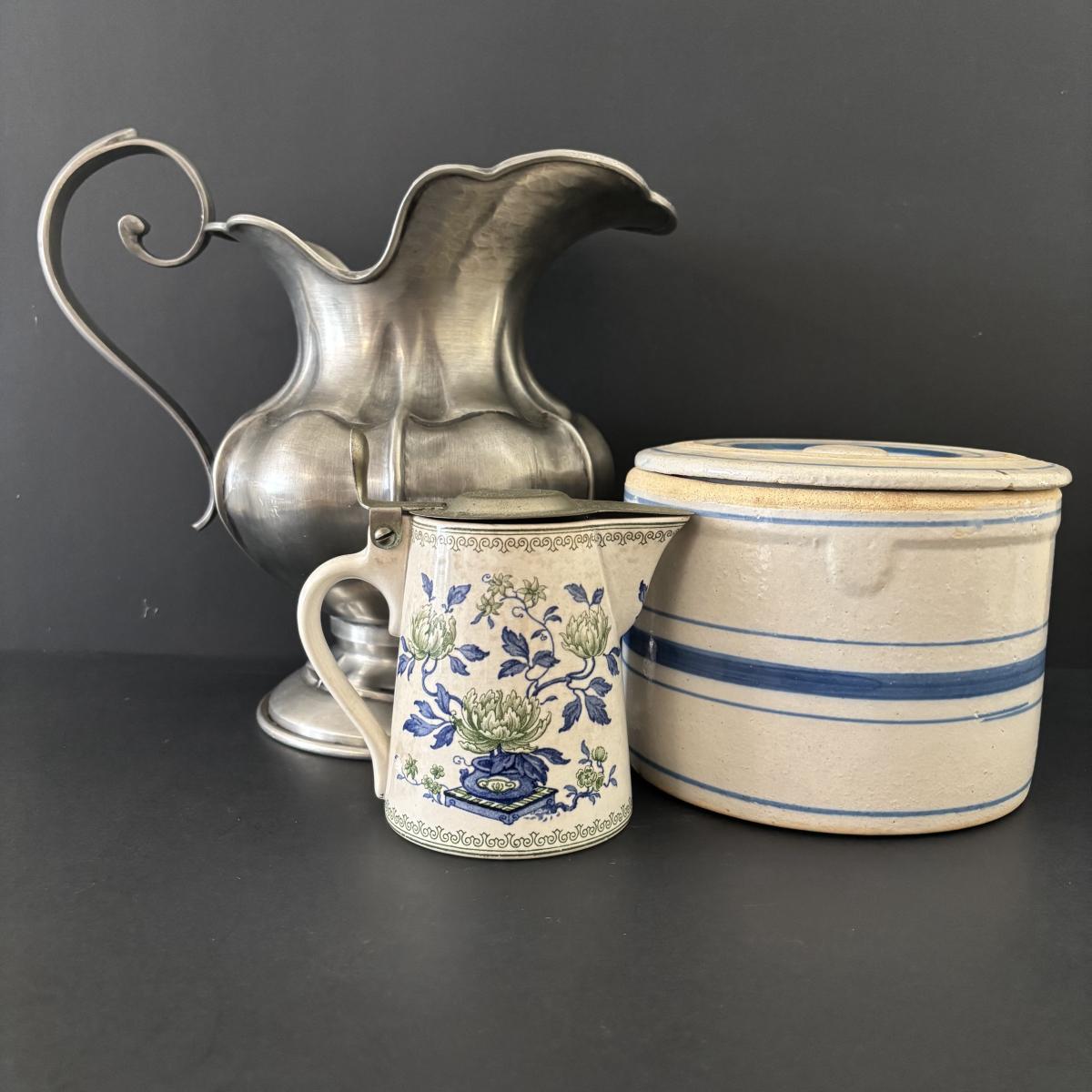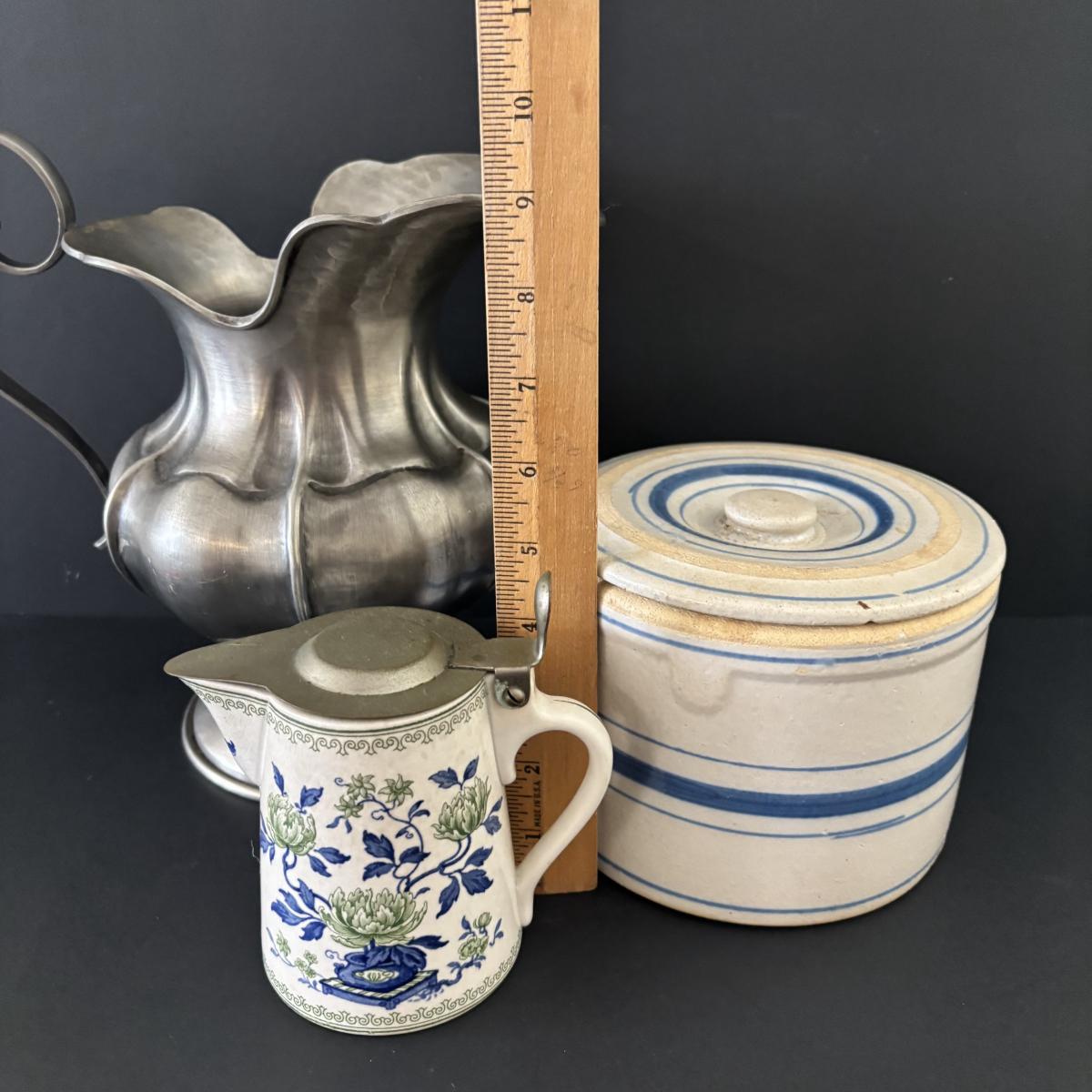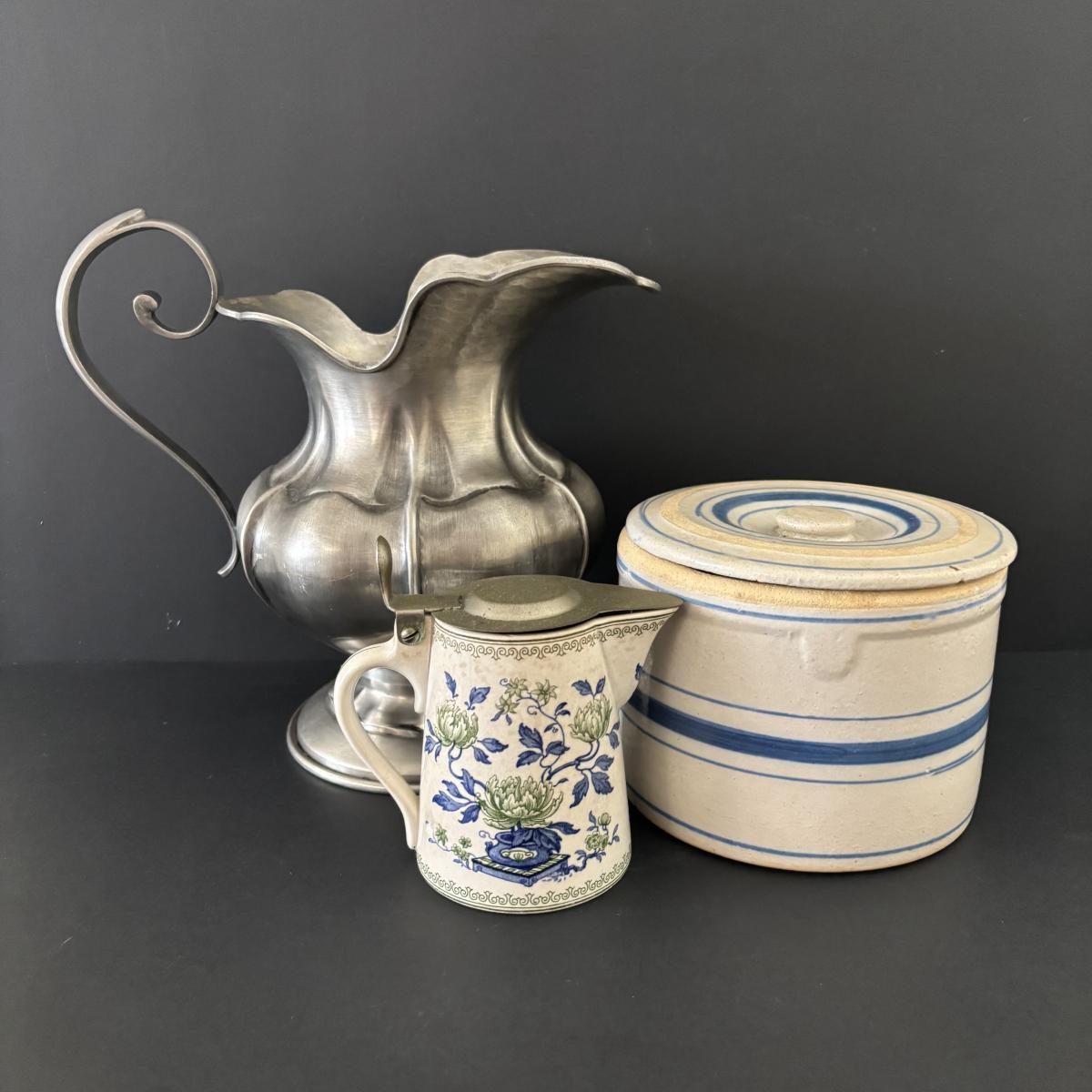 LOT 93: Vintage Villeroy Boch Dresden Saxony Pitcher, Primitive Glazed Pottery Crock w/Lid & Etain Zinn Pewter Pitcher