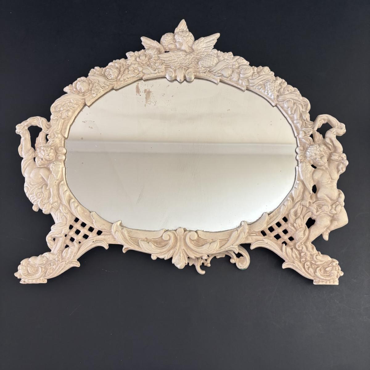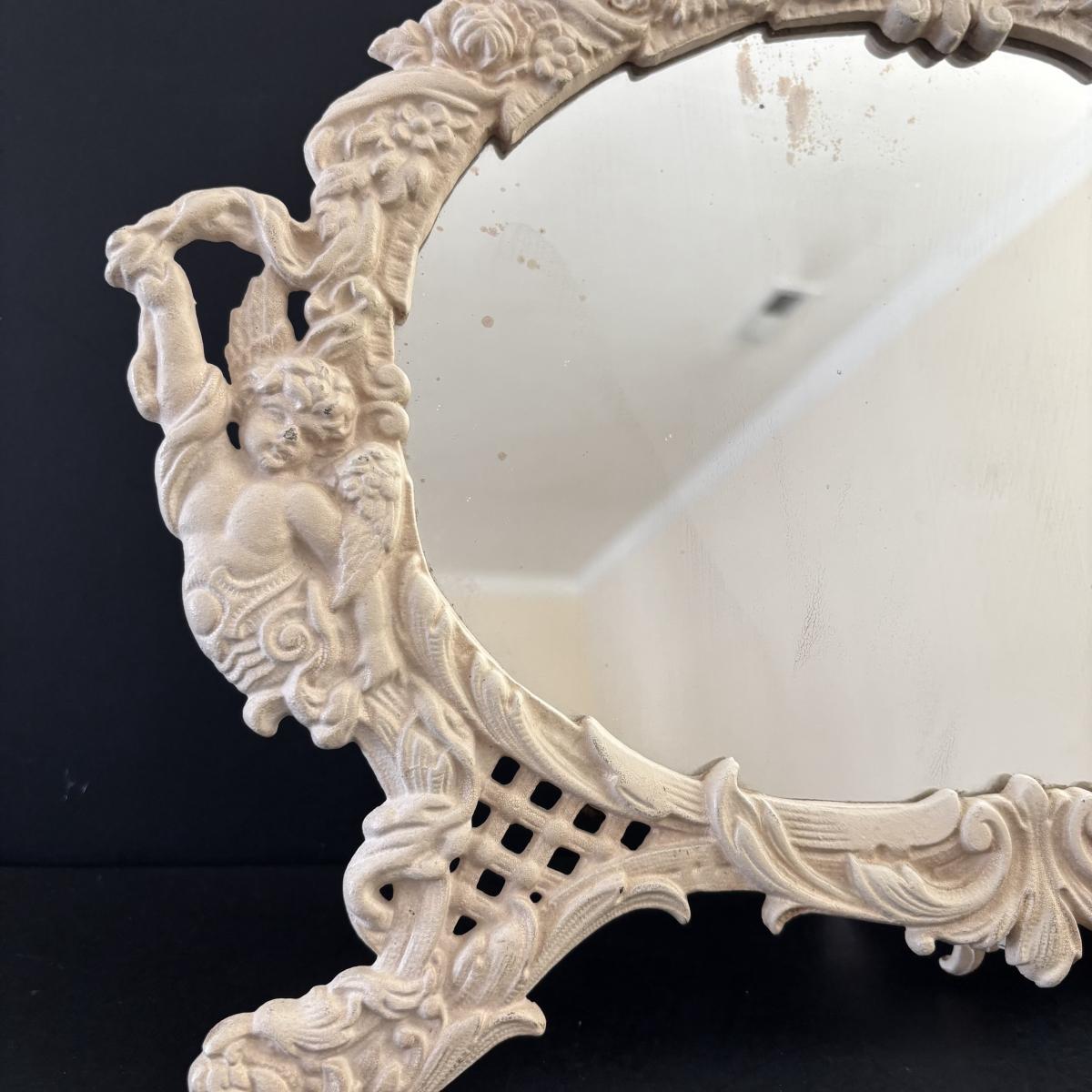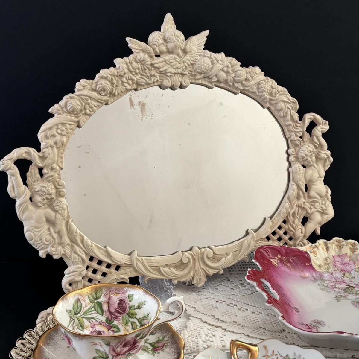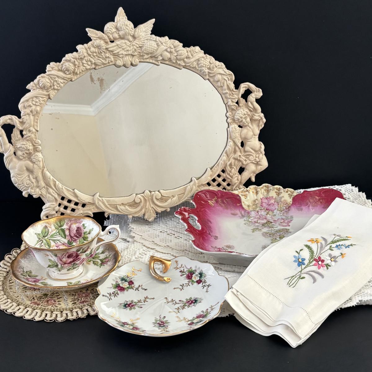 LOT 107: Shabby Chic Collection: Cast Iron Standing Vanity Mirror, Porcelain Trinket Dish, Brunswick Germany Dresser Tray, Royal Albert Teacup & Vintage Linens