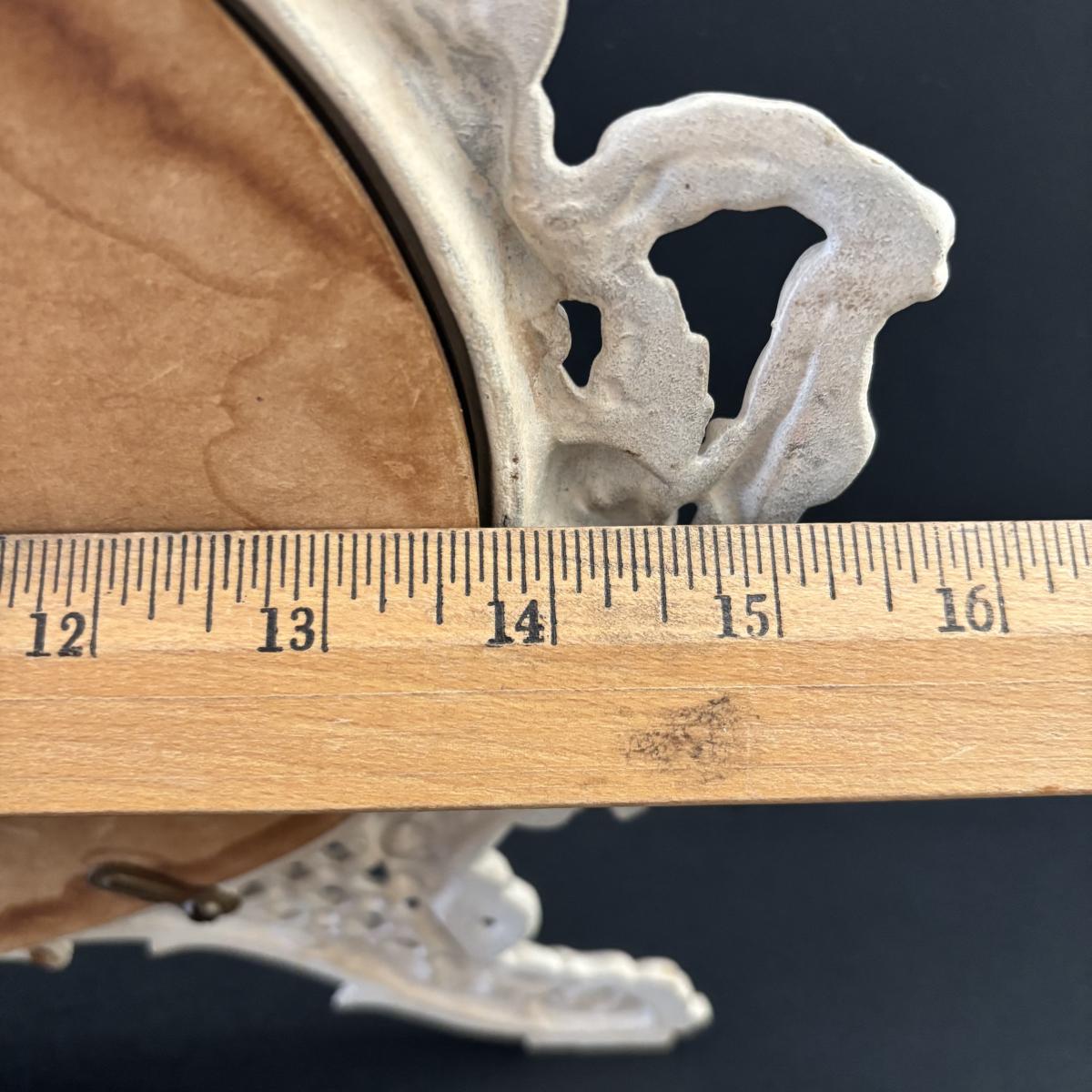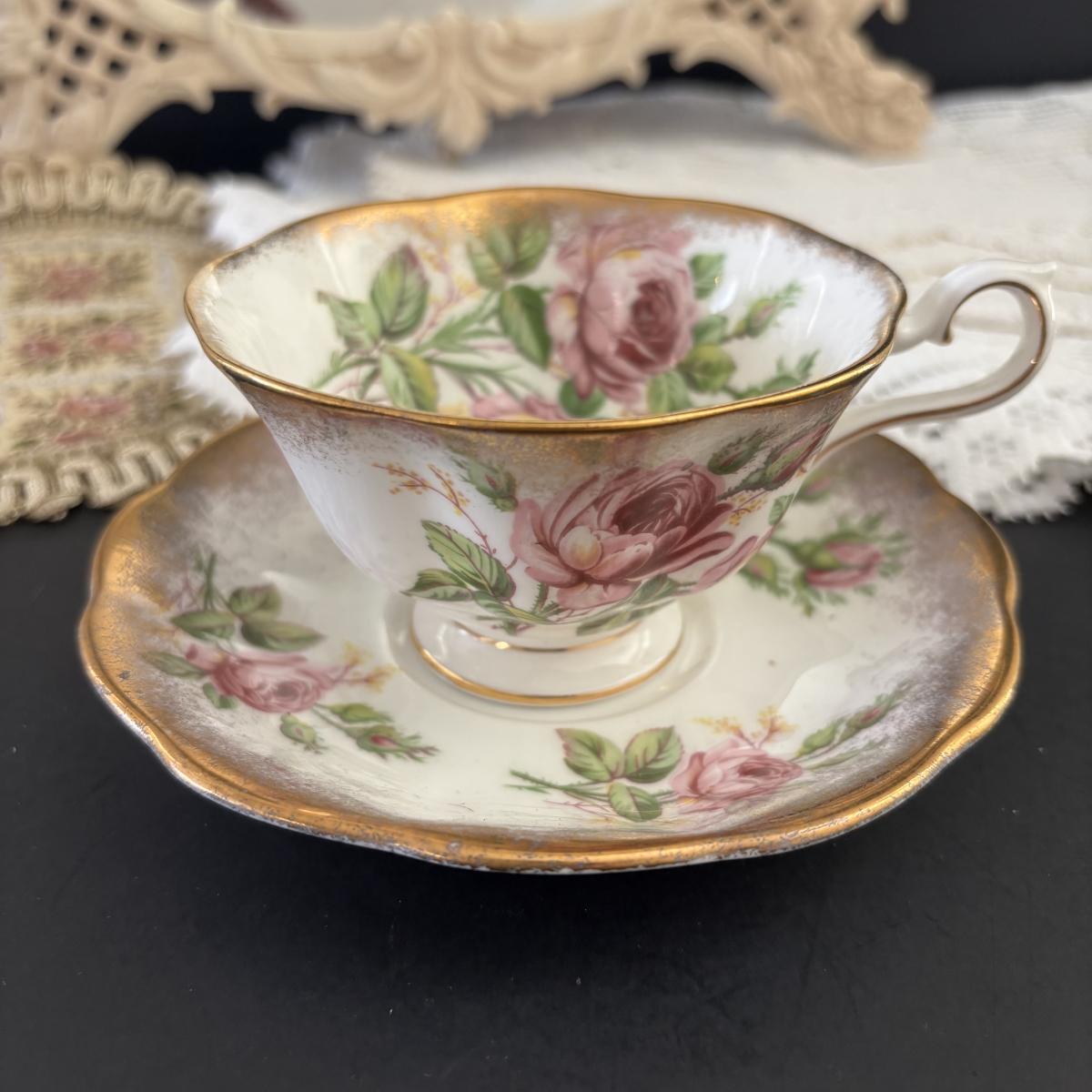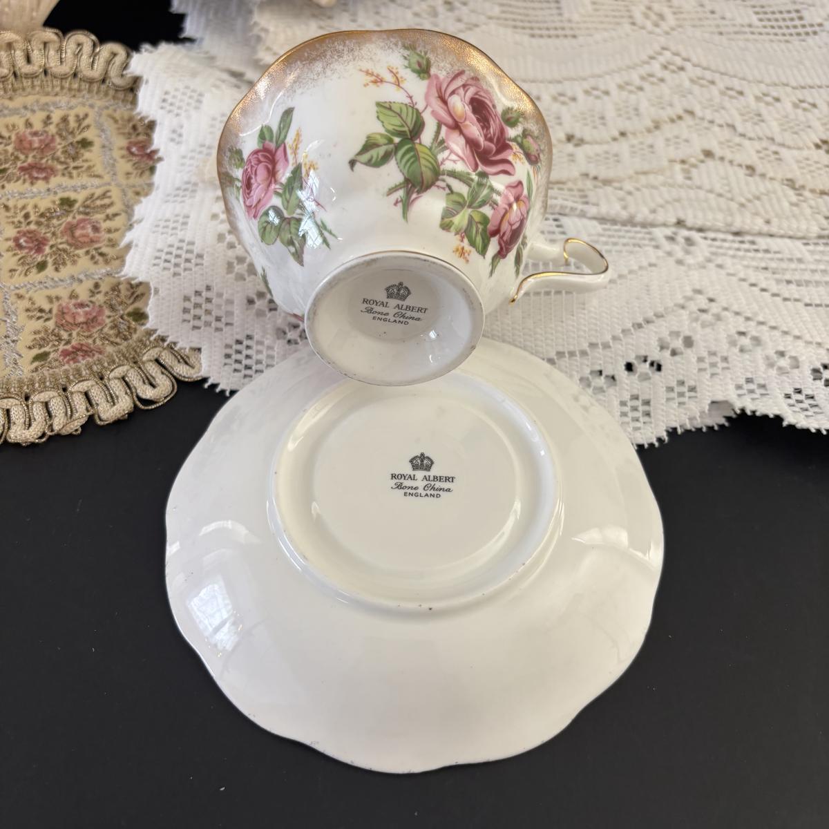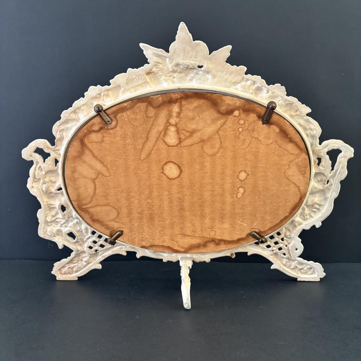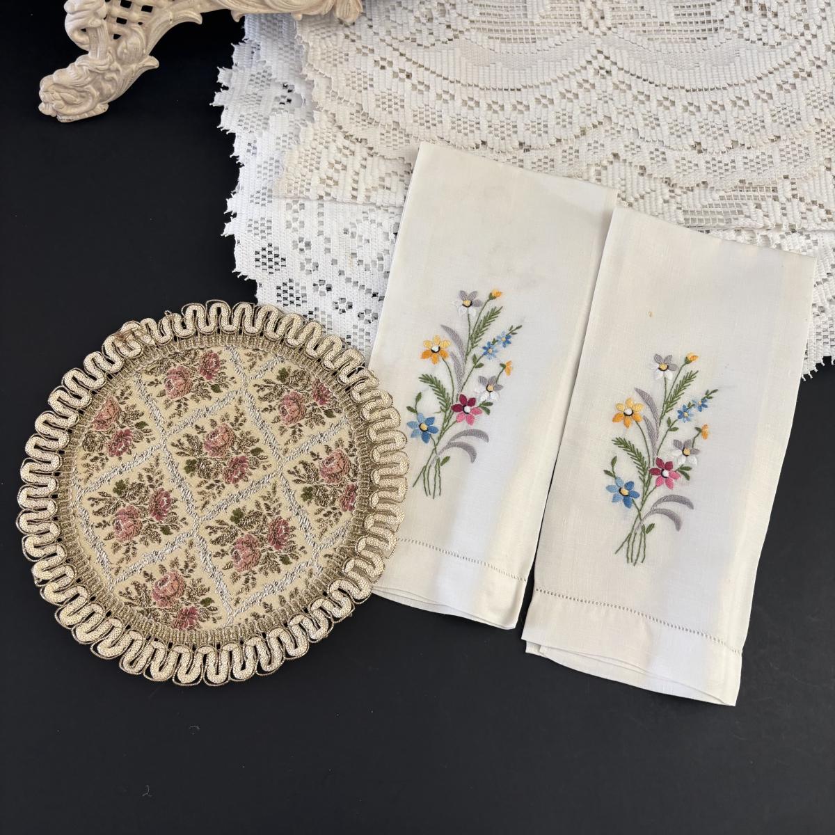 LOT 107: Shabby Chic Collection: Cast Iron Standing Vanity Mirror, Porcelain Trinket Dish, Brunswick Germany Dresser Tray, Royal Albert Teacup & Vintage Linens