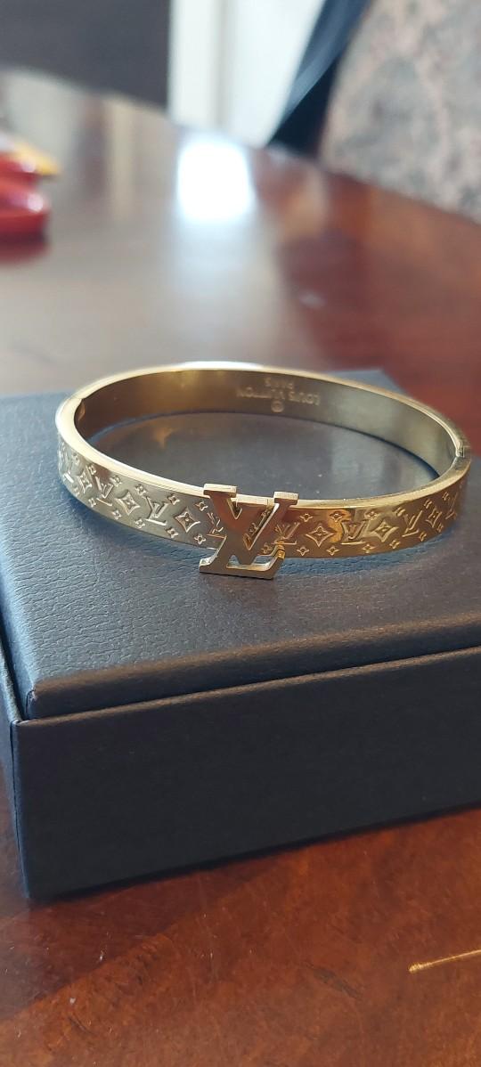 Louis Vuitton Nanogram Cuff bracelet. This popular piece of fashion jewelry features the iconic Monogram pattern painstakingly engraved on gold-tone brass.