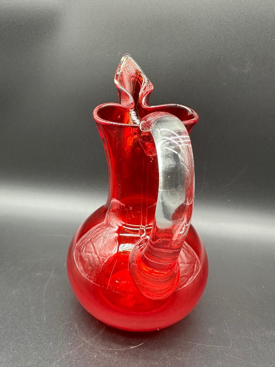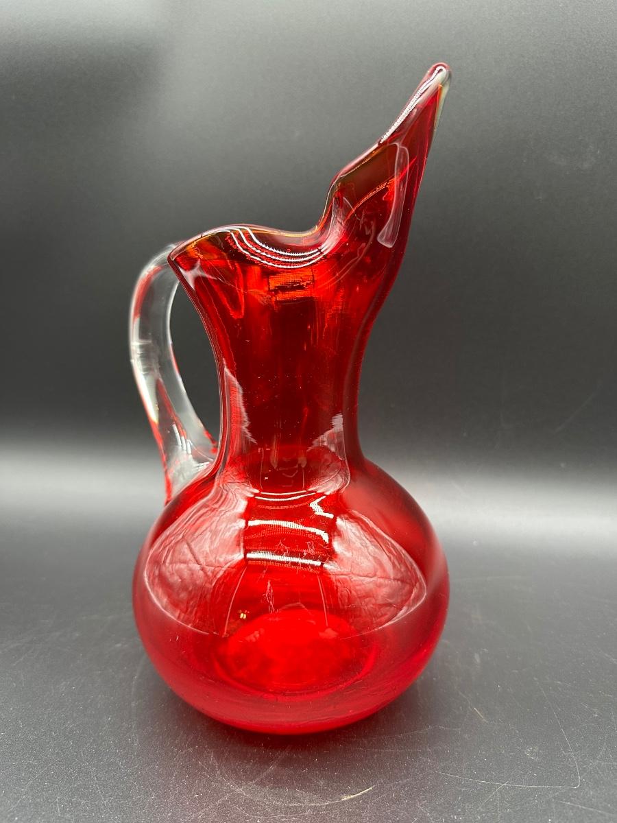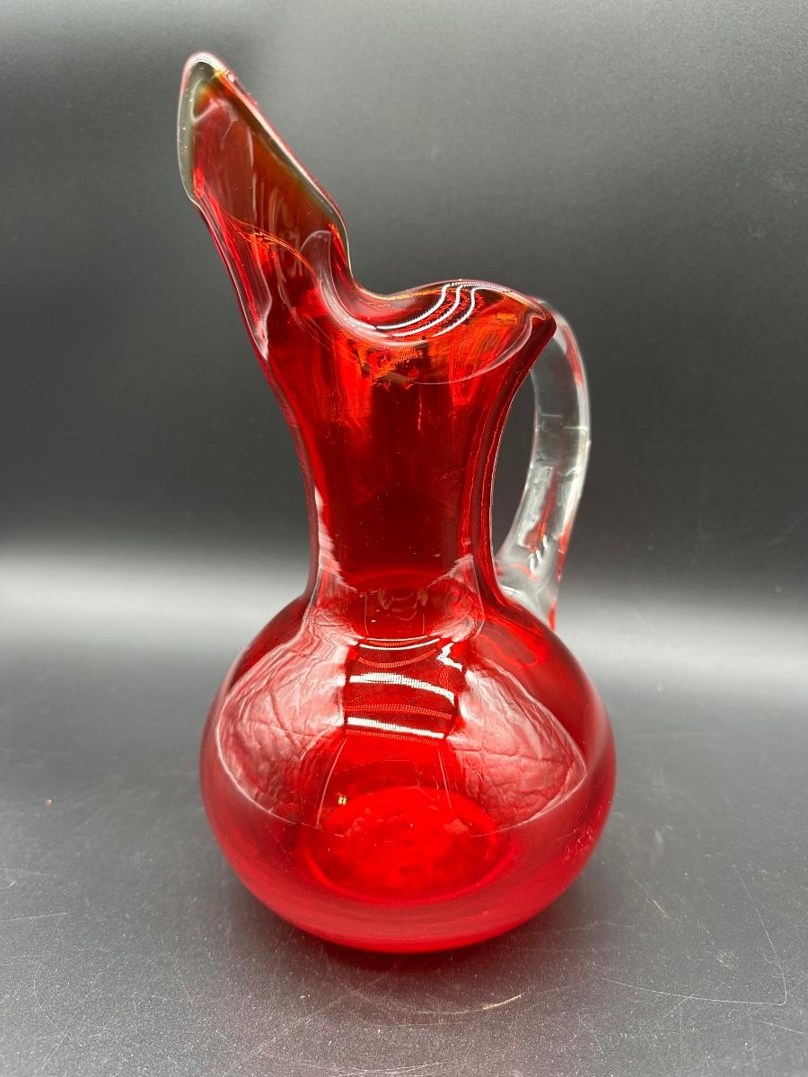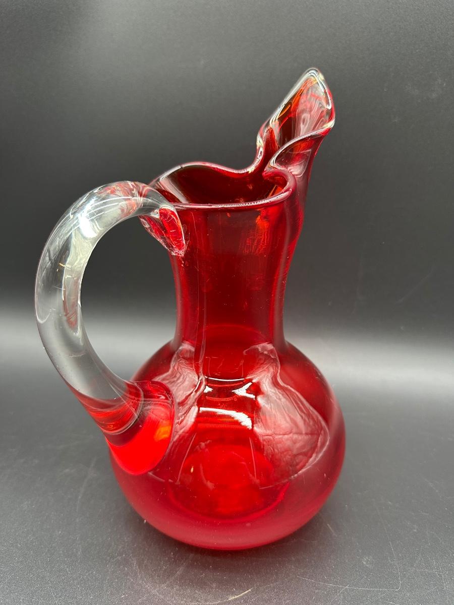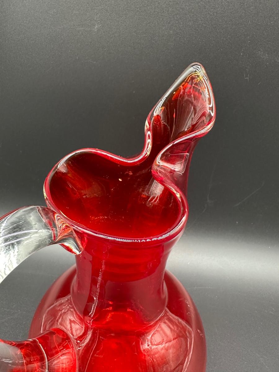 Mid Century Murano Style Ruby Red Art Glass Ewer Pitcher w/ Clear Handle – 10”