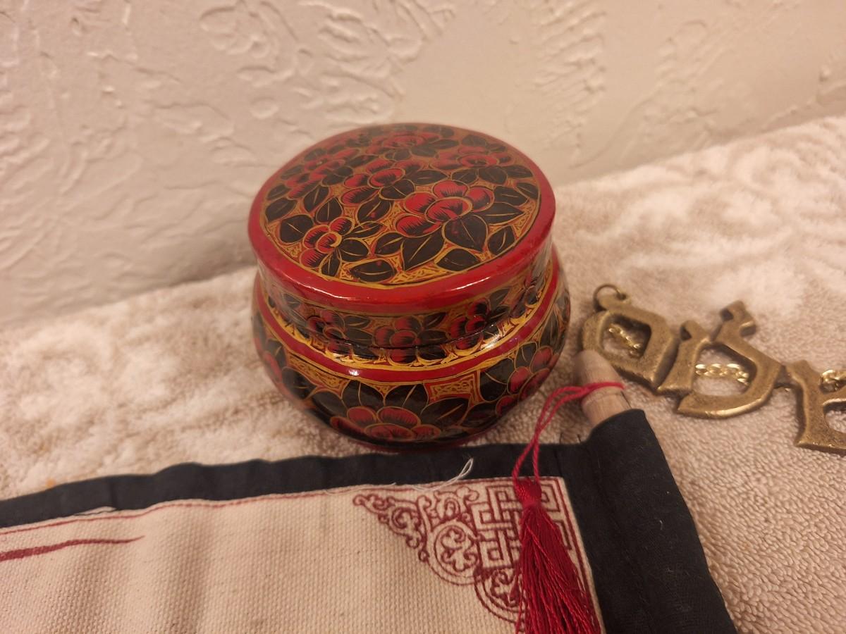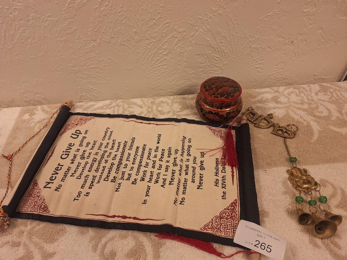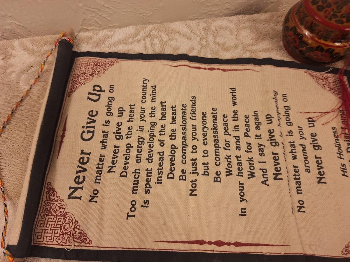 "Never Give Up" Dalai Lama quote scroll wall hanging, and trinket box