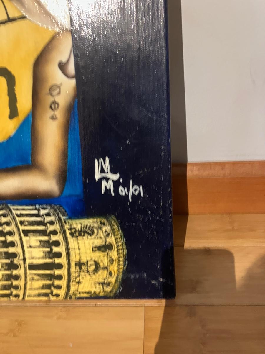Epic pair of original mixed media paintings on canvas by artist Maria Medina (signed on back with © symbol + front monogram). Both from 2001: left dated August 2001, right dated January 2001.