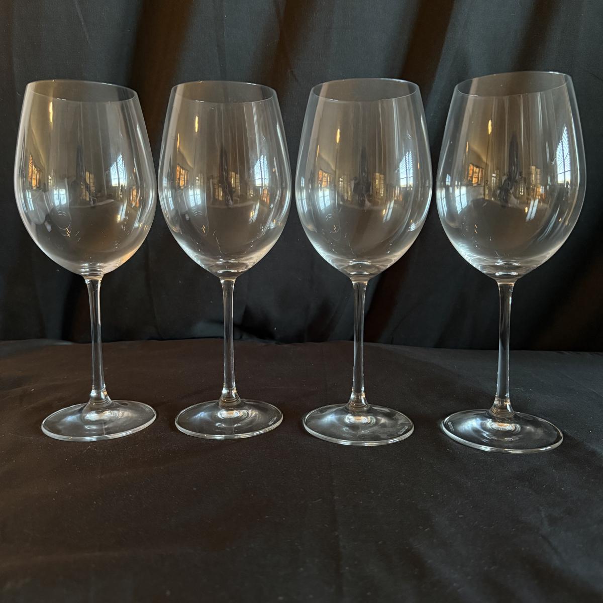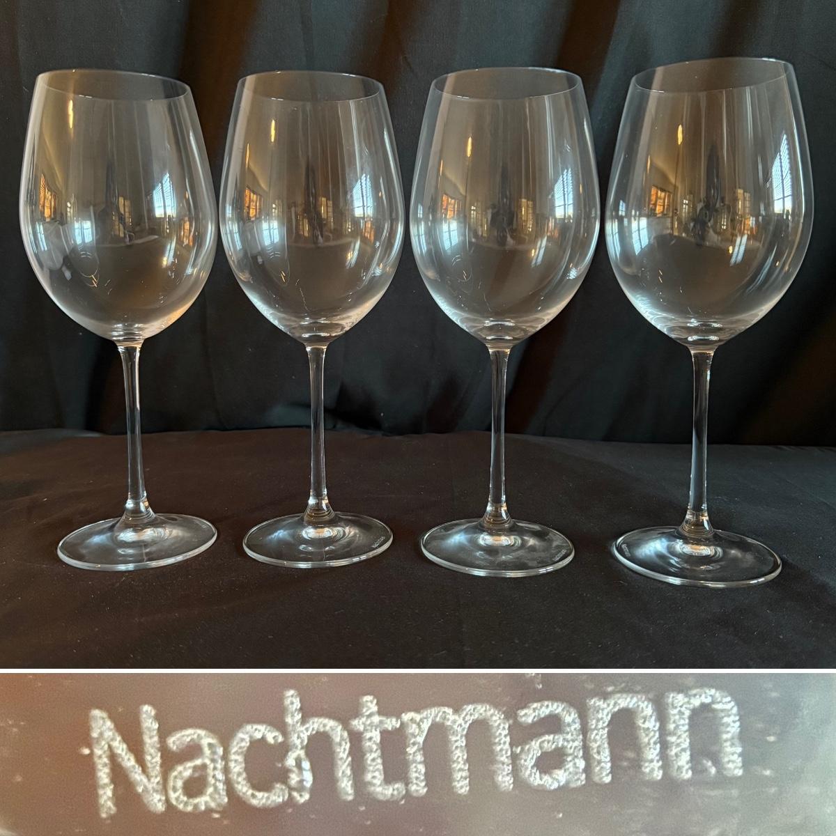 Tall slender stems hold crystal clear goblets enjoying your favorite wine. In this set of eight, each glass is 4.5"D x 10"H and has the Nachtmann company name etched in the edge of the base. See photos for details. Shipping available.