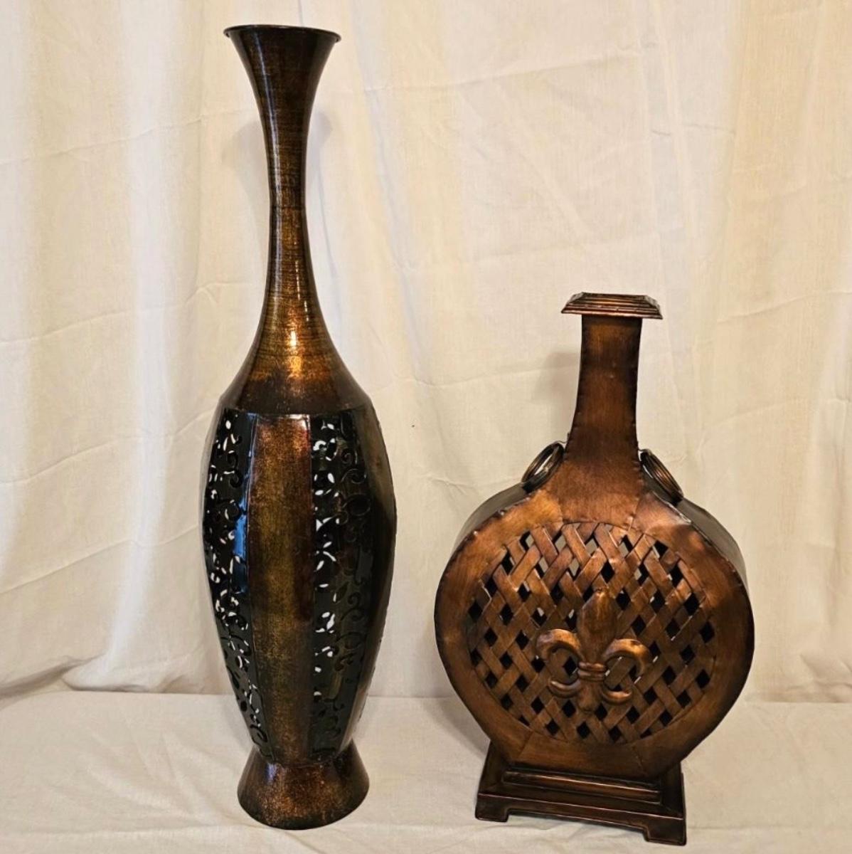 One tall and one short, these bronze-colored vases are great accent pieces. Taller item has octagonal shaped pierced body with flat base and flared neck. Measures 8"D x 31.5"H. The rounded piece with Kirkland’s tag is 12.5" x 6" x 22.5"H, has pierced body with fleur-de-lis medallions on sides and rings on neck. Both items appear to be finished tin construction. See photos for details.
