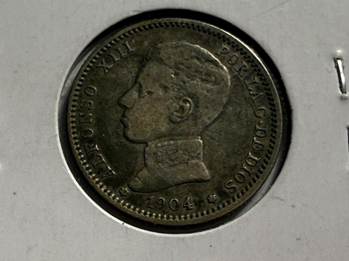 Spain 1904 19-Star Peseta Silver Coin VG/Fine Condition/Cleaned as Pictured. $5 DOMESTIC SHIPPING.