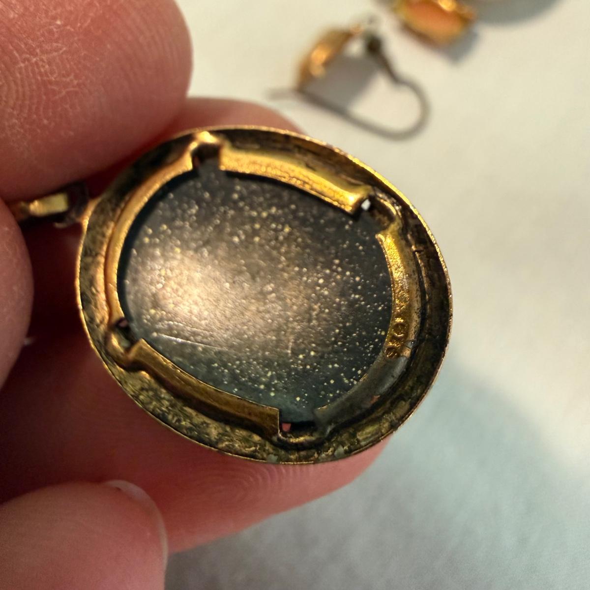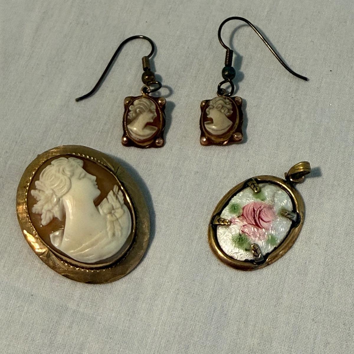 Two pieces of jewelry stamped with “sterling” that appear to be by local Asheville maker Stuart Nye. Also includes a cameo style brooch marked 1/20 12K GF. There are three necklaces, one ring, two pairs of earrings, a stretch bracelet and a pair of shoe clips. None of these pieces appear to have any markings. The gold tone necklace is the longest at approximately 18” long. The two pieces marked sterling are shown photographed together at the end of the carousel. Please see photos for details. All sales are final. No returns or refunds. Please bid accordingly. Shipping available