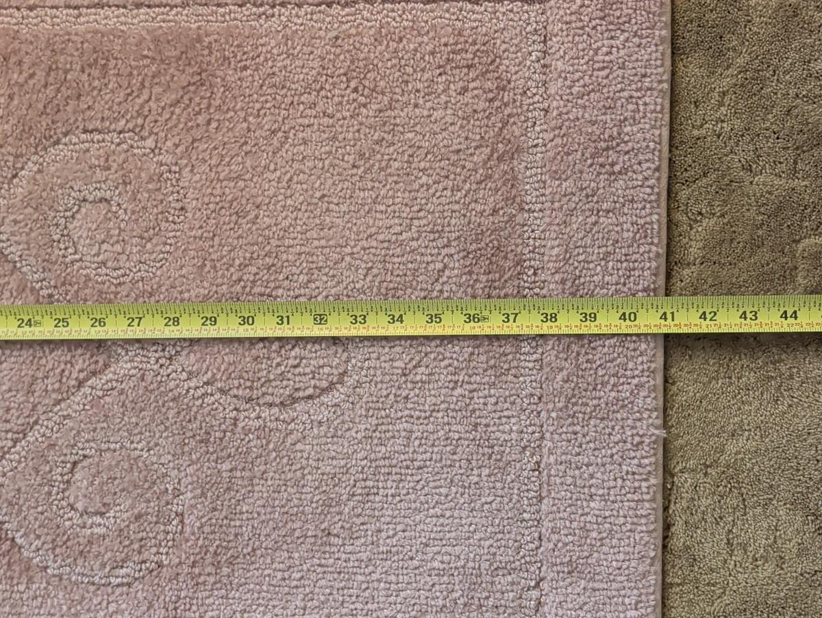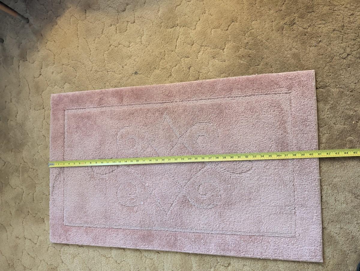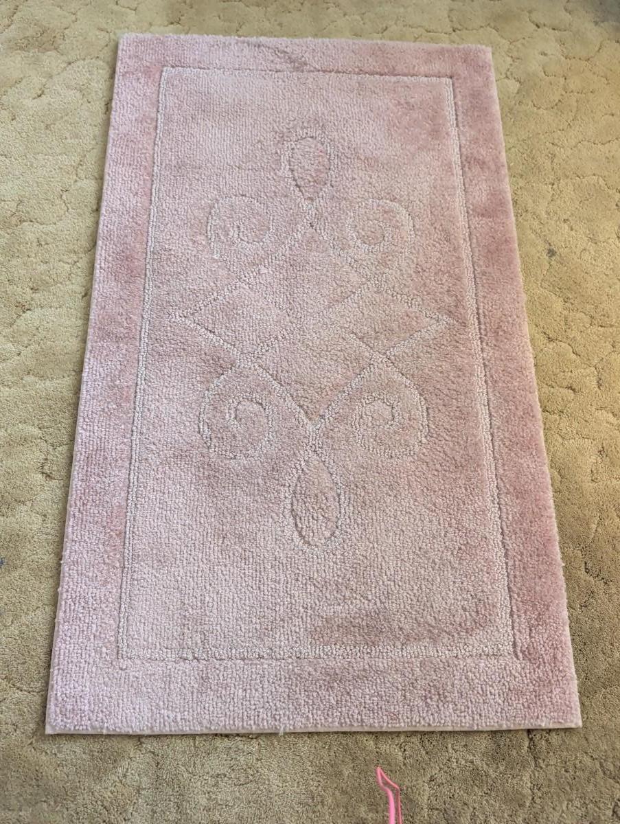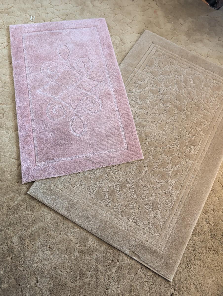 Two rugs with rubber backing, one pink, and one tan in color. In great condition.