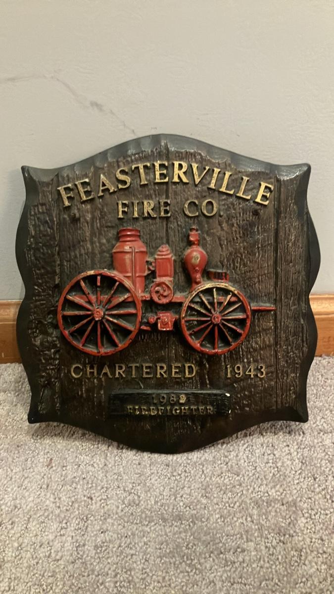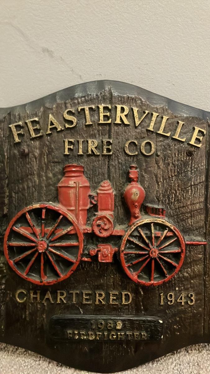 This nostalgic vintage-style wall plaque celebrates the Feasterville Fire Company in Bucks County, Pennsylvania—chartered in 1943—and includes a special tribute to a 1982 Firefighter (likely an award, recognition, or dedication piece). Expertly handcrafted from sturdy cast resin and painted in a deep black with a highly realistic wood-grain finish to resemble aged, textured wood, it showcases a prominent raised-relief antique steam fire pumper engine in vivid red and gold, along with crisp raised lettering for the company name, charter year, and commemorative details.