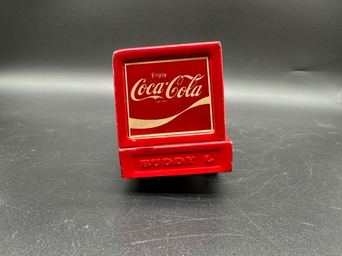 This is a pressed steel toy truck with plastic wheels and Coca-Cola advertising graphics. The underside is clearly marked BUDDY L JAPAN, making this a later production Buddy L piece rather than early USA manufacture.