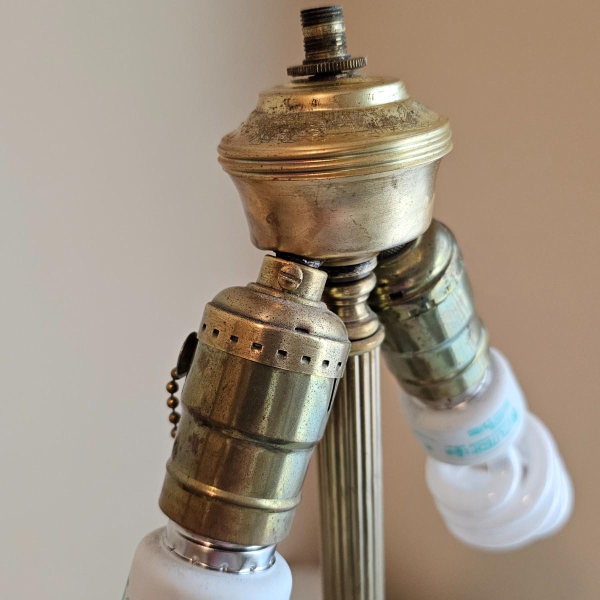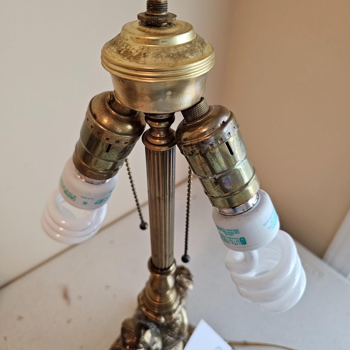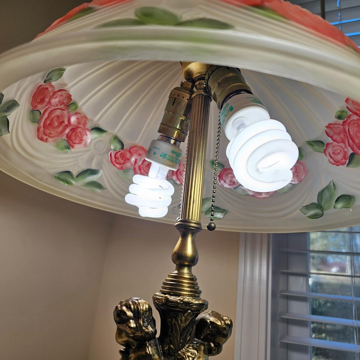 This is a vintage-style metal table lamp with a reverse handpainted frosted glass shade featuring a rose motif and a cherub-adorned base. The approximate measurements of the base are 6.5"D and the shade is 14.5"D. The lamp stands at 22"H. There are two individually controlled pull chain sockets. Lamp powered on when plugged in.