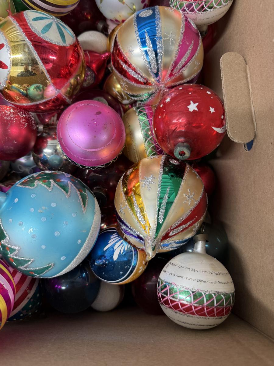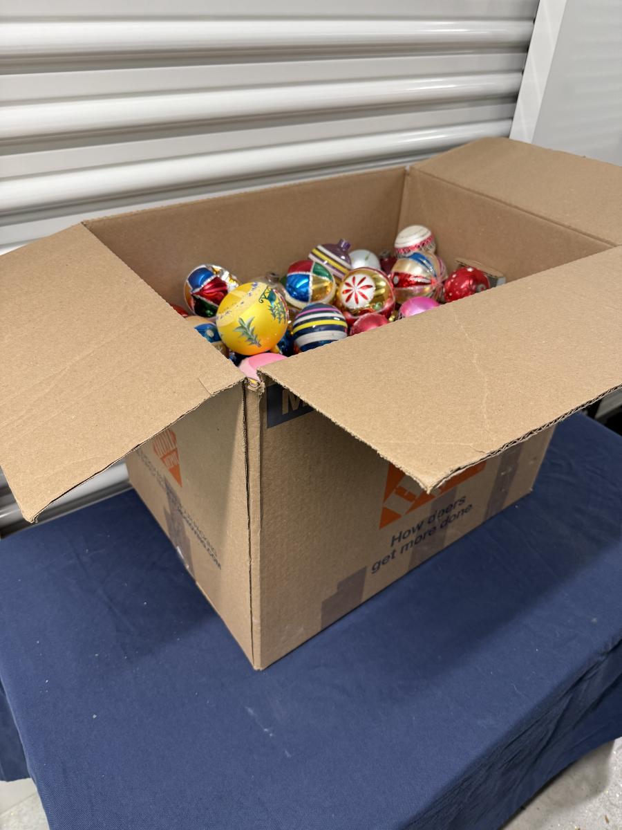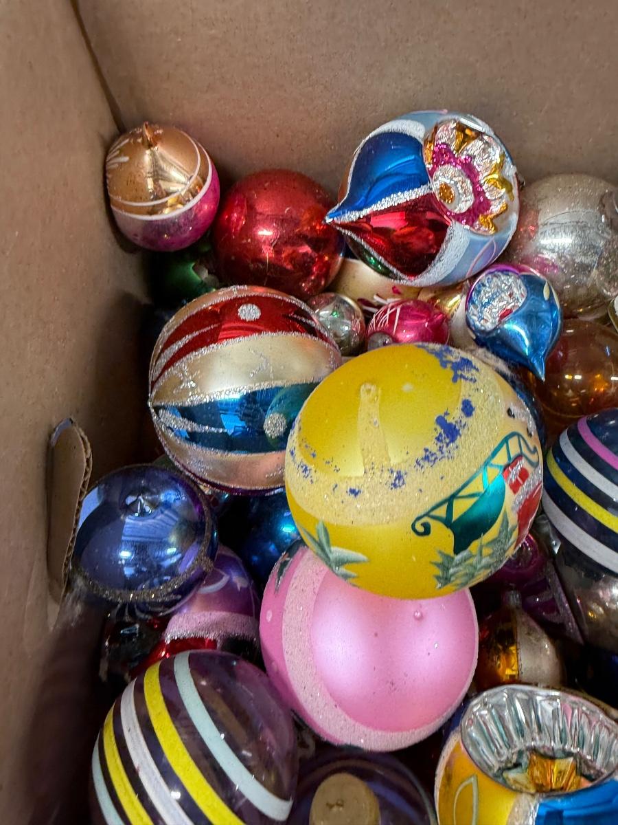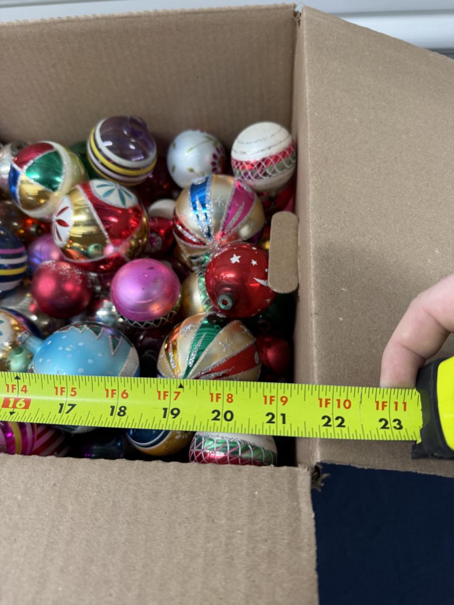 The first 1/4 of the box is filled with tissue paper. The rest of the box is all vintage balls.