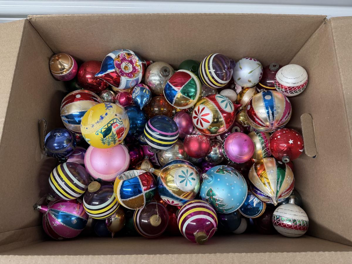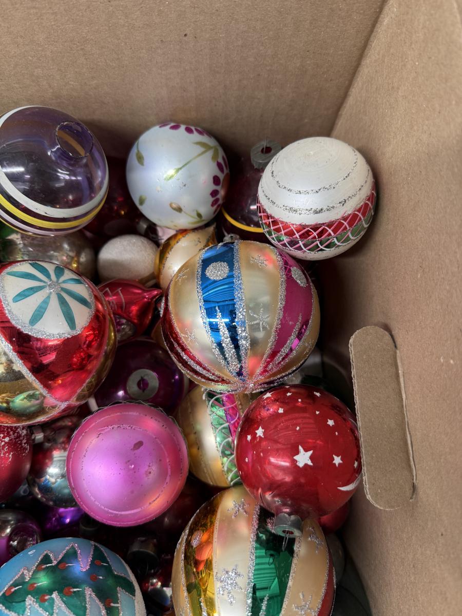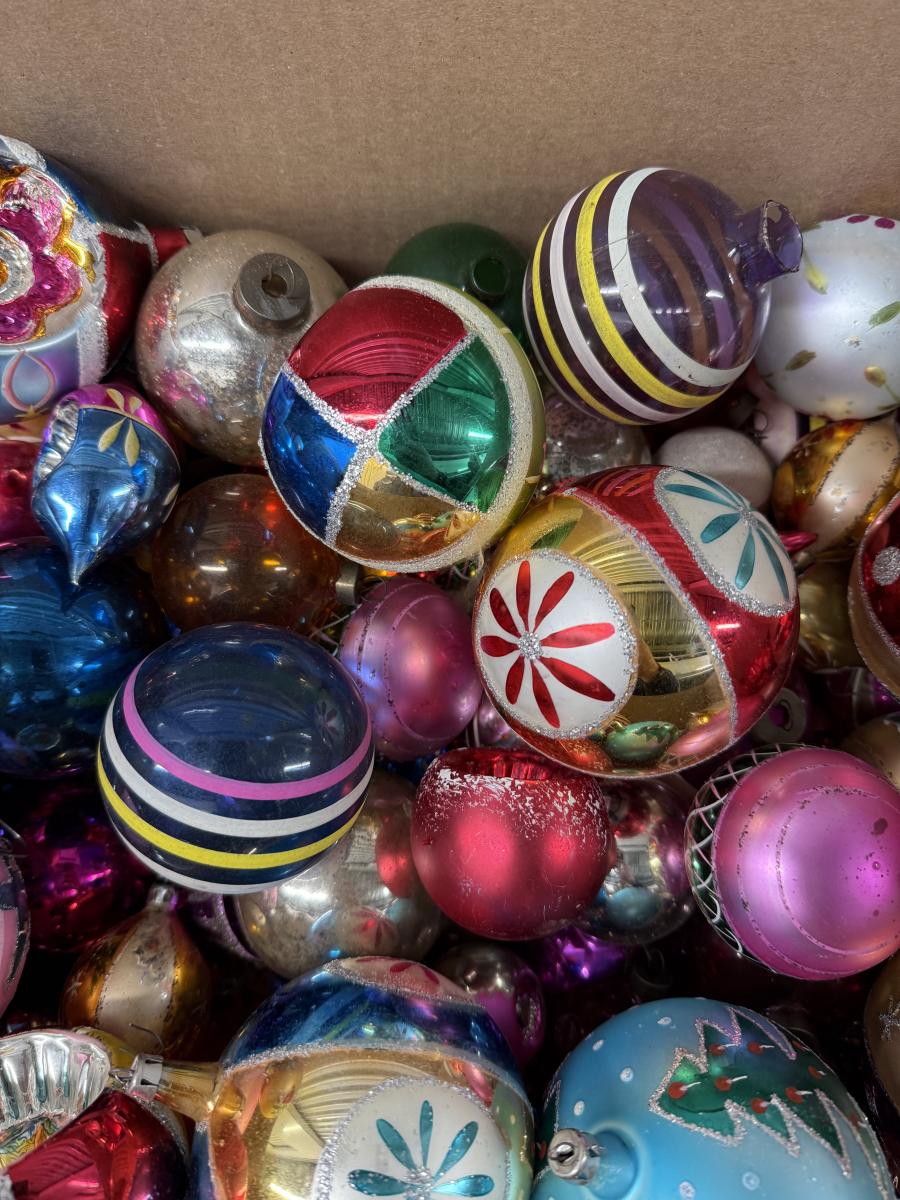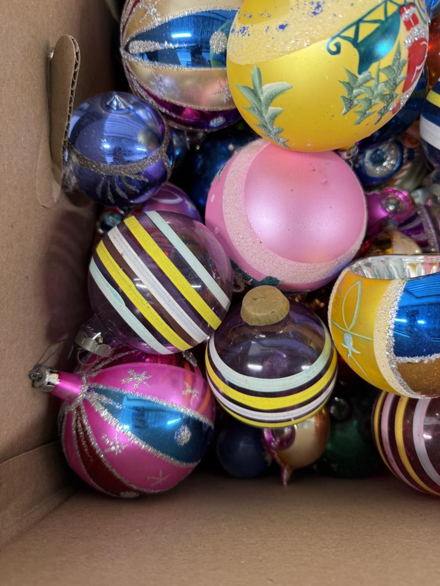 The first 1/4 of the box is filled with tissue paper. The rest of the box is all vintage balls.