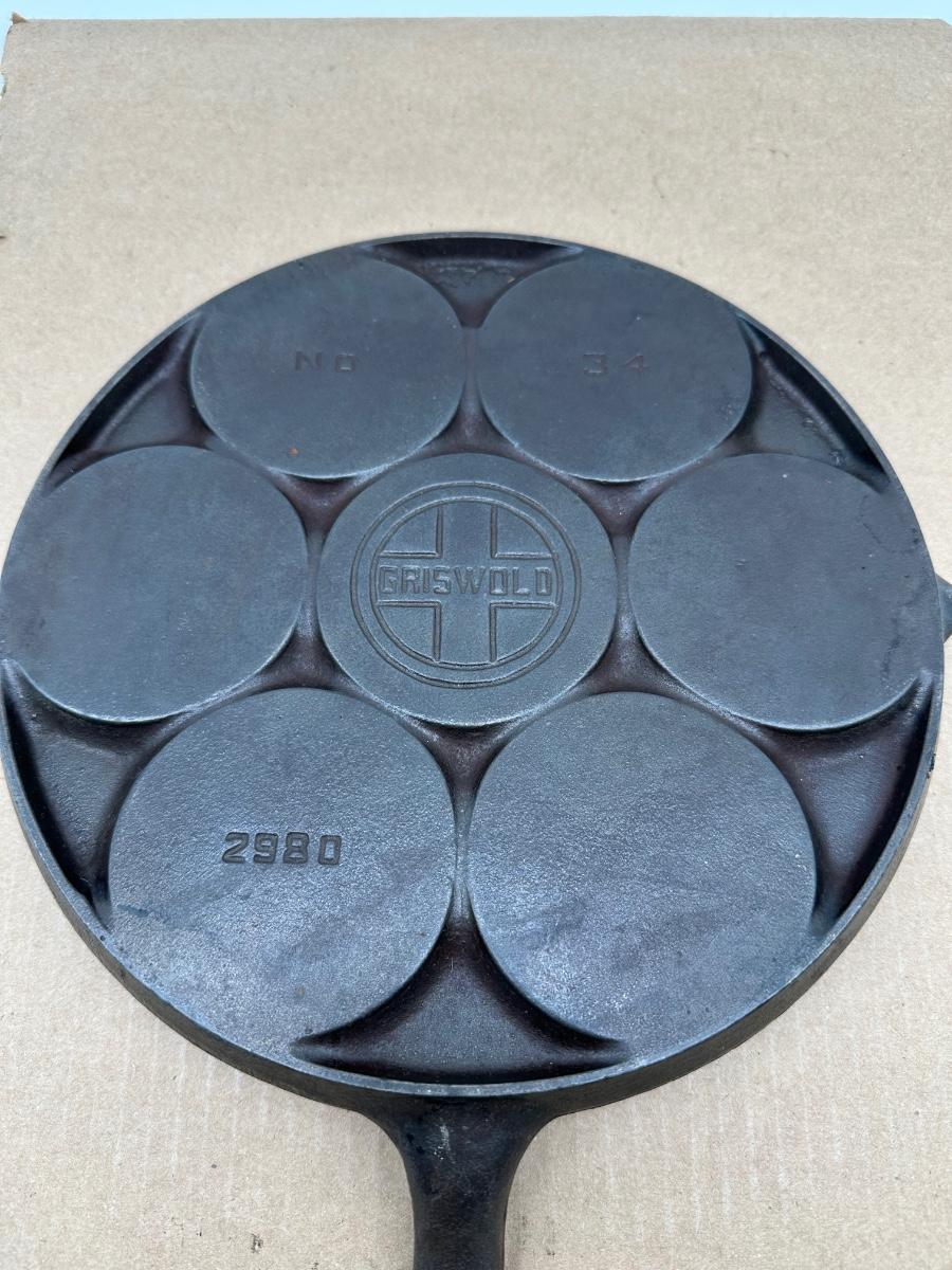 Authentic vintage Griswold cast iron No. 34 pan, model 2980, featuring 7 round wells. Classic aebleskiver / gem / muffin style pan with the large block Griswold cross logo on the back. Smooth cooking surfaces with even wear, no cracks or repairs observed. Excellent collectible and fully usable cookware.