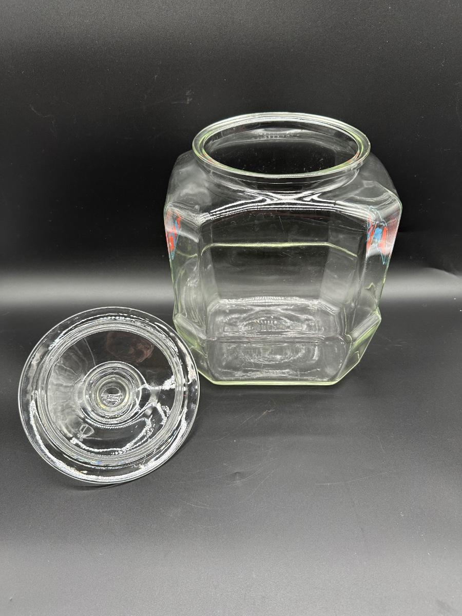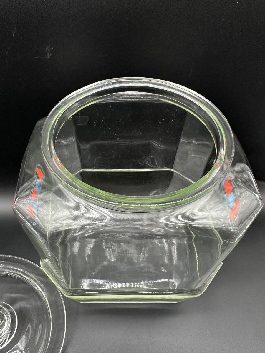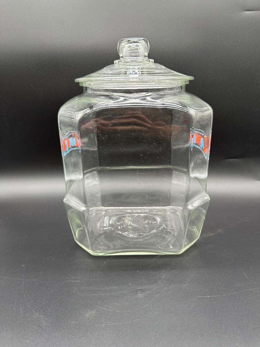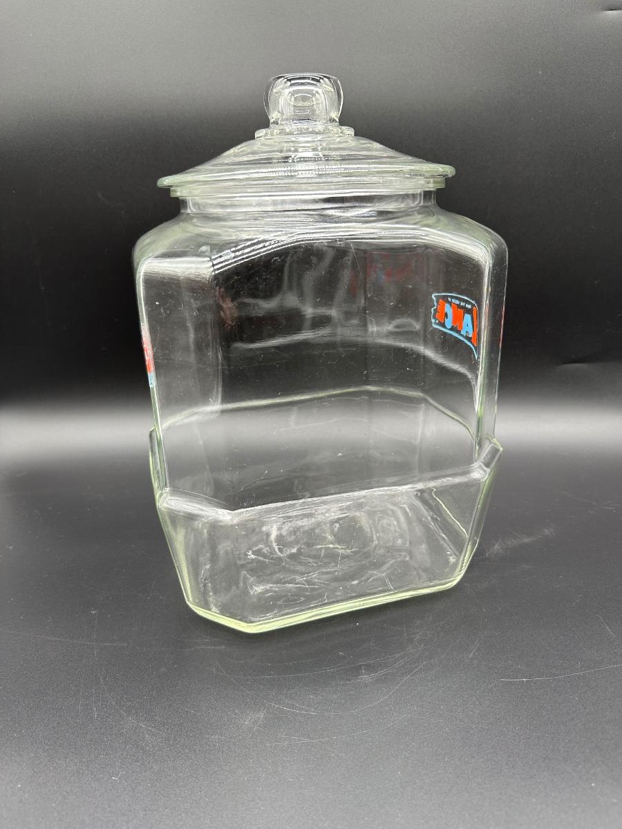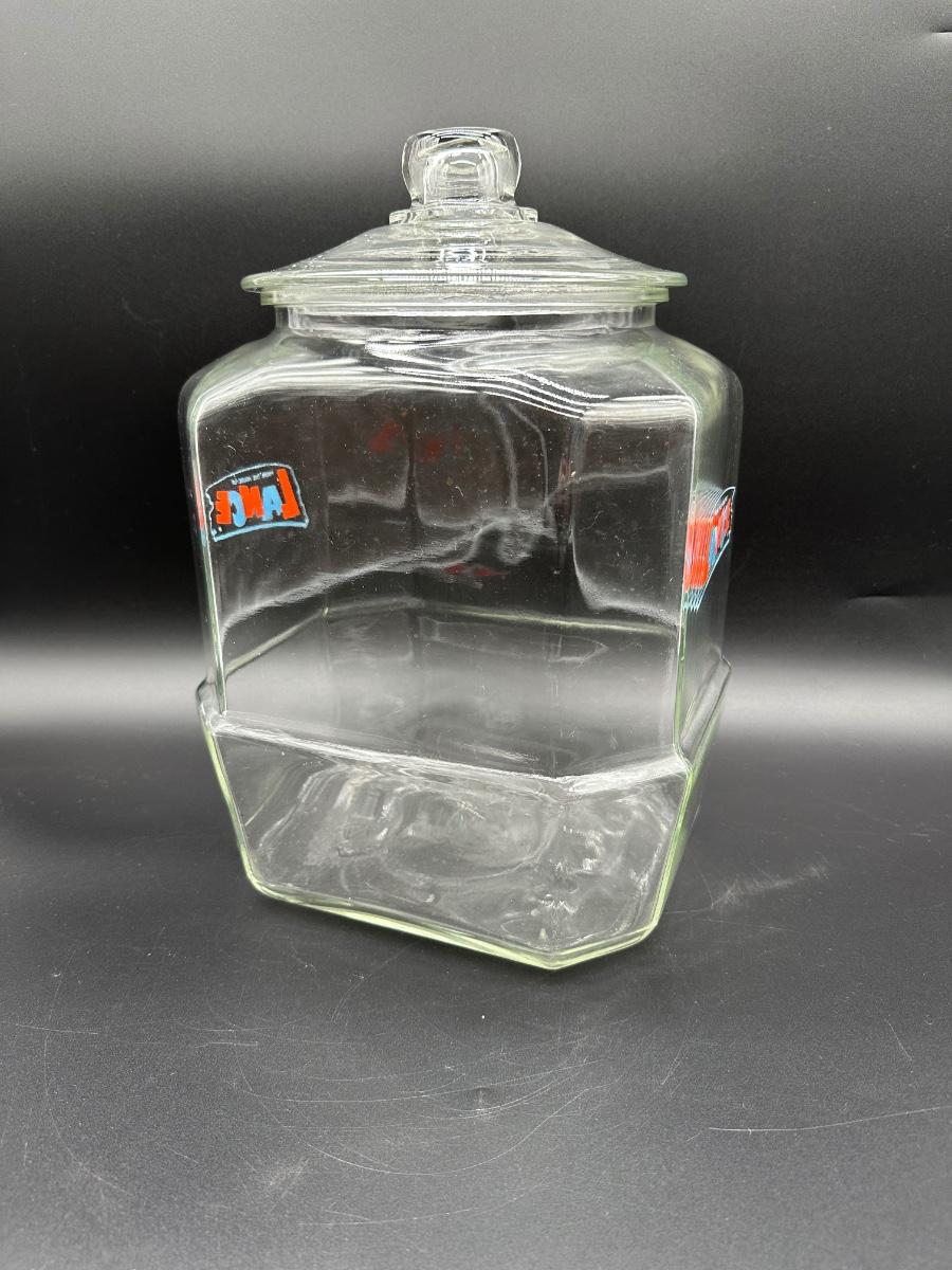 This heavy clear glass jar was used in general stores, gas stations, and grocery counters to display Lance peanuts and crackers. Features a multi-paneled design with original painted logo graphics on opposing sides and the original matching glass lid.