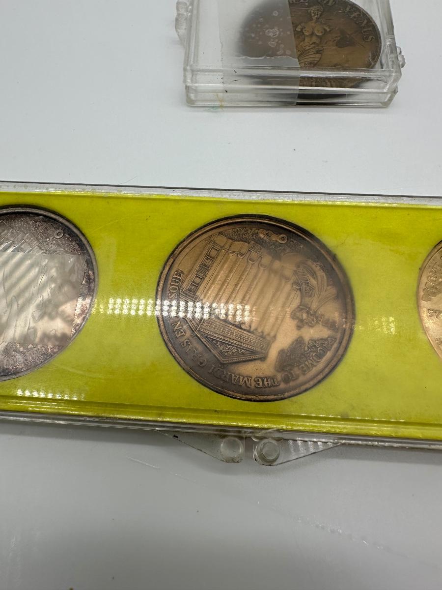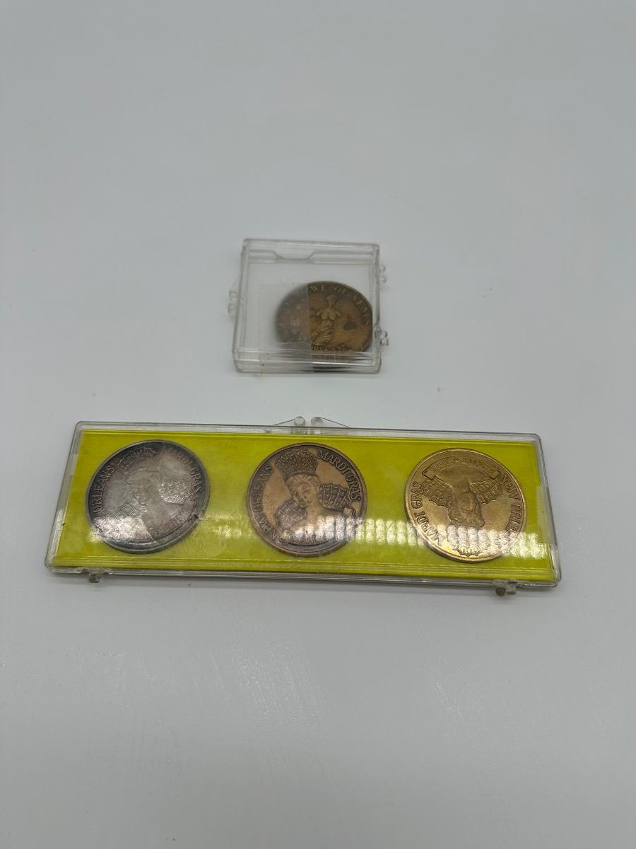 Lot of 4 vintage metal Mardi Gras doubloons from New Orleans, featuring classic Rex / Mardi Gras themes. Includes three doubloons in a display strip and one individual doubloon in a plastic case. Nice mix of patina and detail