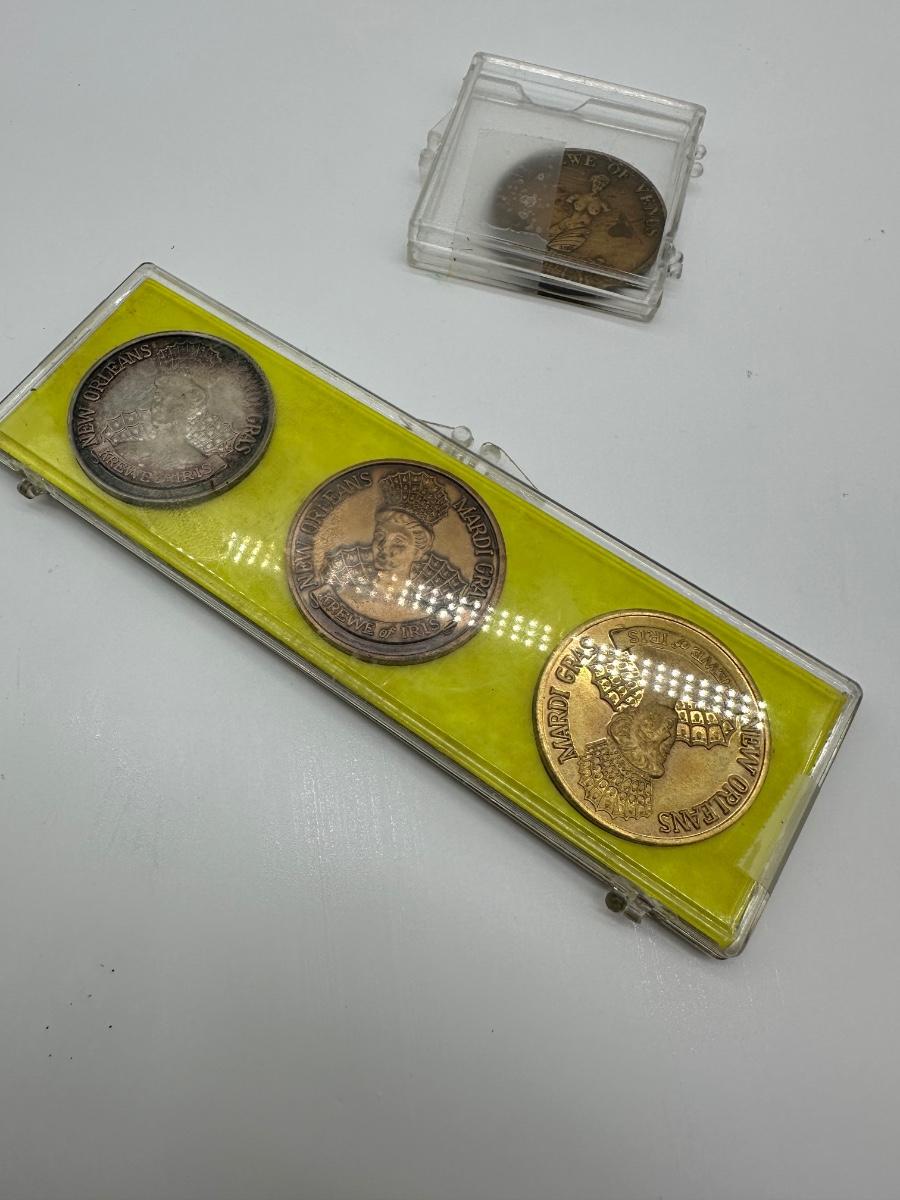 Vintage New Orleans Mardi Gras Doubloons – 4 Metal Coin Lot in Display Cases