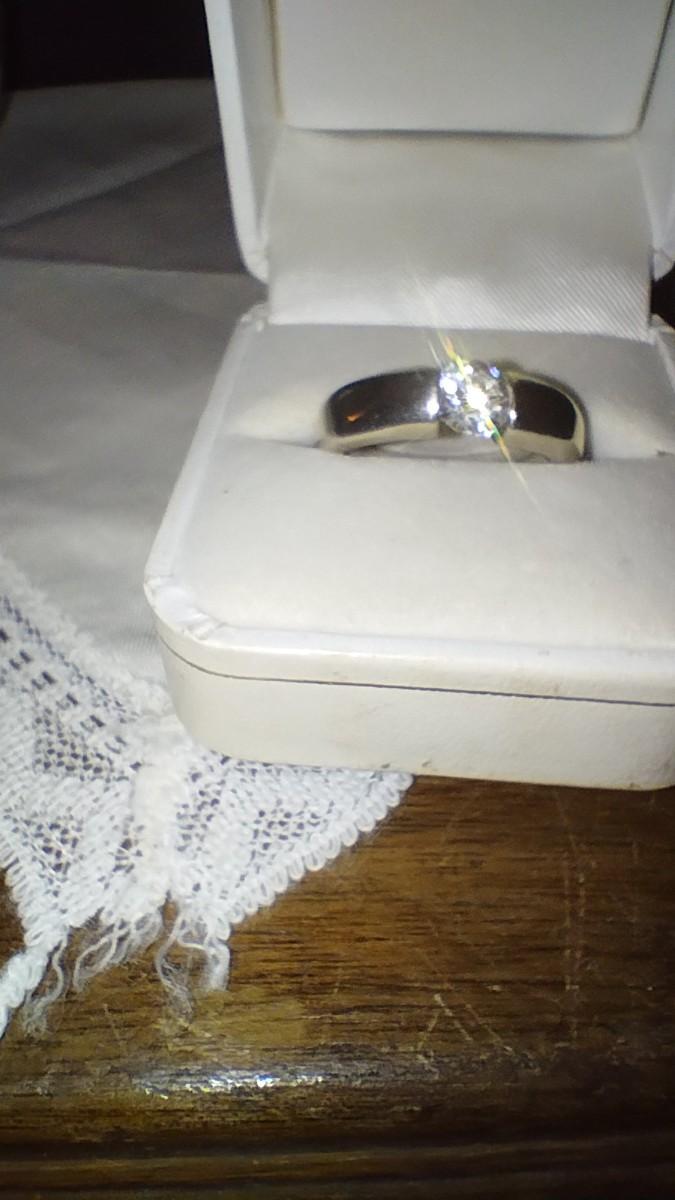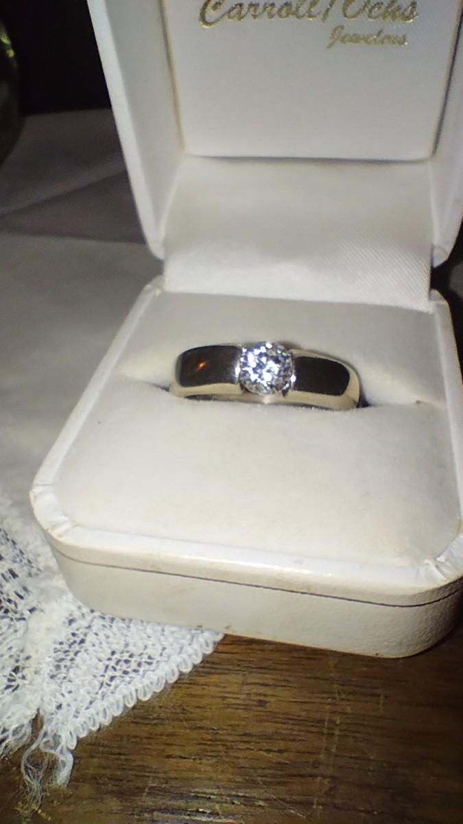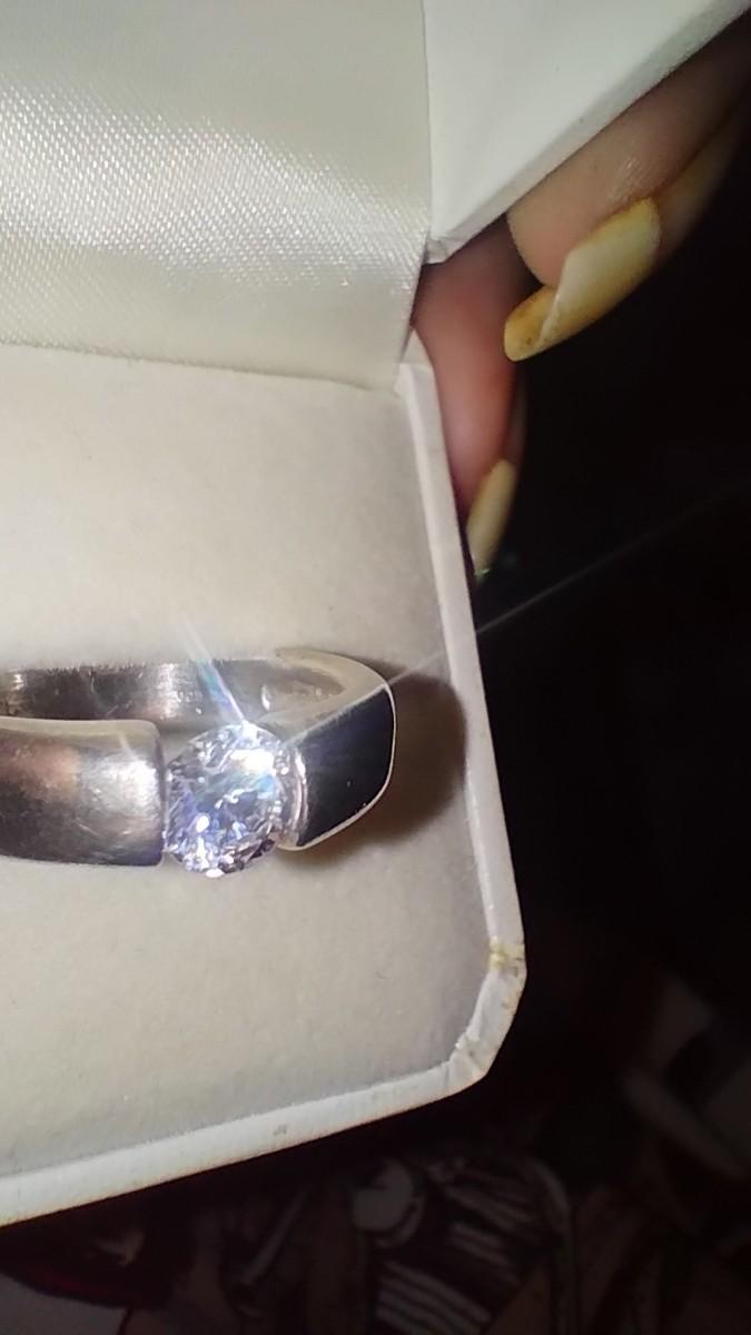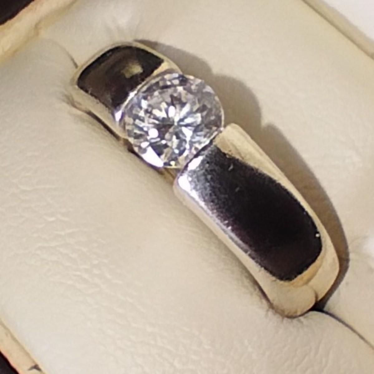 Stone is held in the ring by the tension of the 2 sides. It is a near perfect Cubic Zirconia in Gold washed Sterling Silver. This is a fantastic hard to find ring.