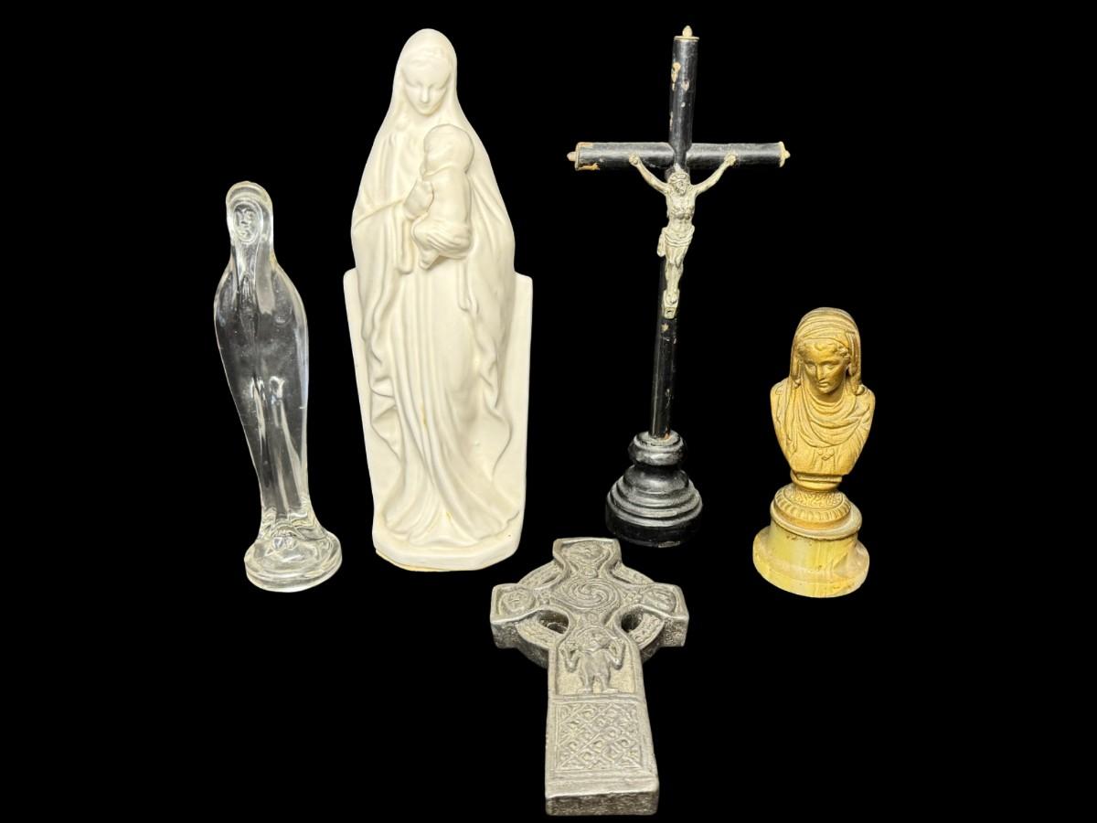 Includes a Virgin Mary bust, a cross, a crucifix, and more. Total of five pieces. Measurement of largest: 10.5”H (crucifix). [BK]