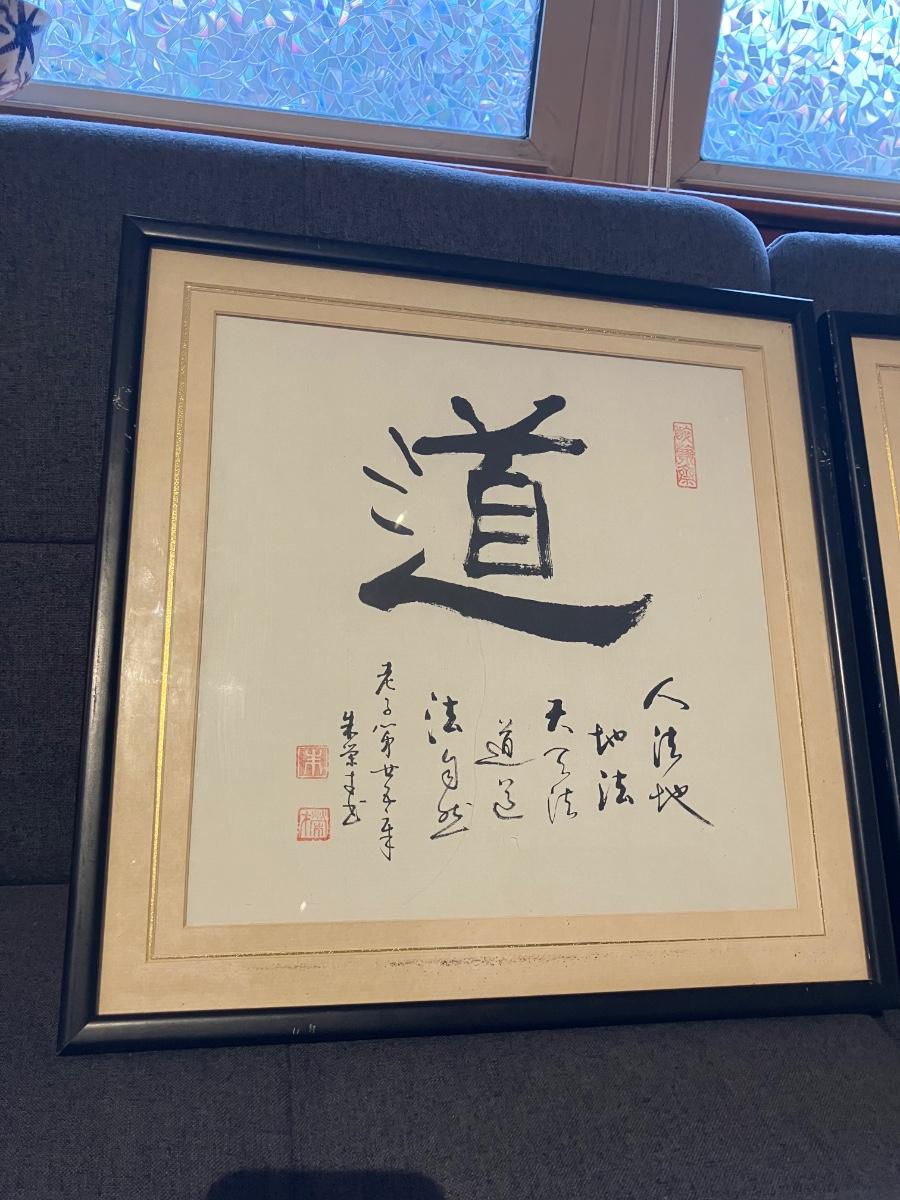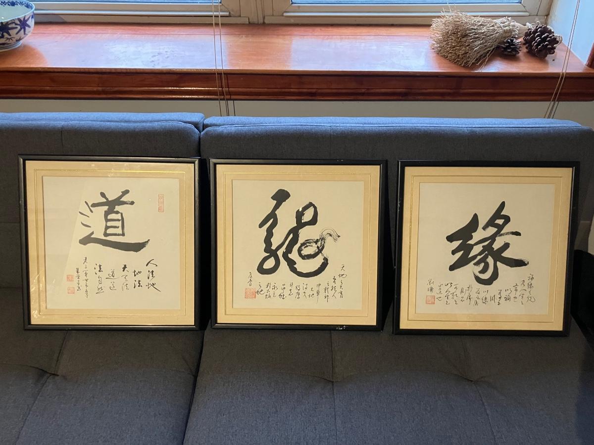 Vintage Set of 3 Framed Chinese Calligraphy Art Pieces - Dao (Way), Horse Illustration, Yuan (Fate)