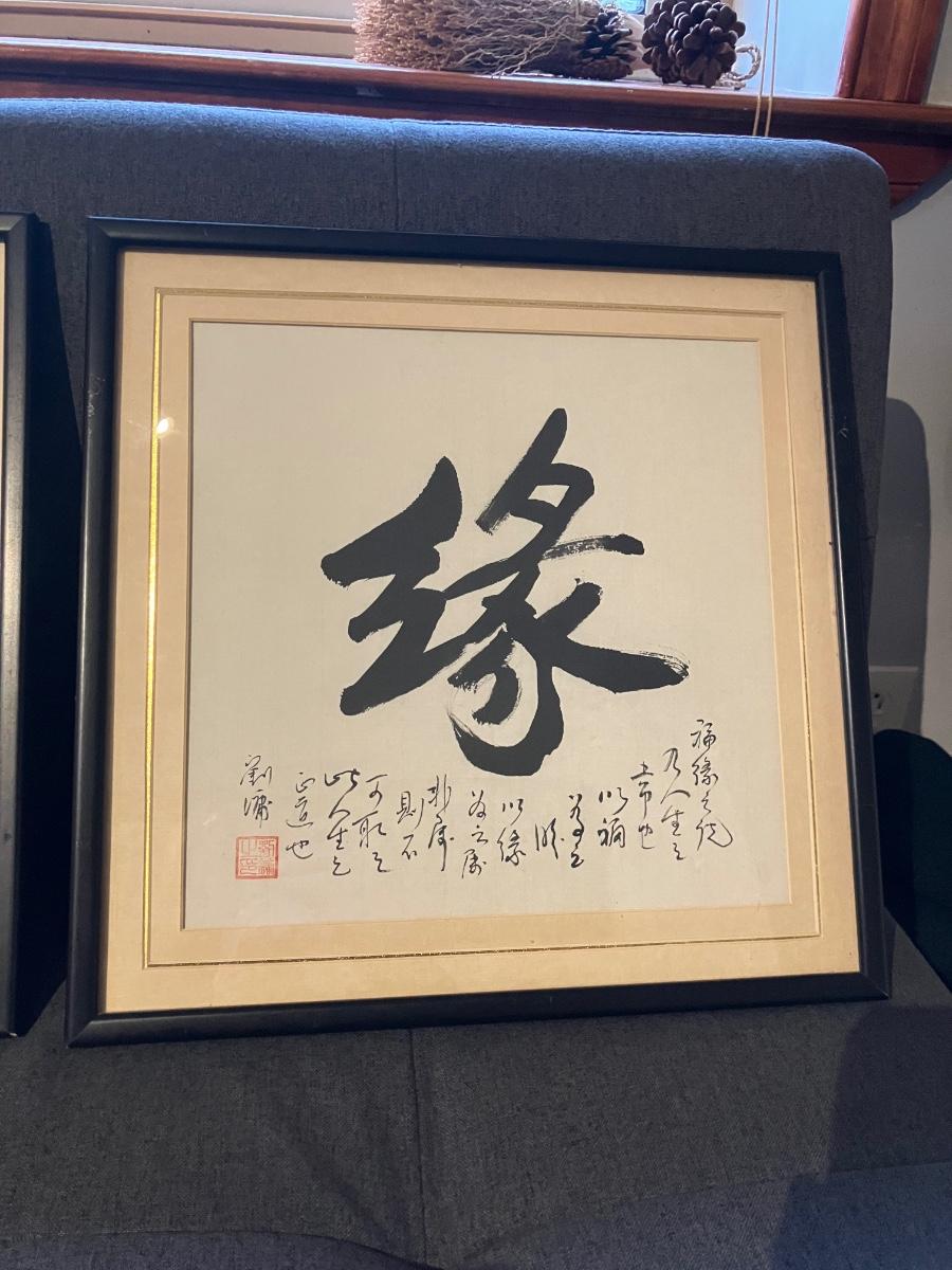 Professionally double-matted and framed in black wood with gold accents and glass (approx. 11" × 11.5" artwork each). Excellent ink condition; frames have some vintage scratches/paint loss, one mat has minor bottom scuffs — adds character! Perfect for Zen, minimalist, or Asian-inspired home decor.