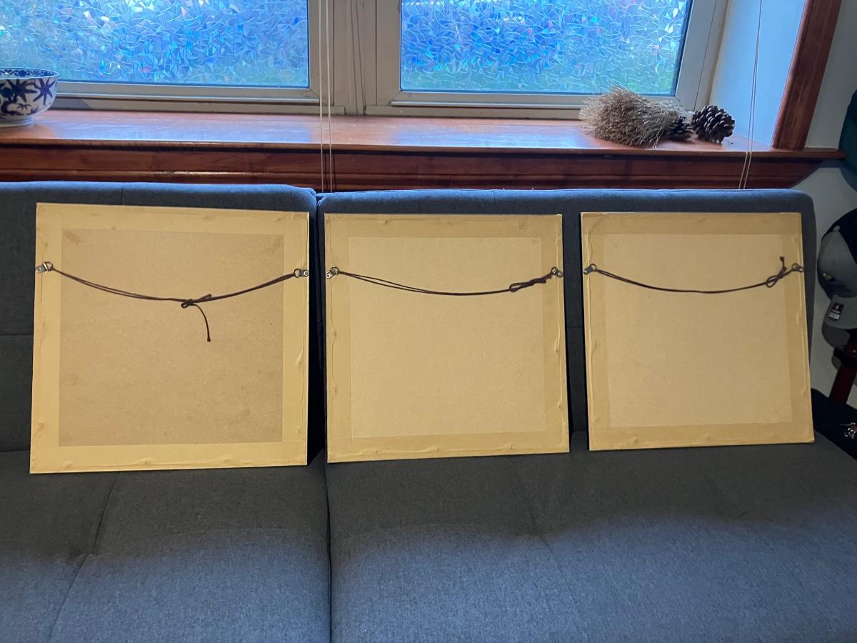 Beautiful vintage matching trio of Chinese brush ink calligraphy works, each featuring a large bold philosophical character with side inscriptions and authentic red artist seals.