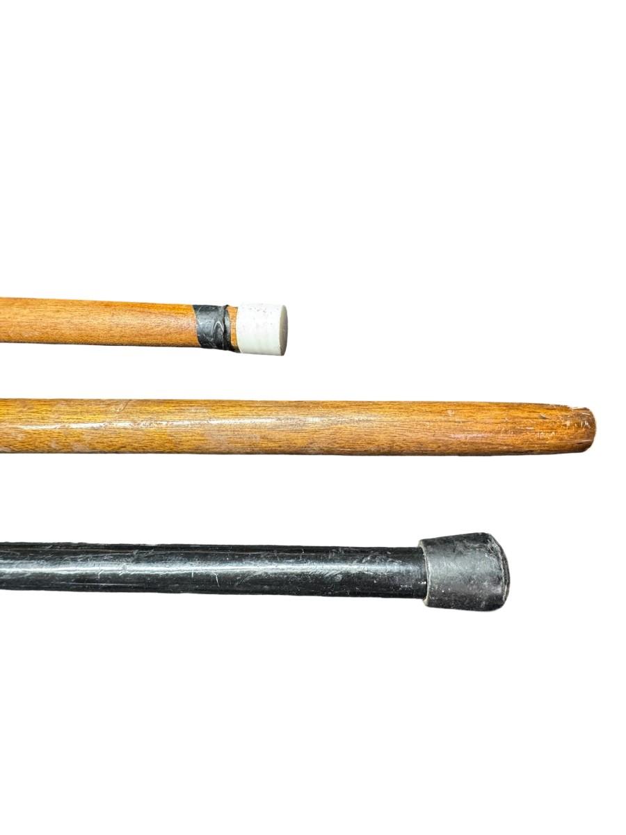 Includes three vintage canes. All three have stag pommels. Two have highly polished pommels, and one is raw antler. They are most likely made of ash wood. Measurement of longest: 39”. [PT]